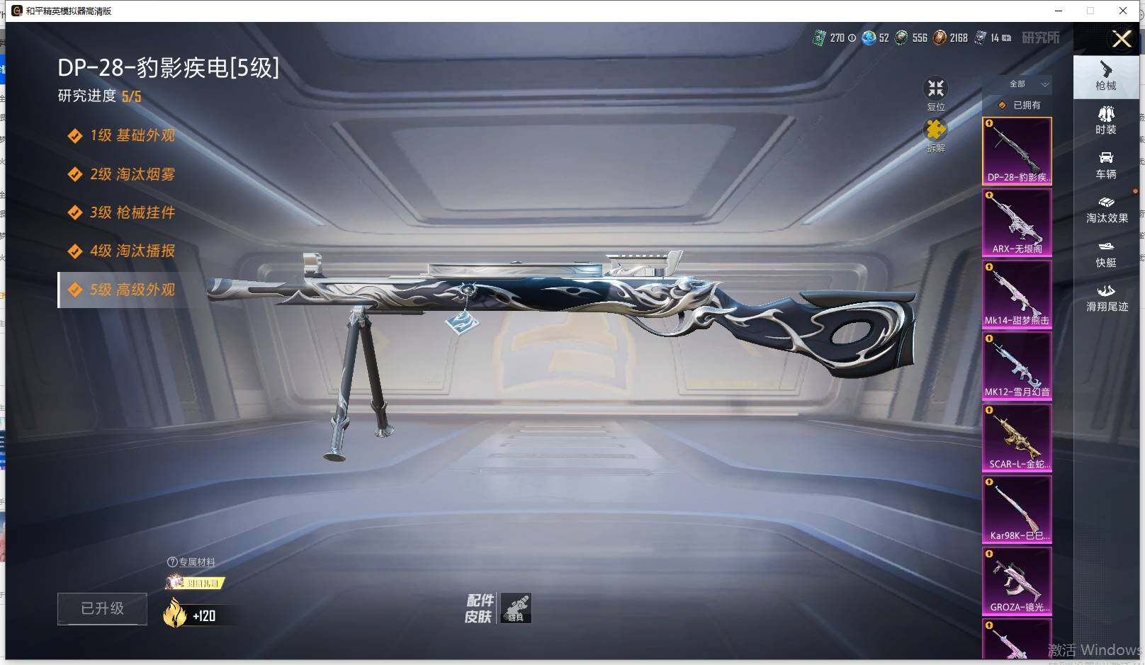 【粉色枪皮等级】:SCAR-L-金蛇镇世(三级),M416-电玩时刻(五级),GROZA-镜光银凌(五级),AUG-超新星(七级),ARX-无垠阁(六级),Kar98K-巳巳如意(五级),Mk14-甜梦熊击(五级),MK12-雪月幻音(五级),DP-28-豹影疾电(五级),MG3-洛神天依(七级)