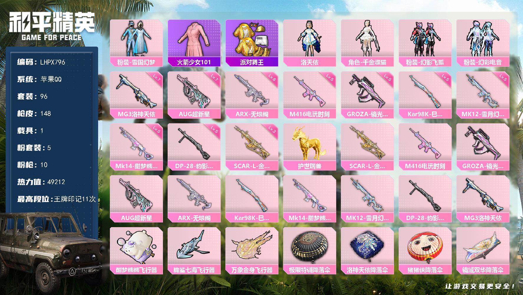 [16145879]可二次【特价出售/店主推荐】苹果 手Q-5粉装-10特效枪-1载具-4粉色飞行器-49212热力值-11王牌印记-96套装-148枪皮