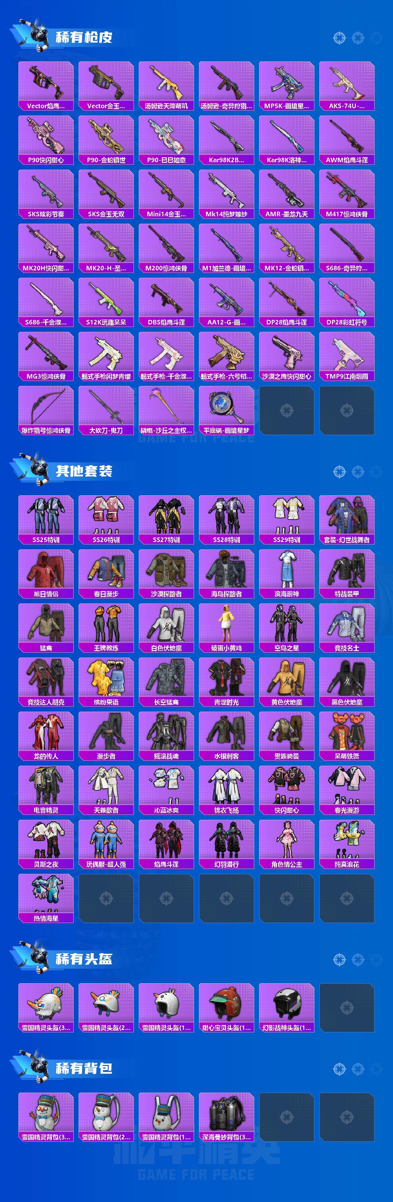 【稀有枪皮】:AUG-冰晶雪宝,AKM-霓虹街区,M16A4-幻世战舞者,M16A4-千金淑猫,M416-糯团青竹,AUG-2P战斗服款,AUG-甜蜜菠萝,AUG-金蛇镇世,QBZ-洛神天依,M762-奇异狩猎者,Mk47-洛神天依,AC-VAL-快闪甜心,蜜獾-天降萌叽,ACE32-画境星梦,UZI-啾咪啾咪,UZI-金玉无双,UZI-幻影飞狐,UMP45-春暖花开,UMP45-金玉无双,Vector-焰鹰斗篷,Vector-金玉无双,汤姆逊-天降萌叽,汤姆逊-奇异狩猎者,MP5K-画境星梦,AKS-74U-鬼刀,P90-快闪甜心,P90-金蛇镇世,P90-巳