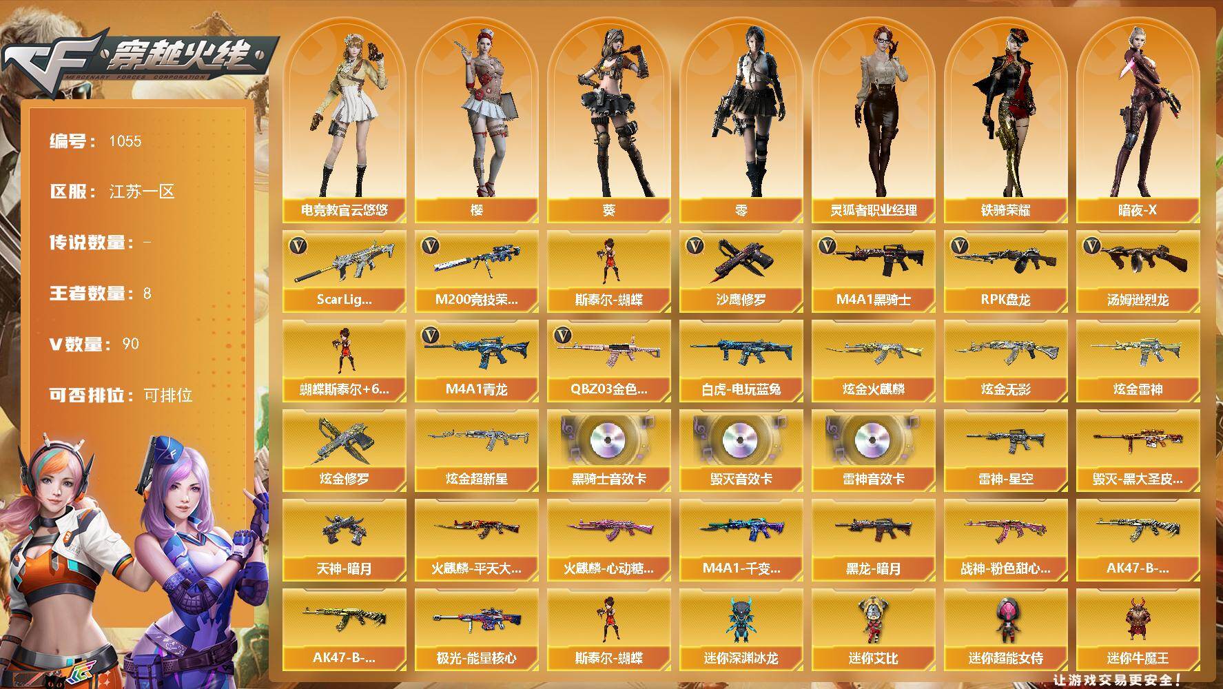 [16167387]江苏一区-90V-8王者-5炫金 【热门武器】:QBZ03-金色蔷薇,Scar Light-白虎,M4A1-青龙,M200-竞技荣光,白虎-电玩蓝兔,M4A1-黑骑士*5,汤姆逊-烈龙*6,RPK-盘龙*6,斯泰尔-蝴蝶,沙鹰-修罗*7 【王者炫金武器】:炫金火麒麟,炫金无影,炫金雷神,炫金超新星,炫金修罗 【音效卡】:M4A1-雷神音效卡,M4A1-黑骑士音效卡,Barrett-毁灭音效卡 【皮肤】:雷神-星空,火麒麟-平天大圣,火麒麟-心动糖果,毁灭-黑大圣皮肤,M4A1-千变-孔明皮肤,黑龙-暗月,战神-粉色甜心皮肤,AK47-B-常胜将军-刘备*4,AK47-B-常胜将军-孙权*2,极光-能量核心,天神-暗月 【角色】:零,葵,樱,电竞教官-云悠悠,暗夜-X,嘉年华灵狐,娟娟,灵狐者-黄金海岸,灵狐者-职业经理,曼陀罗-X,邱刚敖,斯沃特-X,铁骑荣耀,雪莉杨,雪莉杨-摸金校尉 【人偶武器】:斯泰尔-蝴蝶,迷你深渊冰龙,迷你牛魔王,夺魂,迷你牛牛*2,迷你生化手雷,深渊终结者手雷*2,闪光弹-貂蝉,高爆手雷-大乔,迷你艾比,迷你超能女侍,灵狐娃娃手雷 【暴走生化】:超级对讲机 【挑战大师】:暴君乱世-超越Max,神圣爆裂者III,冰龙粉碎者-白马银枪,VEPR-12-金魔,激光毁灭者III,神圣爆裂者-末日III*2,阐释者III 【英雄级武器】:M4A1-千变,AK47-火麒麟*2,M4A1-黑龙,M4A1-雷神,M4A1-黑骑士*5,AK47-黑武士,AK12-天启,M4A1-武圣,AK47-机械迷城,M4A1-青龙,Scar Light-白虎,无影-神兵利器,M4A1-玫瑰精灵,QBZ03-金色蔷薇,AK-47-猩红传说,AK47-B-战神,王者火魄-觉醒版,黑骑士-海王*2,AK47-B-常胜将军,王者之烈-觉醒版,白虎-电玩蓝兔,AWM-天龙,Barrett-毁灭,Barrett-极光,AWM-裁决*2,M200-竞技荣光,RPK-盘龙*6,汤姆逊-烈龙*6,沙鹰-修罗*7,沙鹰-天神,COP-雷霆,柯尔特-竞技荣光,Glock18-武圣,屠龙*2,龙啸,擎天,麒麟刺,幻灵之锋,擎天-竞技荣光*2,雷霆王者之锋-觉醒版,高爆手雷-幻灵*3,高爆手雷-竞技荣光*3,闪光弹-幻灵*2,闪光弹-竞技荣光*4,闪光弹-神工天巧,闪光弹-雷霆王者-觉醒版,