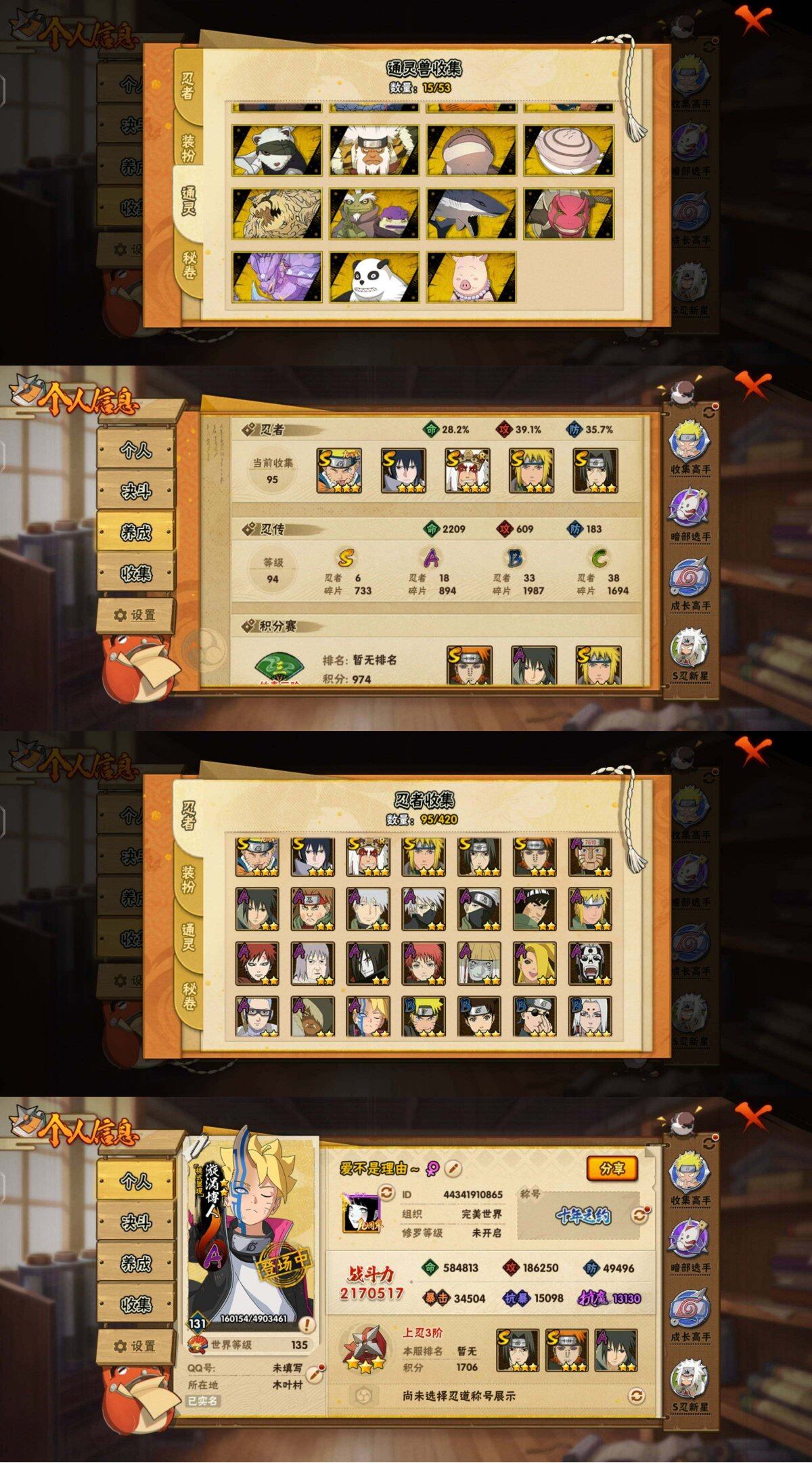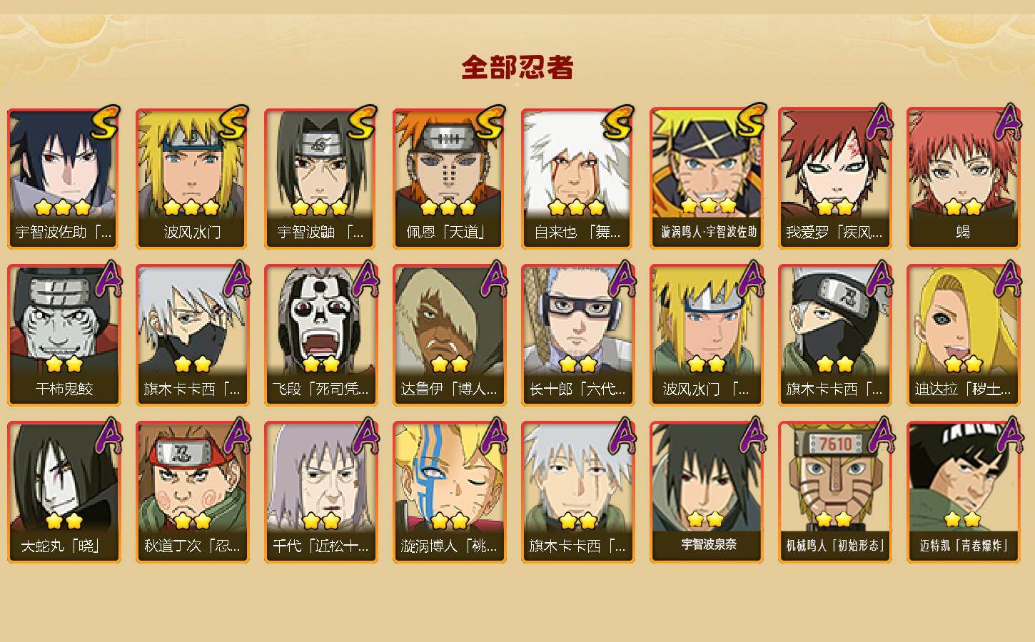 【S级忍者】:宇智波鼬「须佐能乎」(3星),自来也「舞之豪杰」(3星),波风水门(3星),佩恩「天道」(3星),宇智波佐助「永恒万花筒」(3星),漩涡鸣人·宇智波佐助(3星)