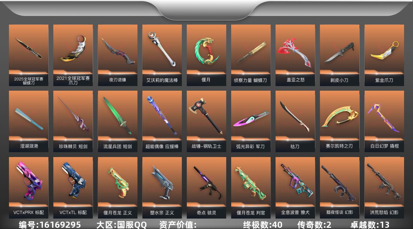 [16169295]【套装】:2025全球冠军赛套装,2021全球冠军赛套装,偃月苍龙套装,盖亚的复仇套装 【英雄】:幻棱,炼狱,维斯,暮蝶,钛狐,壹决,铁臂,捷风,雷兹,幽影,不死鸟,贤者,猎枭,蝰蛇,零,芮娜,奇乐,尚勃勒,霓虹,斯凯,夜露,星礈,K/O,海神,盖可,黑梦,钢锁 【近战武器】:近战武器-2025全球冠军赛 蝴蝶刀,近战武器-2021全球冠军赛 爪刀,近战武器-侦察力量 蝴蝶刀,近战武器-剥皮小刀,近战武器-紫金爪刀,近战武器-艾沃莉的魔法棒,近战武器-澄湖潋滟,近战武器-珍珠棘贝 短剑,近战武器-流星兵团 短剑,近战武器-超能偶像 应援棒,近战武器-盖亚之怒,近战武器-钢轨卫士 战锤,近战武器-弧光异彩 军刀,近战武器-祜刀,近战武器-赛尔凯特之刃,近战武器-白日幻梦 撬棍,近战武器-偃月,近战武器-夜刃诡镰 【狂徒】:狂徒-艾沃莉的梦之翼,狂徒-2025全球冠军赛,狂徒-2021全球冠军赛,狂徒-洪荒怒焰,狂徒-混沌序曲,狂徒-塑水宗,狂徒-偃月苍龙,狂徒-RGX 11z Pro,狂徒-堕天遗武,狂徒-盖亚的复仇,狂徒-紫阙金琅,狂徒-超能偶像,狂徒-钢轨卫士,狂徒-弧光异彩,狂徒-流星兵团 【幻影】:幻影-源能者娱乐系统,幻影-黯夜怪谈,幻影-洪荒怒焰,幻影-千灵华绽,幻影-侦察力量,幻影-噬源兽防卫工程,幻影-珍珠棘贝,幻影-聚合之力,幻影-战术小伙伴 【戍卫】:戍卫-盖亚的复仇,戍卫-超能偶像,戍卫-钢轨卫士,戍卫-珍珠棘贝,戍卫-彩梦之城,戍卫-战术熊与伙伴们 【獠犬】:獠犬-全息波普,獠犬-赛博迷城,獠犬-弧光异彩,獠犬-采蜜小蜂队,獠犬-复古浪潮,獠犬-战术小伙伴 【冥驹】:冥驹-归零者,冥驹-偃月苍龙,冥驹-复古浪潮 【飞将】:飞将-西部未来,飞将-盖亚的复仇,飞将-聚合之力,飞将-信手涂鸦,飞将-光导纤维,飞将-战术熊与伙伴们 【莽侠】:莽侠-深海水族,莽侠-纤云弄巧 【战神】:战神-光明哨兵,战神-采蜜小蜂队,战神-沙场老兵,战神-深海水族 【奥丁】:奥丁-流星兵团,奥丁-信手涂鸦,奥丁-战术小伙伴 【判官】:判官-偃月苍龙,判官-超能偶像,判官-采蜜小蜂队 【雄鹿】:雄鹿-紫阙金琅//2.0,雄鹿-彩梦之城,雄鹿-复古浪潮 【骇灵】:骇灵-奇点,骇灵-紫阙金琅,骇灵-流星兵团,骇灵-珍珠棘贝,骇灵-无限竞技,骇灵-光导纤维,骇灵-信手涂鸦 【
