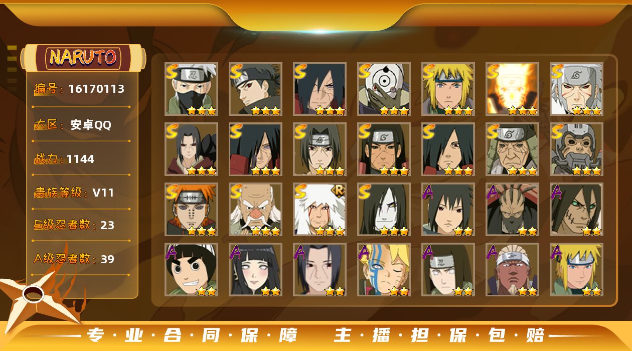 【S级忍者】:半藏「秽土转生」(3星),猿飞日斩「秽土转生」(3星),千手扉间「秽土转生」(3星),千手柱间「秽土转生」(3星),宇智波鼬「秽土转生」(3星),宇智波斑「秽土转生」(3星),宇智波斑「秽土转生·解」(3星),大野木「忍界大战」(3星),宇智波鼬「须佐能乎」(3星),宇智波止水「须佐能乎」(3星),旗木卡卡西「须佐能乎」(3星),自来也「舞之豪杰」(3星),大蛇丸(3星),自来也「传说中的三忍」(3星),宇智波斑(3星),波风水门(3星),漩涡鸣人「九喇嘛连结」(3星),佩恩「天道」(3星),宇智波斑 「白面具」(3星宇智波斑「白面具」),波风水门「九喇嘛连结」(3星),宇智波斑「五影会谈」(3星),漩涡鸣人·宇智波佐助(3星),宇智波带土「十尾人柱力」(3星)