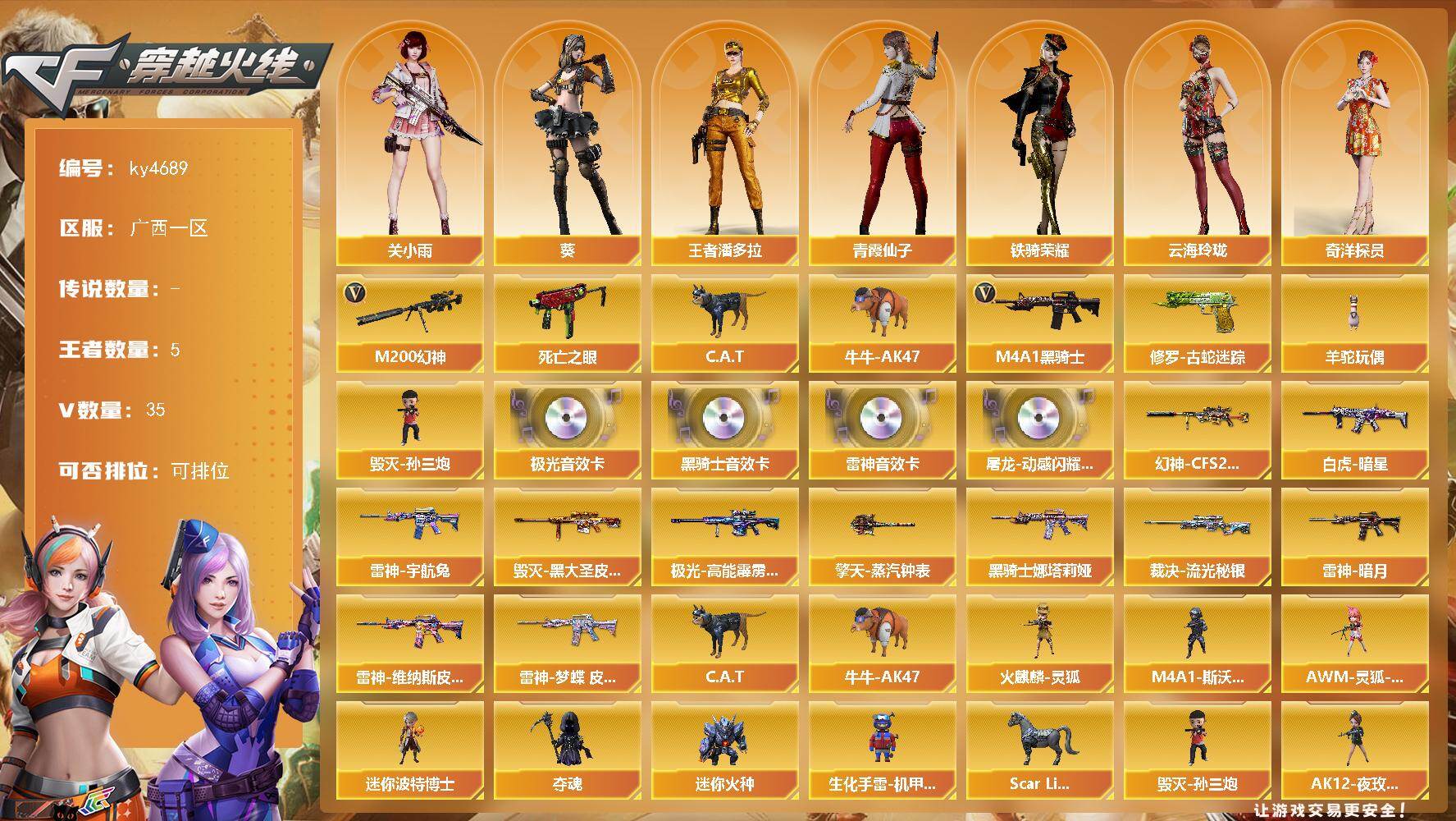 [16169672]广西一区-35V-5王者-0炫金 【热门武器】:M200-幻神,修罗-古蛇迷踪,死亡之眼*2,C.A.T,牛牛-AK47,M4A1-黑骑士,羊驼玩偶,毁灭-孙三炮 【音效卡】:屠龙-动感闪耀 音效卡,M4A1-雷神音效卡,M4A1-黑骑士音效卡,Barrett-极光音效卡 【皮肤】:幻神-CFS2022,Scar Light-白虎-暗星,裁决-流光秘银,雷神-暗月,雷神-宇航兔皮肤,雷神-维纳斯皮肤,雷神-梦蝶 皮肤,毁灭-黑大圣皮肤,M4A1-黑骑士-娜塔莉娅 皮肤,极光-高能霹雳 皮肤,擎天-蒸汽钟表 皮肤 【角色】:葵,关小雨,王者潘多拉,奇洋探员,云海玲珑,空,暗夜-X,芳心审判者,飞虎队-X,虎妞,灵狐-花神,麻雀,曼陀罗-X,女战神,潘多拉-X,青霞仙子,赛斯-X,蛇姬,铁骑荣耀,兔囡囡,雪莉杨,樱-战斗天使,影武者-X 【人偶武器】:毁灭-孙三炮,火麒麟-灵狐,Scar Light-马枪,沙鹰-炎龙-灵狐者,AWM-灵狐-15周年嘉年华,C.A.T,牛牛-AK47,迷你波特博士*2,夺魂,迷你火种*4,生化手雷-机甲核心*2,COP-青花瓷-斯沃特精英,M4A1-斯沃特,AK12-夜玫瑰 【暴走生化】:死亡之眼*2,超级对讲机 【挑战大师】:神圣爆裂者III,冰龙粉碎者-白马银枪,激光毁灭者III-白马银枪,VEPR-12-金魔,激光毁灭者III*2,机甲撕裂者III,神圣爆裂者-末日III,阐释者III 【英雄级武器】:M4A1-雷神,M4A1-黑骑士,AK47-无影,AK12-天启,黑武士-锦绣游龙,超新星-热带奇洋,王者之鲨-觉醒版,黑骑士-海王,王者芳薇-觉醒版,Barrett-毁灭,Barrett-极光,AWM-裁决,M200-幻神,王者之力-觉醒版,Barrett-雷霆王者-觉醒版,烈龙-云海游龙,AA-12-雷霆,沙鹰-天神*2,COP 357-云龙,修罗-古蛇迷踪,屠龙*2,擎天,幻灵之锋,擎天-云海游龙,龙啸-热带奇洋,雷霆王者之锋-觉醒版,高爆手雷-幻灵,高爆手雷-云龙*2,手雷-云海游龙,手雷-热带奇洋,高爆手雷-古蛇迷踪,闪光弹-幻灵,闪光弹-竞技荣光,闪光弹-云龙,烟雾弹-云龙*3,烟雾弹-古蛇迷踪,M4A1-赤狱骑士 【道具】:BS战队炫彩背包,云海游龙炫彩背包,亚洲杯纪念炫彩背包,古蛇迷踪炫彩背包,奇洋探员-海龟背包,女