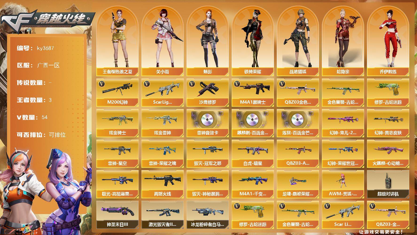 [16172683]广西一区-54V-3王者-2炫金 【热门武器】:QBZ03-金色蔷薇,Scar Light-白虎,M200-幻神,金色蔷薇-古蛇迷踪,修罗-古蛇迷踪,M4A1-黑骑士,沙鹰-修罗 【王者炫金武器】:炫金骑士,炫金雷神 【音效卡】:M4A1-雷神音效卡,麒麟刺-百战金芒-盛典舞曲音效卡,炼狱-百战金芒-庆典舞曲音效卡 【皮肤】:M200-幻神-黄忠皮肤,幻神-宠儿-2021MVP,M200-幻神-荣耀世冠白鲨,Scar Light-白虎-暗星,QBZ03-AG-CFPLS19冠军,雷神-荣耀之魄,雷神-星空,M4A1-再燃火线,火麒麟-心动糖果,毁灭-冠军之怒,毁灭-神秘黑洞皮肤,M4A1-千变-孔明皮肤,极光-高能霹雳 皮肤,龙啸-巅峰荣耀 皮肤 【角色】:魅影,关小雨,战地猎狐,王者樱-热浪之夏,蛇隐宗,奇洋探员,乔伊教练,云海玲珑,暗夜-X,初恋灵狐,电竞少女,芳心审判者,飞虎队-X,风暴女,虎妞,嘉年华灵狐,娟娟,兰-海滩派对,兰-新年限定,灵狐者-X,麻雀,萌儿,潘多拉-X,潘多拉-甜心教官,蛇姬,斯沃特-X,铁骑荣耀,兔囡囡,游珑儿 【人偶武器】:AWM-灵狐-15周年嘉年华 【暴走生化】:超级对讲机 【挑战大师】:冰龙粉碎者-白马银枪,激光毁灭者III-白马银枪,神圣爆裂者-末日III 【英雄级武器】:M4A1-雷神*2,M4A1-黑骑士,AK12-天启,Scar Light-白虎,无影-神兵利器,QBZ03-云龙,黑武士-锦绣游龙,超新星-热带奇洋,金色蔷薇-古蛇迷踪,QBZ03-金色蔷薇,Barrett-毁灭,AWM-裁决,M200-幻神,炼狱-百战金芒,沙鹰-修罗,柯尔特-竞技荣光,COP 357-云龙*2,修罗-古蛇迷踪,屠龙,龙啸-热带奇洋,麒麟刺-百战金芒,高爆手雷-雷暴,高爆手雷-幻灵,高爆手雷-竞技荣光*5,高爆手雷-云龙*3,手雷-热带奇洋,高爆手雷-古蛇迷踪,闪光弹-雷暴,闪光弹-幻灵,闪光弹-竞技荣光*5,闪光弹-云龙,闪光弹-雷霆王者-觉醒版,烟雾弹-幻灵,烟雾弹-竞技荣光*8,烟雾弹-云龙,烟雾弹-古蛇迷踪,M4A1-赤狱骑士,AWM-昌龙,Barrett-碧霄极光 【道具】:BS战队炫彩背包,CFS限定背包,全能枪王背包,古蛇迷踪炫彩背包,奇洋探员-海龟背包,炫彩背包,热带奇洋炫彩背包,百战金芒炫彩背包,超级背包,女皇终结者