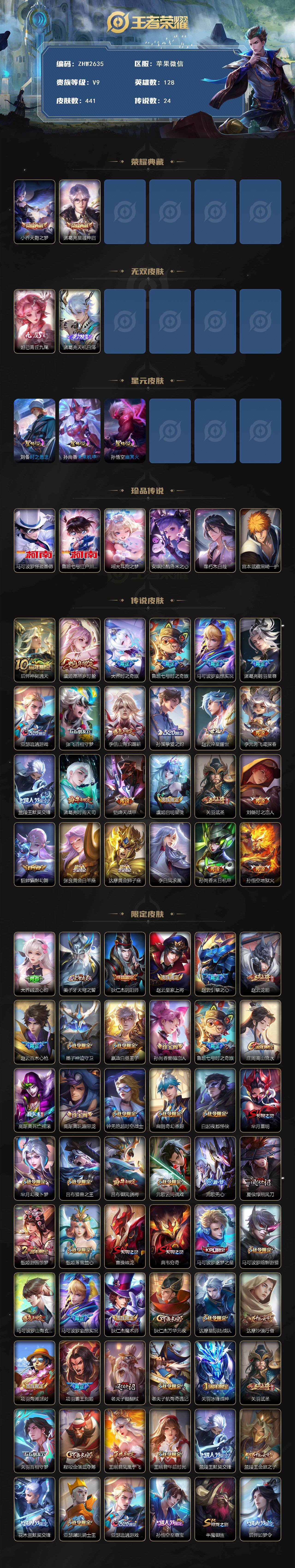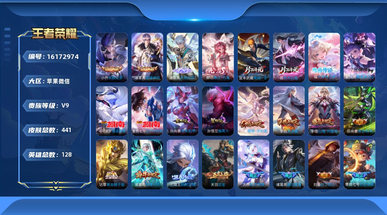 [16172974]苹果WX-151382积分马上V10!!!V9-至尊星耀V段位-128英雄-441皮肤-2典藏皮肤-2无双-6珍品传说-24传说-132史诗 【英雄全皮】:刘禅全皮,达摩全皮,孙权全皮,钟馗全皮,苏烈全皮,狂铁全皮,蒙恬全皮,戈娅全皮,空空儿全皮,影全皮,海诺全皮 【荣耀典藏】:小乔天鹅之梦,诸葛亮星域神启 【无双皮肤】:妲己青丘九尾,诸葛亮天机白泽 【珍品传说】:马可波罗怪盗基德,鲁班七号江户川柯南,瑶大耳狗之梦,安琪拉酷洛米之心,暃朽木白哉,宫本武藏黑崎一护 【传说皮肤】:后羿神树通天,虞姬愿照岁时盈,大乔时之奇旅,鲁班七号时之奇旅,马可波罗妄想实况,诸葛亮鹤羽星尊,亚瑟追逃游戏,张飞百相守梦,李信山海炽霜斩,孙策挚爱之约,赵云淬星耀世,李元芳飞鸢探春,兰陵王默契交锋,诸葛亮时雨天司,铠绛天战甲,虞姬启明星使,关羽武圣,刘备时之恋人,貂蝉猫影幻舞,张良黄金白羊座,达摩黄金狮子座,李白凤求凰,孙尚香末日机甲,孙悟空地狱火 【限定皮肤】:大乔绒语心约,姜子牙天穹之誓,狄仁杰阴阳师,赵云皇家上将,赵云引擎之心,赵云龙胆,赵云百木心枪,墨子神迹守卫,嬴政白昼王子,孙尚香蔷薇恋人,鲁班七号时之奇旅,庄周高山流水,高渐离死亡摇滚,高渐离玩趣恶龙,钟无艳超时空战士,扁鹊奇幻香踪,白起夜都怪侠,芈月重明,芈月幻夜卜梦,吕布猎兽之王,吕布御风骁将,元歌云间偶戏,元歌无心,夏侯惇朔风刀,甄姬游园惊梦,甄姬落雪兰心,曹操烛龙,典韦穷奇,马可波罗逐梦之星,马可波罗暗影游猎,马可波罗山海玄木吟,马可波罗妄想实况,狄仁杰魔术师,狄仁杰万华元夜,达摩星际陆战队,达摩沙漠行僧,项羽海滩派对,项羽霸王别姬,老夫子醍醐杖,老夫子航海奇遇记,关羽冰锋战神,关羽武圣,关羽百相守梦,程咬金演武夺筹,王昭君凤凰于飞,王昭君午后时光,兰陵王默契交锋,兰陵王金庭之子,花木兰默契交锋,亚瑟潮玩骑士王,亚瑟追逃游戏,孙悟空至尊宝,牛魔御旌,后羿如梦令,刘备百相守梦,张飞百相守梦,李元芳银河之约,李元芳匿光侦查者,李元芳云中旅人,虞姬霸王别姬,虞姬启明星使,钟馗神迹守卫,钟馗驱傩正仪,杨玉环遇见飞天,杨戬潮玩骑兵,女娲朔望之晖,干将莫邪冰霜恋舞曲,雅典娜单词大作战,雅典娜黎明之约,蔡文姬繁星吟游,太乙真人饕餮,鬼谷子原初探秘者,鬼谷子五谷丰年,诸葛亮时雨天司,诸葛亮鹤羽星尊,大乔时之奇旅,黄忠火炮绅士,铠青龙志,
