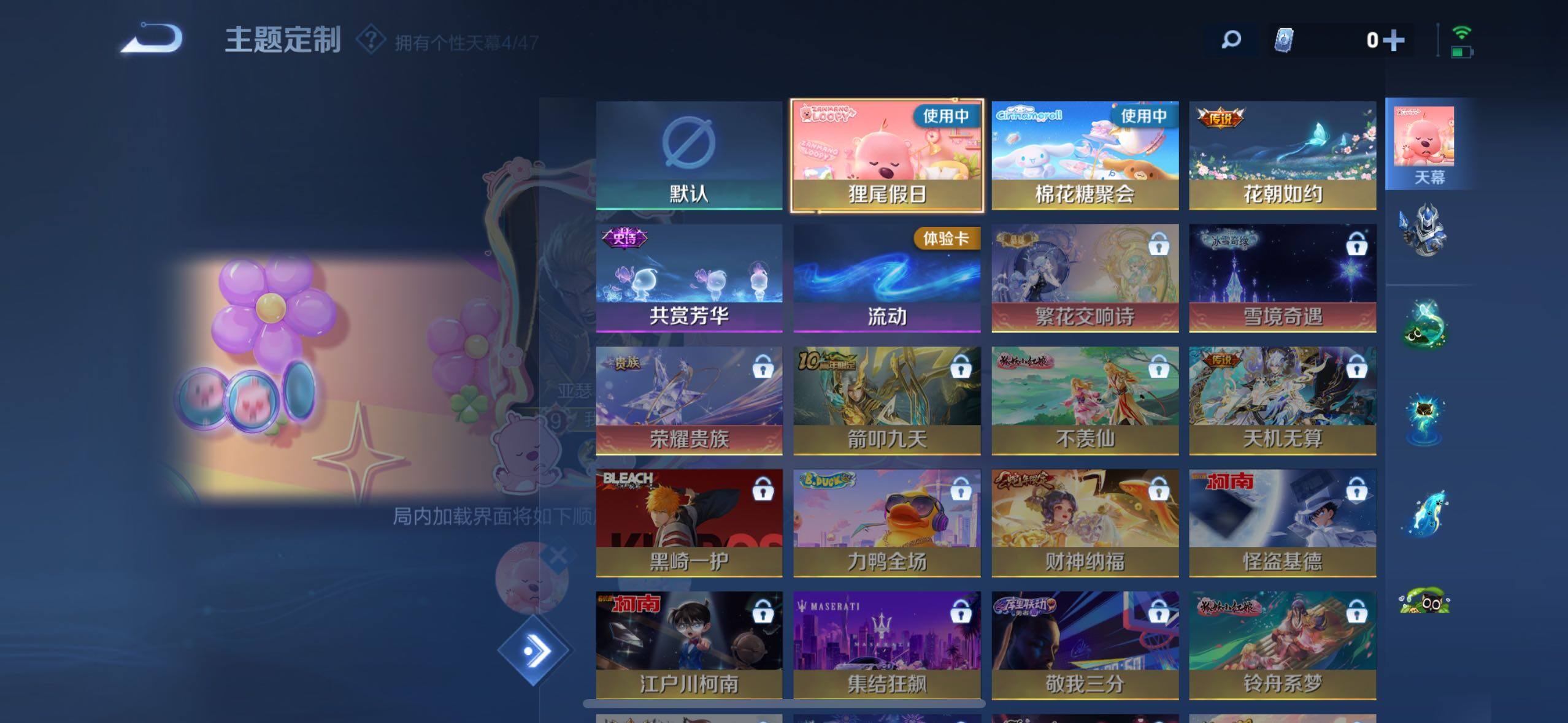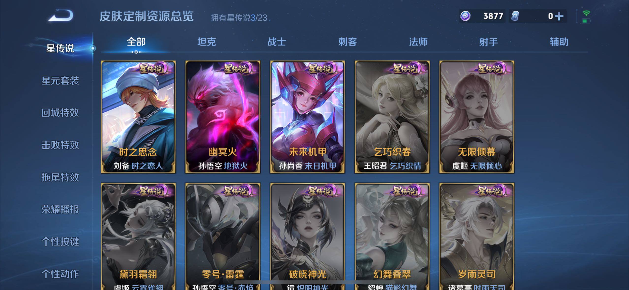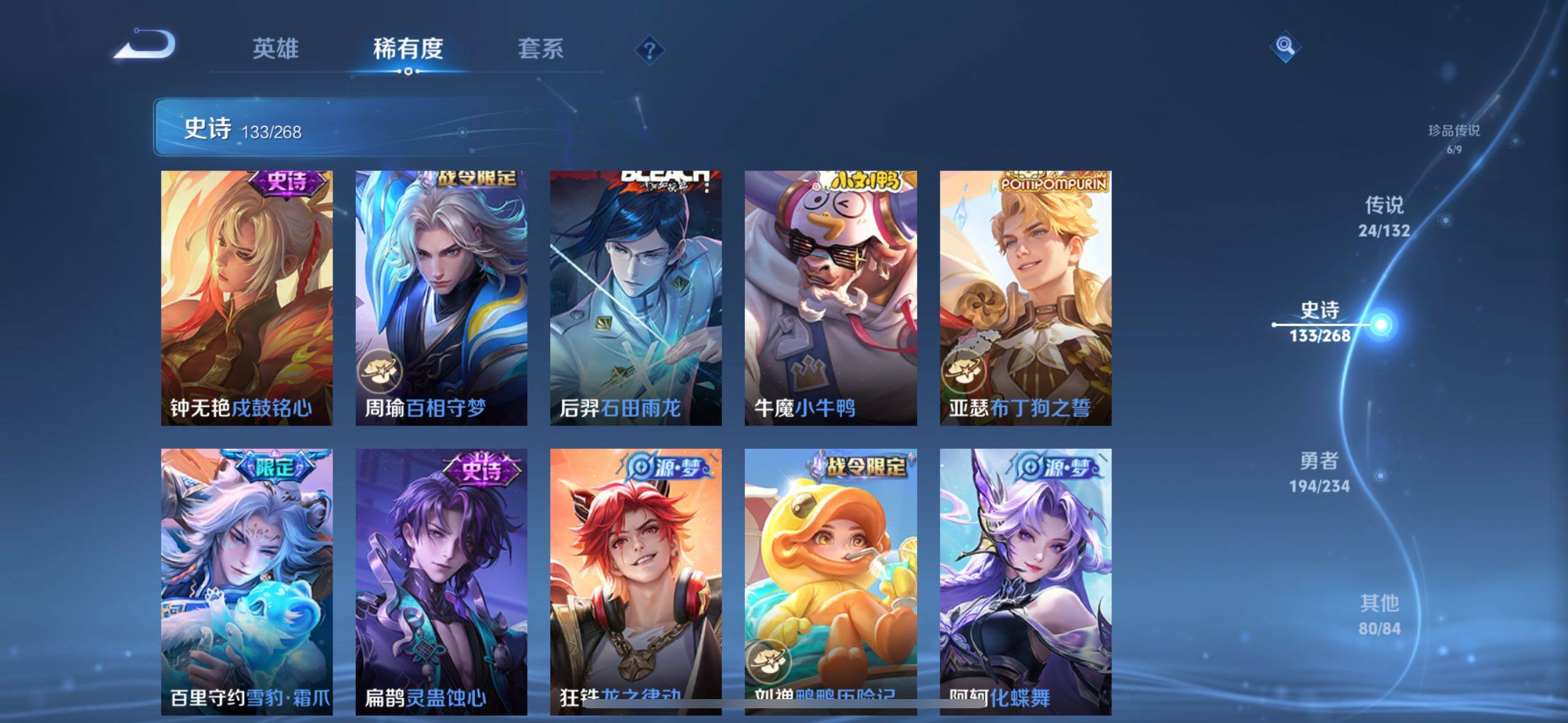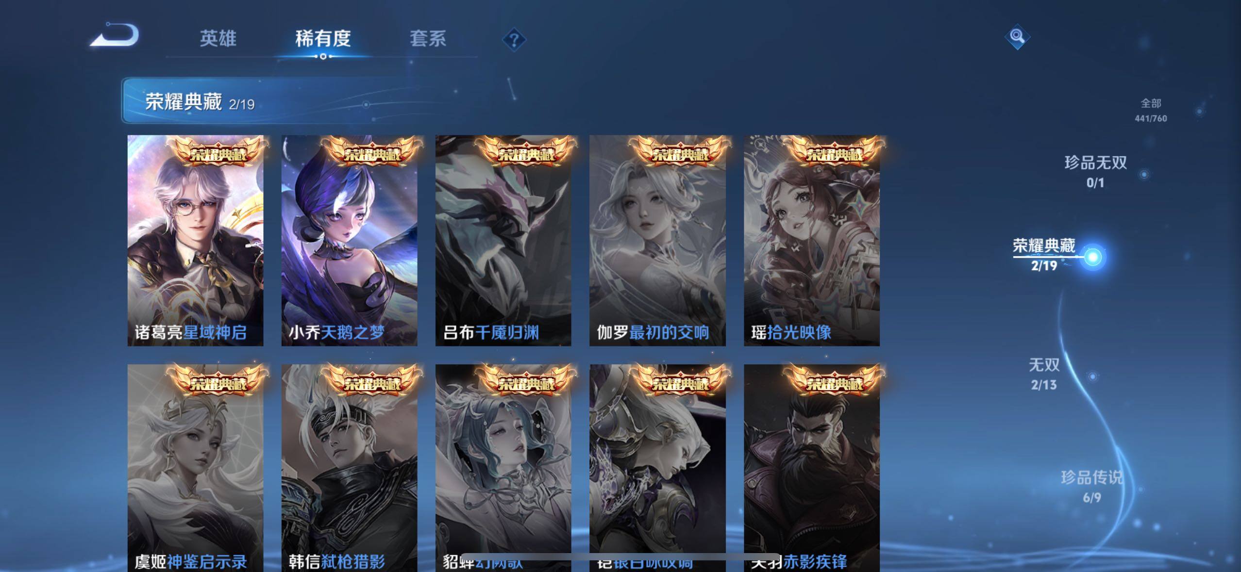 娜可露露晚萤,伽罗箭羽风息,李元芳逐浪之夏,不知火舞魅语,大乔猫狗日记,孙策猫狗日记,阿轲节奏热浪,诸葛亮黄金分割率,王昭君偶像歌手,韩信白龙吟,项羽苍穹之光,孙尚香时之恋人,阿轲暗夜猫娘,雅典娜冰冠公主,吕布末日机甲,鲁班七号电玩小子,橘右京修罗,嬴政摇滚巨星,刘禅绅士熊喵,刘禅天才门将,白起星夜王子,安琪拉心灵骇客,程咬金功夫厨神,刘邦德古拉伯爵,兰陵王暗隐猎兽者,曹操幽灵船长,宫本武藏鬼剑武藏,亚瑟心灵战警,钟馗乐园奇幻夜,蔡文姬舞动绿茵,廉颇地狱岩魂,小乔缤纷独角兽,夏侯惇乘风破浪,花木兰水晶猎龙者,铠曙光守护者,墨子金属风暴,百里玄策原初追逐者,吕布圣诞狂欢,貂蝉圣诞恋歌,百里守约特工魅影,嬴政暗夜贵公子,嫦娥拒霜思,雅典娜黎明之约,李白千年之狐,刘备百相守梦,关羽百相守梦,沈梦溪匿光破解者,刘禅电玩·爆裂旋风,镜真我赫兹,百里守约真我赫兹,赵怀真鹤归松栖,莱西奥末日机甲,李元芳匿光侦查者,蒙犽百解令,伽罗琥珀纪元,海诺心动手记