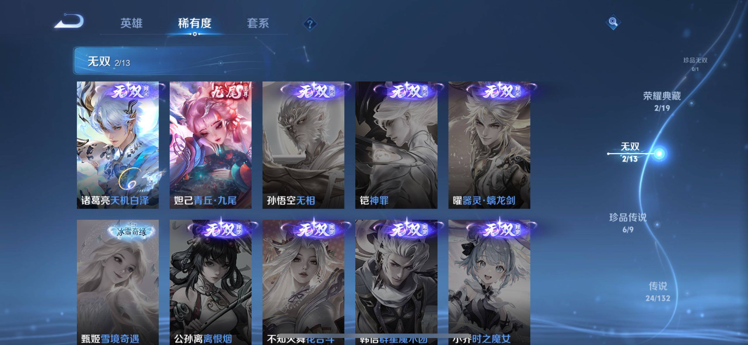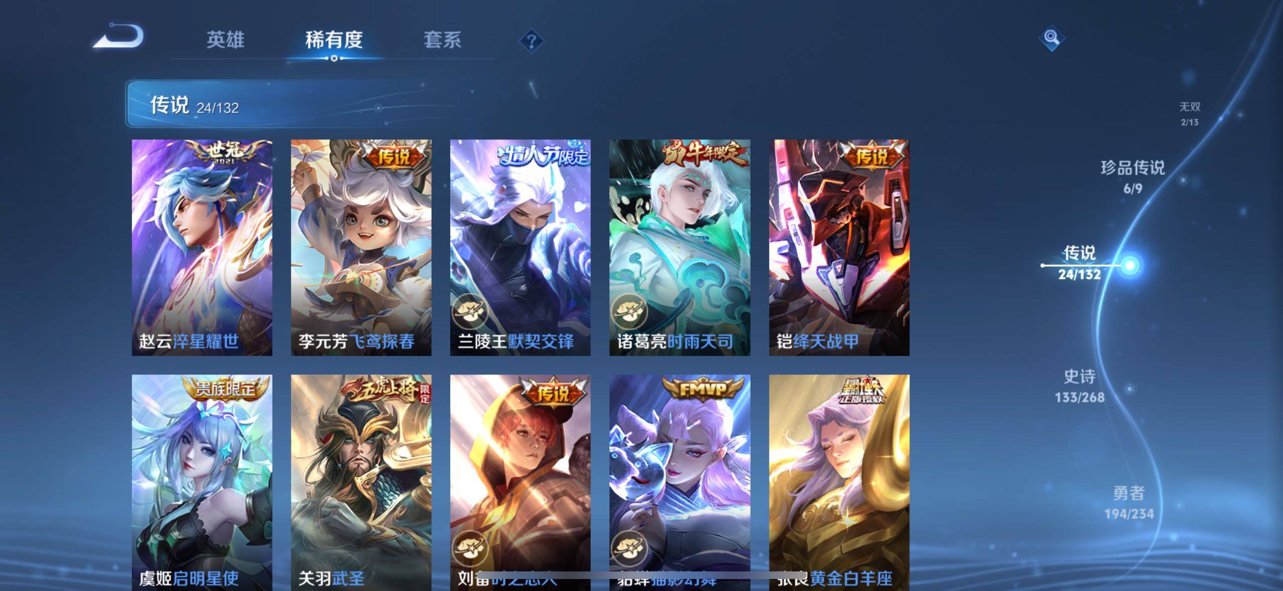 关羽冰锋战神,裴擒虎李小龙,上官婉儿梁祝,吕布御风骁将,诸葛亮时雨天司,赵云龙胆,关羽武圣,马可波罗逐梦之星,铠青龙志,苏烈玄武志,王昭君凤凰于飞,项羽霸王别姬,虞姬霸王别姬,花木兰默契交锋,兰陵王默契交锋,后羿如梦令,孙悟空至尊宝,干将莫邪冰霜恋舞曲,赵云引擎之心,赵云百木心枪,马可波罗山海·玄木吟,虞姬愿照·岁时盈