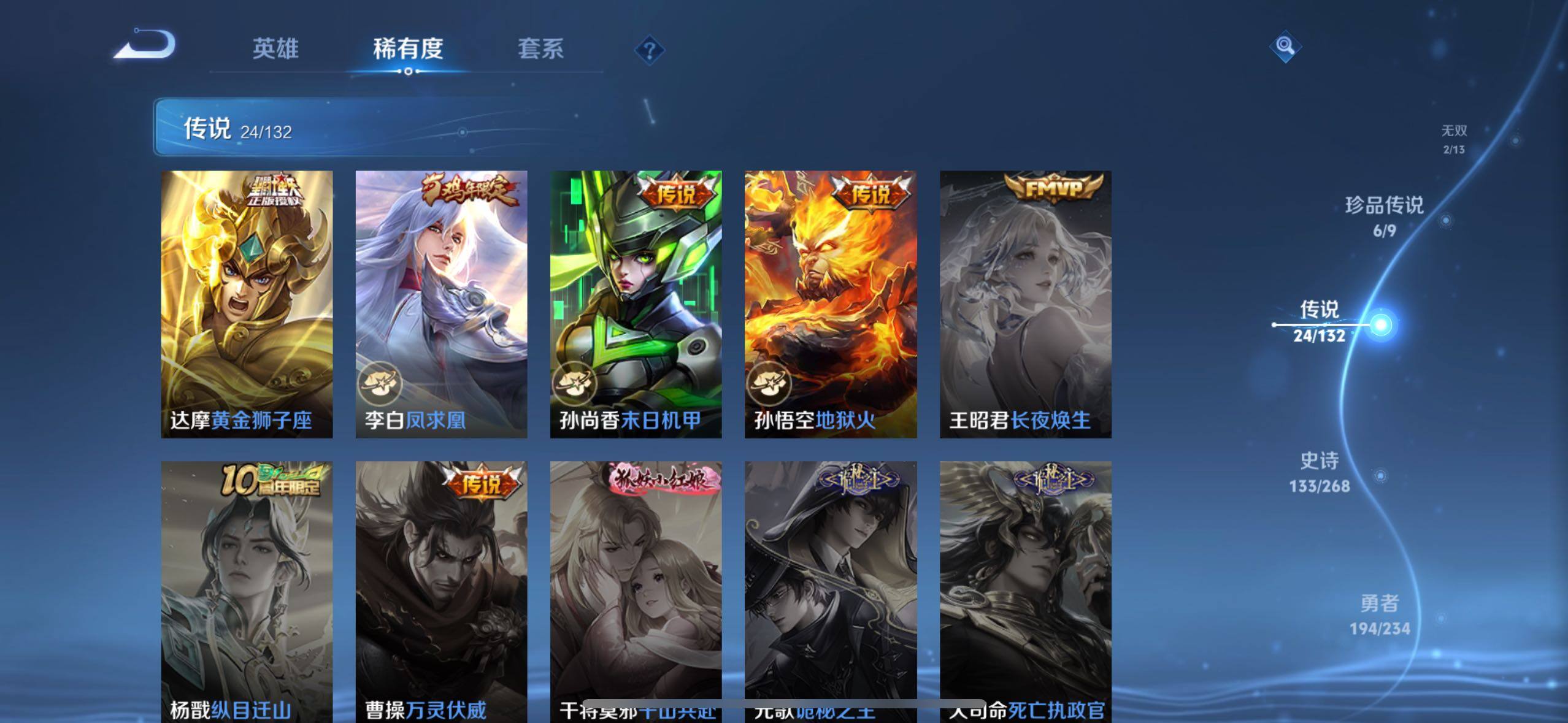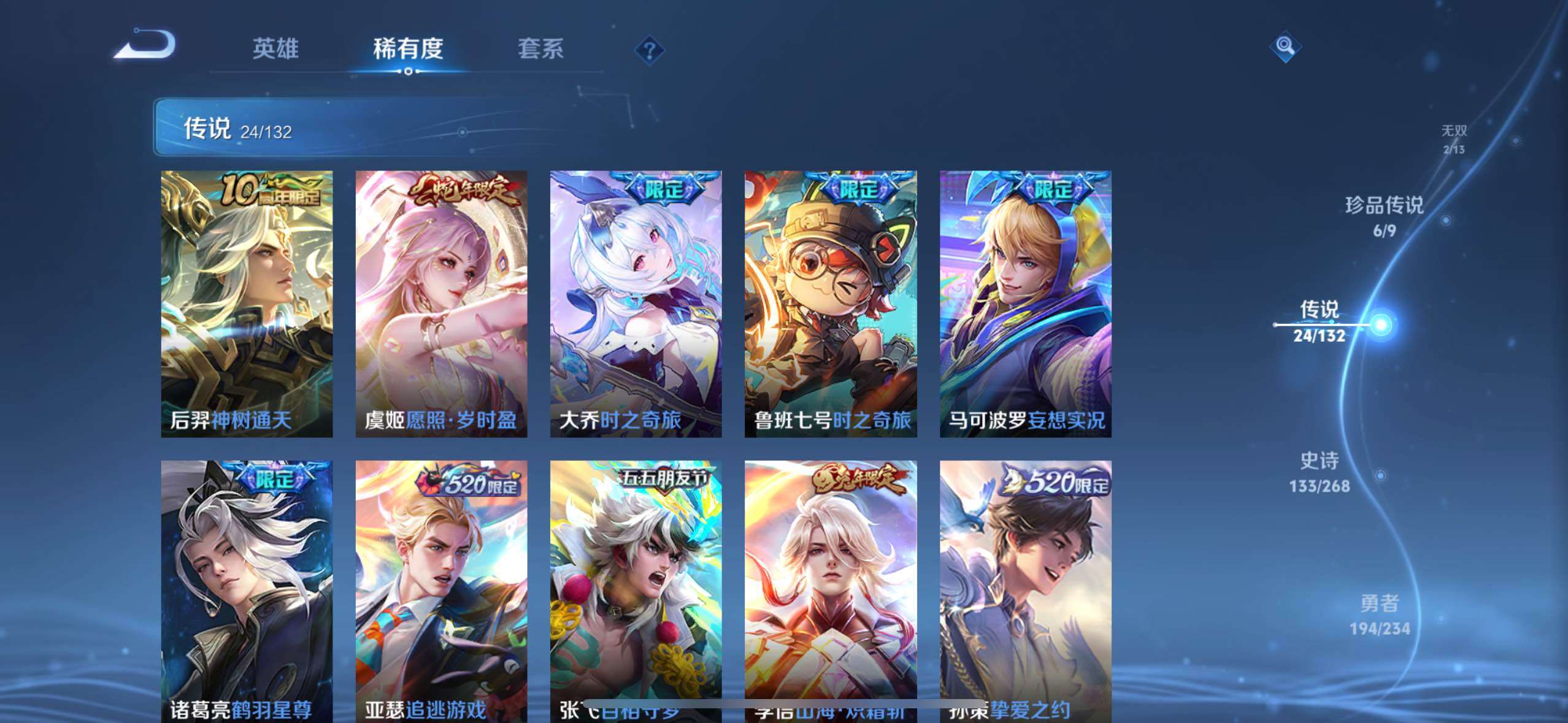 【传说皮肤】:后羿神树通天,虞姬愿照岁时盈,大乔时之奇旅,鲁班七号时之奇旅,马可波罗妄想实况,诸葛亮鹤羽星尊,亚瑟追逃游戏,张飞百相守梦,李信山海炽霜斩,孙策挚爱之约,赵云淬星耀世,李元芳飞鸢探春,兰陵王默契交锋,诸葛亮时雨天司,铠绛天战甲,虞姬启明星使,关羽武圣,刘备时之恋人,貂蝉猫影幻舞,张良黄金白羊座,达摩黄金狮子座,李白凤求凰,孙尚香末日机甲,孙悟空地狱火