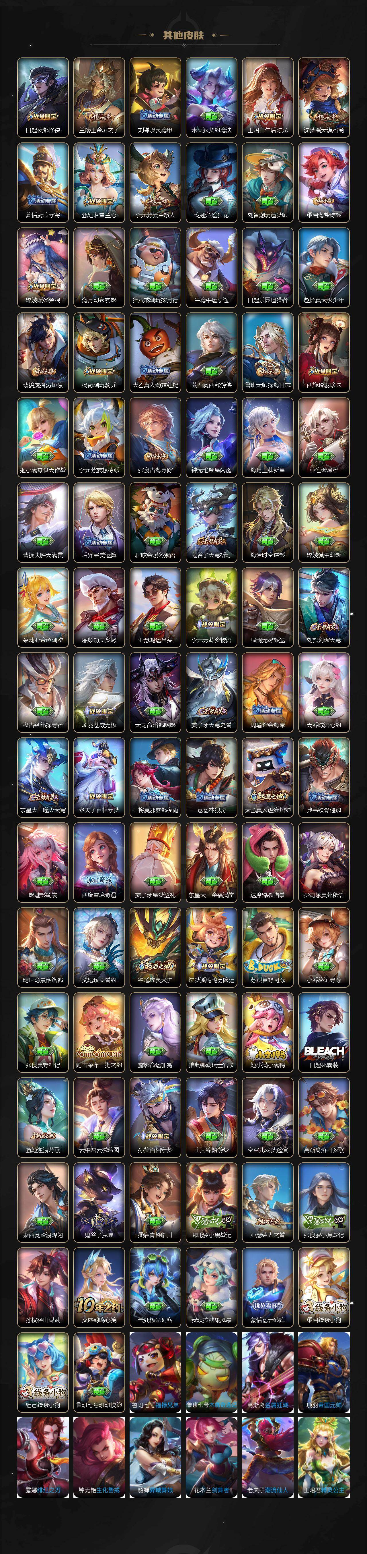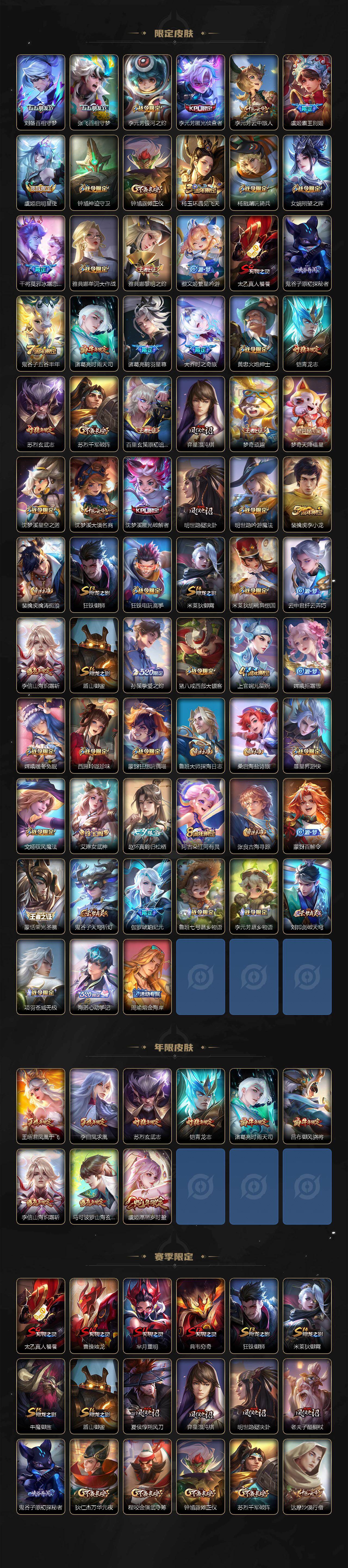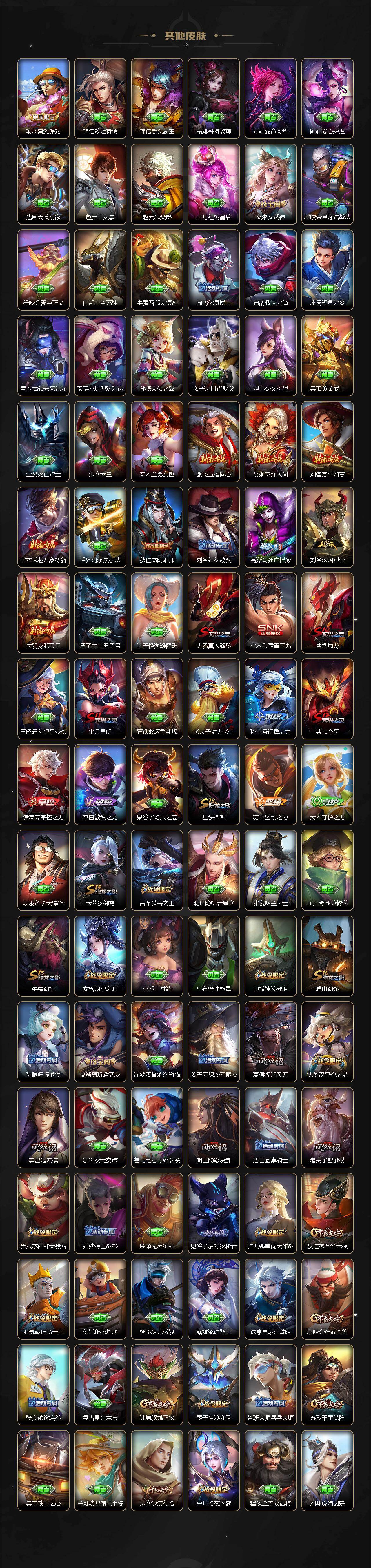 【限定皮肤】:大乔绒语心约,姜子牙天穹之誓,狄仁杰阴阳师,赵云皇家上将,赵云引擎之心,赵云龙胆,赵云百木心枪,墨子神迹守卫,嬴政白昼王子,孙尚香蔷薇恋人,鲁班七号时之奇旅,庄周高山流水,高渐离死亡摇滚,高渐离玩趣恶龙,钟无艳超时空战士,扁鹊奇幻香踪,白起夜都怪侠,芈月重明,芈月幻夜卜梦,吕布猎兽之王,吕布御风骁将,元歌云间偶戏,元歌无心,夏侯惇朔风刀,甄姬游园惊梦,甄姬落雪兰心,曹操烛龙,典韦穷奇,马可波罗逐梦之星,马可波罗暗影游猎,马可波罗山海玄木吟,马可波罗妄想实况,狄仁杰魔术师,狄仁杰万华元夜,达摩星际陆战队,达摩沙漠行僧,项羽海滩派对,项羽霸王别姬,老夫子醍醐杖,老夫子航海奇遇记,关羽冰锋战神,关羽武圣,关羽百相守梦,程咬金演武夺筹,王昭君凤凰于飞,王昭君午后时光,兰陵王默契交锋,兰陵王金庭之子,花木兰默契交锋,亚瑟潮玩骑士王,亚瑟追逃游戏,孙悟空至尊宝,牛魔御旌,后羿如梦令,刘备百相守梦,张飞百相守梦,李元芳银河之约,李元芳匿光侦查者,李元芳云中旅人,虞姬霸王别姬,虞姬启明星使,钟馗神迹守卫,钟馗驱傩正仪,杨玉环遇见飞天,杨戬潮玩骑兵,女娲朔望之晖,干将莫邪冰霜恋舞曲,雅典娜单词大作战,雅典娜黎明之约,蔡文姬繁星吟游,太乙真人饕餮,鬼谷子原初探秘者,鬼谷子五谷丰年,诸葛亮时雨天司,诸葛亮鹤羽星尊,大乔时之奇旅,黄忠火炮绅士,铠青龙志,