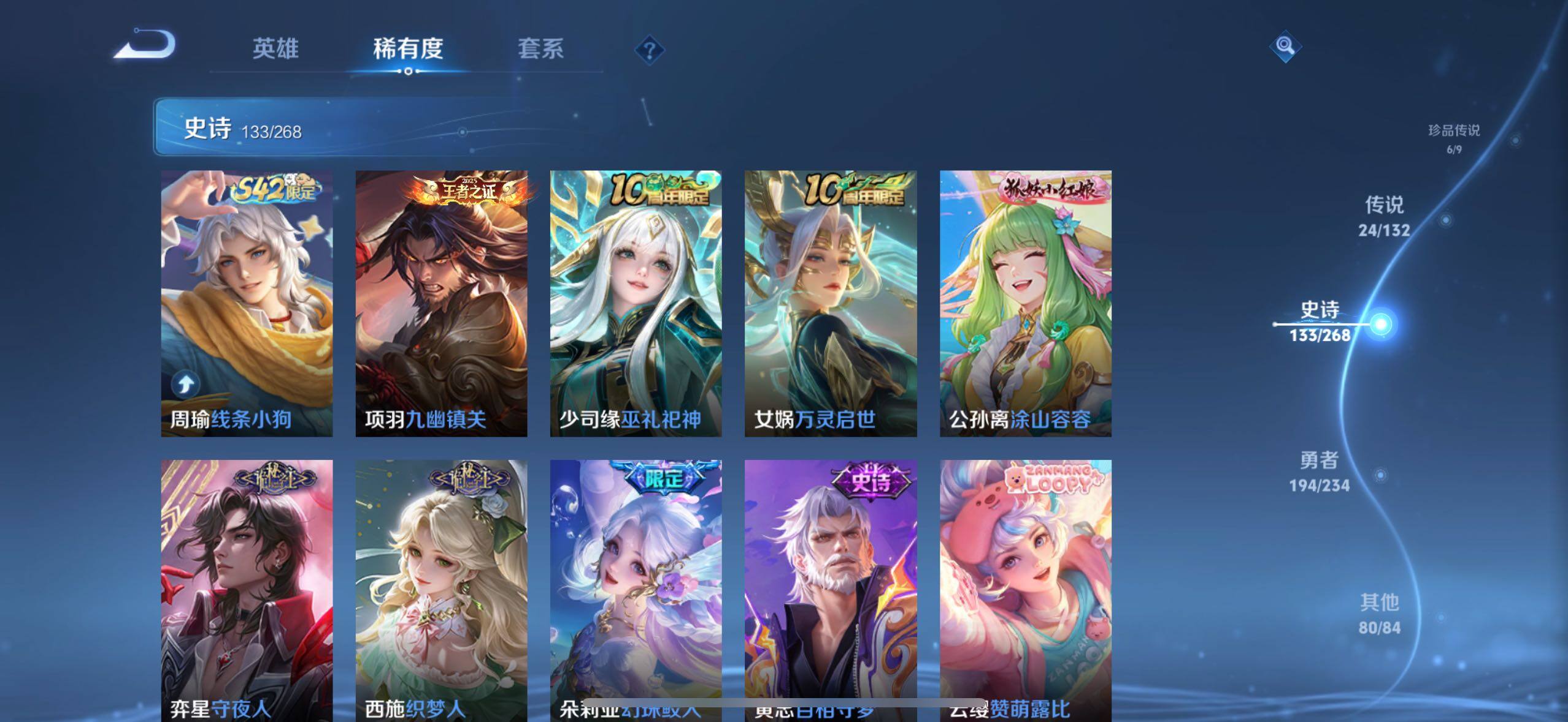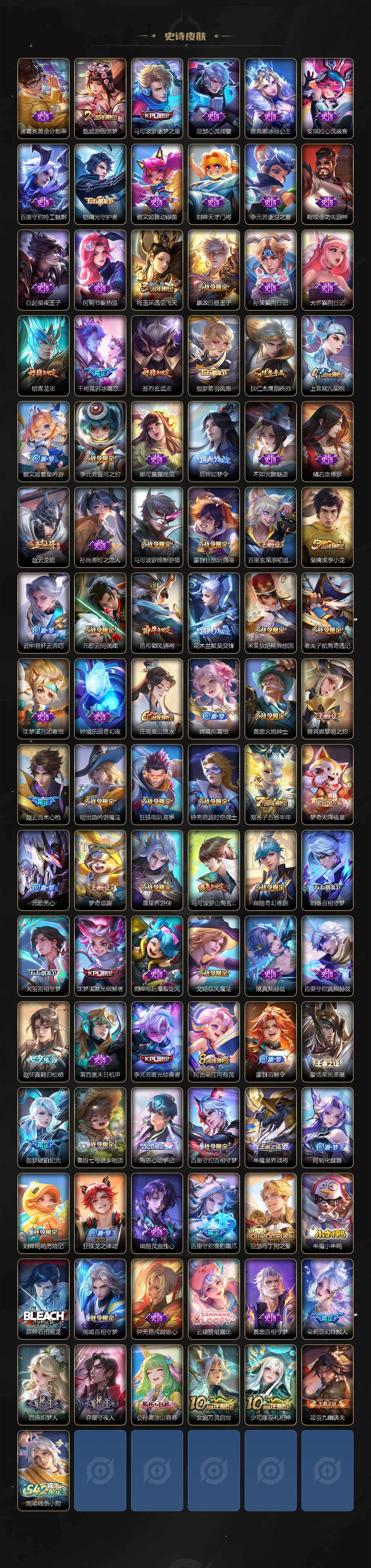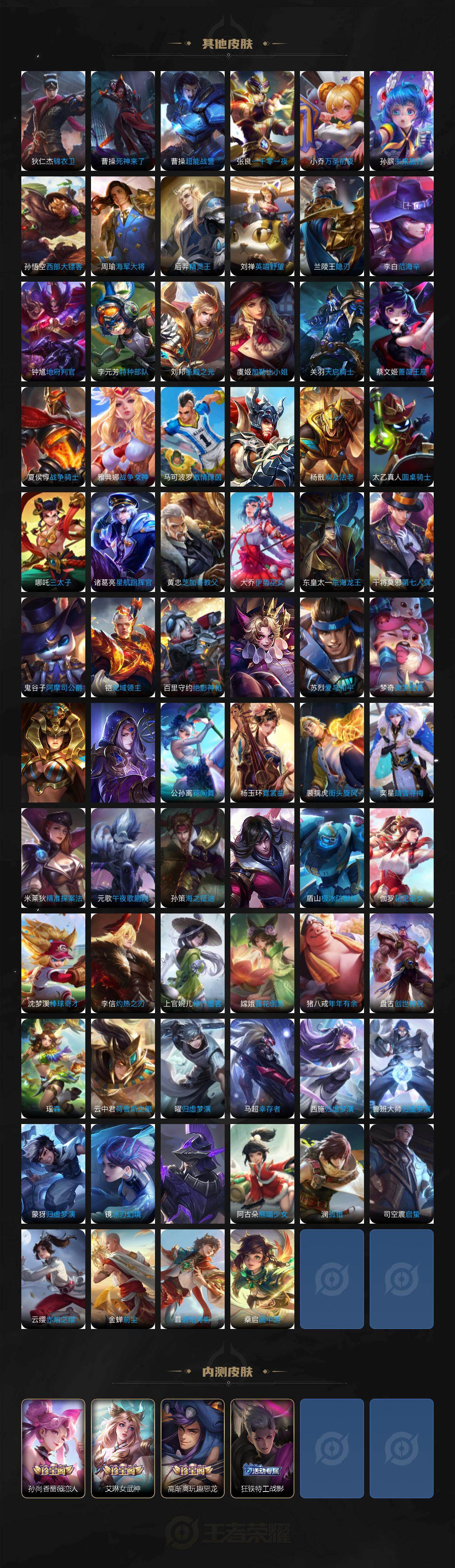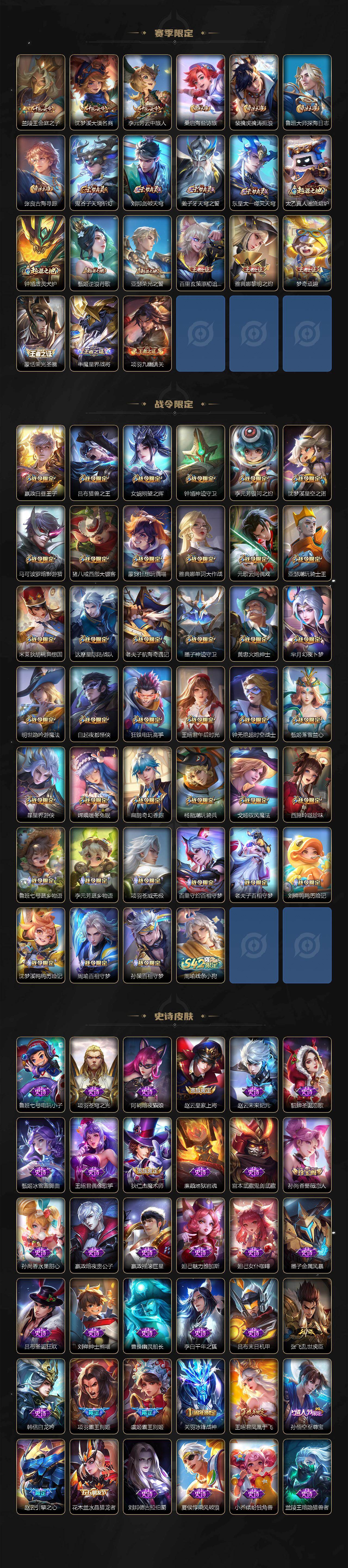 【限定皮肤】:大乔绒语心约,姜子牙天穹之誓,狄仁杰阴阳师,赵云皇家上将,赵云引擎之心,赵云龙胆,赵云百木心枪,墨子神迹守卫,嬴政白昼王子,孙尚香蔷薇恋人,鲁班七号时之奇旅,庄周高山流水,高渐离死亡摇滚,高渐离玩趣恶龙,钟无艳超时空战士,扁鹊奇幻香踪,白起夜都怪侠,芈月重明,芈月幻夜卜梦,吕布猎兽之王,吕布御风骁将,元歌云间偶戏,元歌无心,夏侯惇朔风刀,甄姬游园惊梦,甄姬落雪兰心,曹操烛龙,典韦穷奇,马可波罗逐梦之星,马可波罗暗影游猎,马可波罗山海玄木吟,马可波罗妄想实况,狄仁杰魔术师,狄仁杰万华元夜,达摩星际陆战队,达摩沙漠行僧,项羽海滩派对,项羽霸王别姬,老夫子醍醐杖,老夫子航海奇遇记,关羽冰锋战神,关羽武圣,关羽百相守梦,程咬金演武夺筹,王昭君凤凰于飞,王昭君午后时光,兰陵王默契交锋,兰陵王金庭之子,花木兰默契交锋,亚瑟潮玩骑士王,亚瑟追逃游戏,孙悟空至尊宝,牛魔御旌,后羿如梦令,刘备百相守梦,张飞百相守梦,李元芳银河之约,李元芳匿光侦查者,李元芳云中旅人,虞姬霸王别姬,虞姬启明星使,钟馗神迹守卫,钟馗驱傩正仪,杨玉环遇见飞天,杨戬潮玩骑兵,女娲朔望之晖,干将莫邪冰霜恋舞曲,雅典娜单词大作战,雅典娜黎明之约,蔡文姬繁星吟游,太乙真人饕餮,鬼谷子原初探秘者,鬼谷子五谷丰年,诸葛亮时雨天司,诸葛亮鹤羽星尊,大乔时之奇旅,黄忠火炮绅士,铠青龙志,