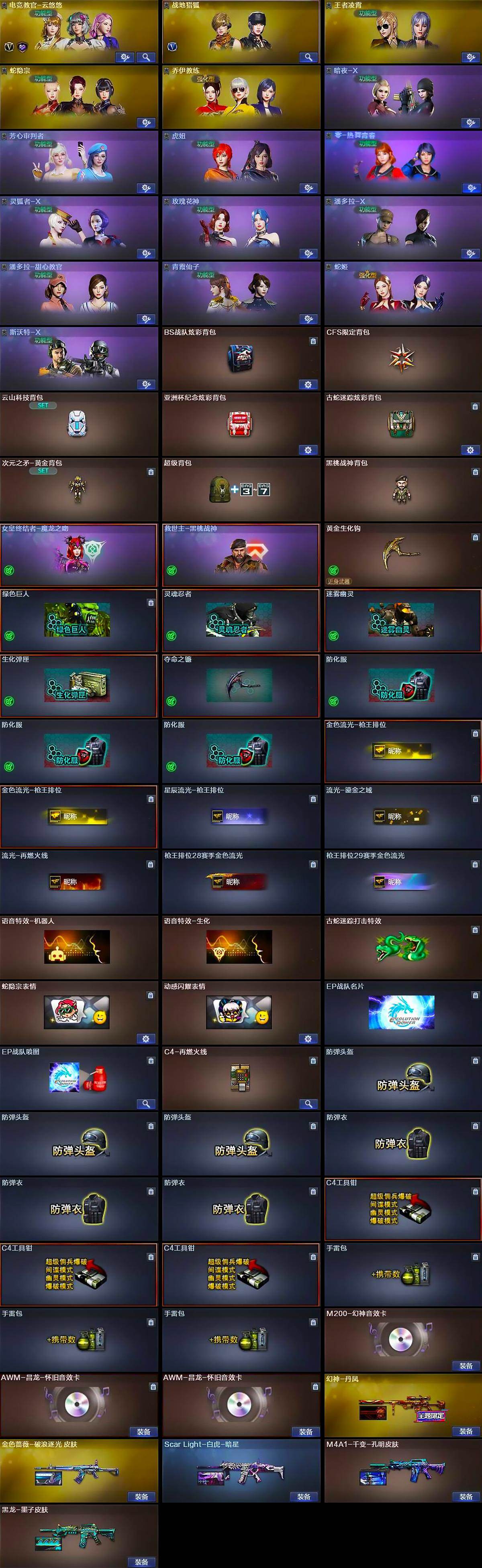 【道具】:BS战队炫彩背包,CFS限定背包,云山科技背包,亚洲杯纪念炫彩背包,古蛇迷踪炫彩背包,次元之矛-黄金背包,超级背包,黑桃战神背包,女皇终结者-魔龙之吻,救世主-黑桃战神,黄金生化钩,绿色巨人,灵魂忍者,迷雾幽灵,生化弹匣,夺命之镰,防化服*3,金色流光-枪王排位*2,星辰流光-枪王排位,流光-鎏金之域,流光-再燃火线,枪王排位28赛季金色流光,枪王排位29赛季金色流光,语音特效-机器人,语音特效-生化,古蛇迷踪打击特效,蛇隐宗表情,动感闪耀表情,EP战队名片,EP战队喷图,C4-再燃火线,防弹头盔*3,防弹衣*3,C4工具钳*3,手雷包*3