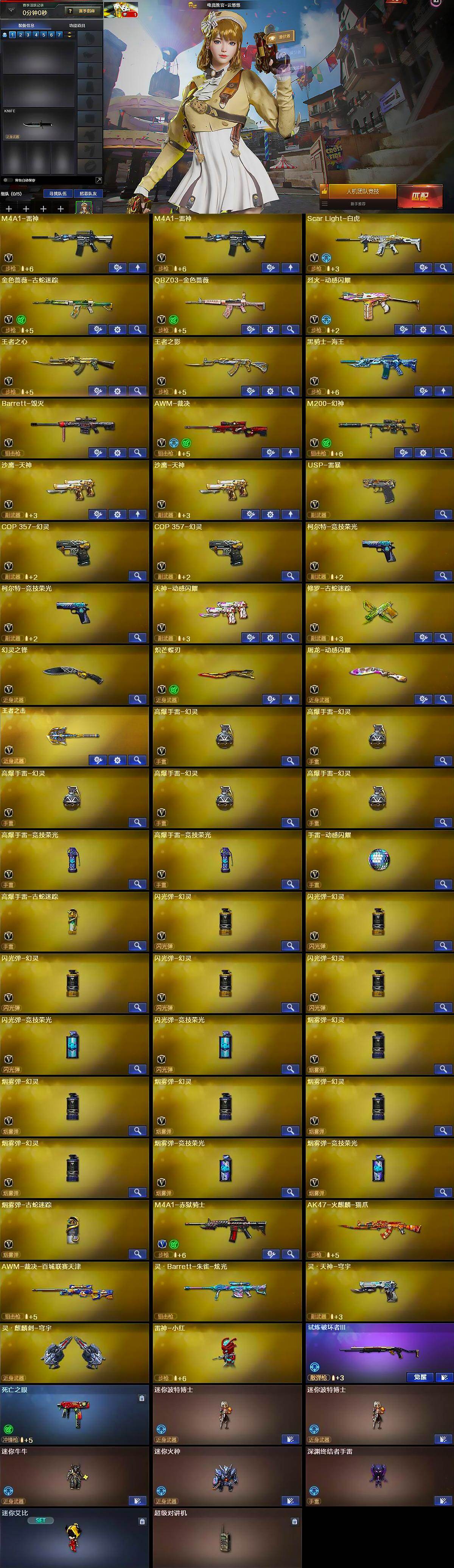 【英雄级武器】:M4A1-雷神*2,Scar Light-白虎,金色蔷薇-古蛇迷踪,QBZ03-金色蔷薇,烈火-动感闪耀,王者之心-觉醒版,王者之影-觉醒版,黑骑士-海王,Barrett-毁灭,AWM-裁决,M200-幻神,沙鹰-天神*2,USP-雷暴,COP 357-幻灵*2,柯尔特-竞技荣光*2,天神-动感闪耀,修罗-古蛇迷踪,幻灵之锋,炽芒蝶刃,屠龙-动感闪耀,王者之击-觉醒版,高爆手雷-幻灵*5,高爆手雷-竞技荣光*2,手雷-动感闪耀,高爆手雷-古蛇迷踪,闪光弹-幻灵*5,闪光弹-竞技荣光*2,烟雾弹-幻灵*5,烟雾弹-竞技荣光*2,烟雾弹-古蛇迷踪,M4A1-赤狱骑士