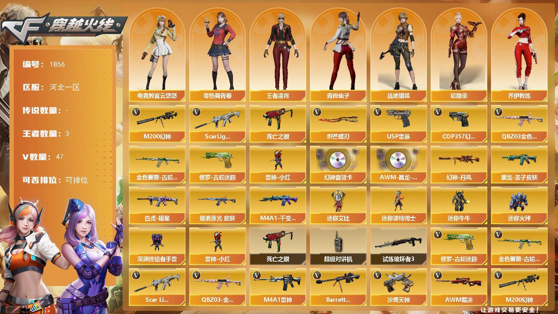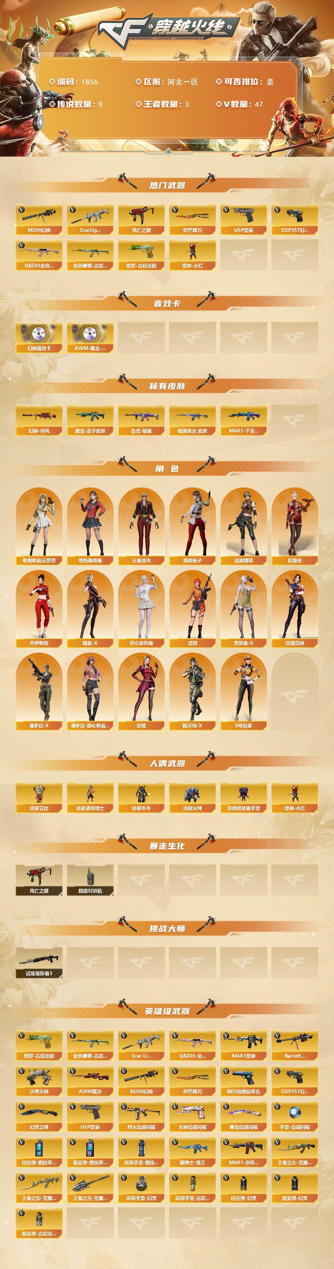 - [16321004]黑龙江区-35V-1王者武器数-0炫金武器数 【热门武器】:QBZ03-金色蔷薇,M200-幻神,死亡之眼,白虎-电玩蓝兔,M4A1-黑骑士,沙鹰-修罗*2 【音效卡】:M4A1-黑骑士音效卡 【皮肤】:QBZ03-冠军之薇,雷神-冠军之魄,雷神-杨戬,雷神-宇航兔皮肤,火麒麟-冠军之心,火麒麟-平天大圣,毁灭-荣耀之怒,毁灭-英雄计划 皮肤,黑骑士-冠军之势,战神-紫绶金章皮肤,战神-流金岁月皮肤*2,屠龙-星耀 皮肤,龙啸-幻灵之哮 皮肤 【角色】:瞳,机械姬,王者复仇,奇洋探员,修道士,云海玲珑,暗夜-X,嘉年华灵狐,娟娟,灵狐者-X,灵狐者-七夕宝贝,麻雀,潘多拉-X,兔囡囡,新娜塔莎,樱-战斗天使,幽 【人偶武器】:AWM-灵狐-15周年嘉年华,迷你牛牛,迷你艾比,迷你超能女侍 【暴走生化】:死亡之眼 【英雄级武器】:AK47-火麒麟,M4A1-雷神,M4A1-黑骑士,M4A1-龙血,黑武士-锦绣游龙,FAMAS G2-天戎,QBZ03-金色蔷薇,白虎-电玩蓝兔,加利尔ACE-天袭,AWM-天龙,Barrett-毁灭,AWM-裁决,M200-幻神,沙鹰-修罗*2,沙鹰-天神,COP 357-云龙,屠龙,麒麟刺,王者之啸-觉醒版,高爆手雷-云龙*4,手雷-热带奇洋,闪光弹-云龙*2,烟雾弹-竞技荣光,M4A1-赤狱骑士 【道具】:CFS限定背包,EP战队炫彩背包,奇洋探员-海龟背包,战舰背包,炫彩背包,背包-洛丽塔,哔哩哔哩名片,绿色巨人,灵魂忍者*2,变异宝贝,妖姬,迷雾幽灵,生化弹匣,夺命之镰,防化服*2,金色流光-枪王排位*2,枪王排位28赛季金色流光,枪王排位29赛季金色流光,电玩兔兔表情,EP战队名片,EP战队喷图,EP战队击杀图标,防弹头盔*3,防弹衣*3,C4工具钳*2,手雷包*2 【特殊枪械】:1黑骑士