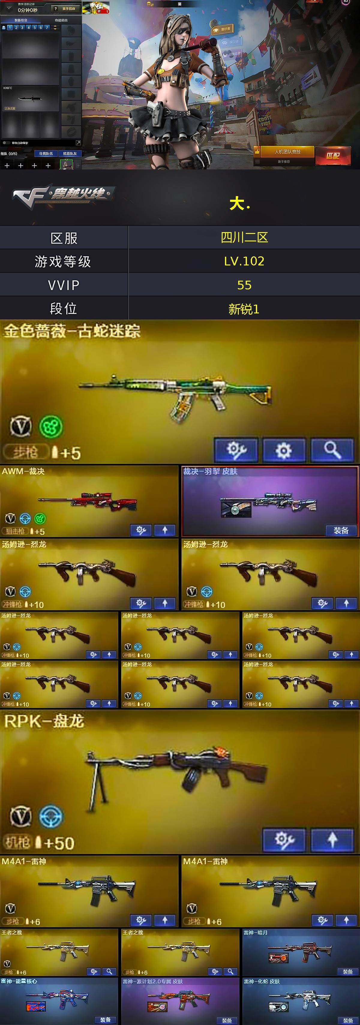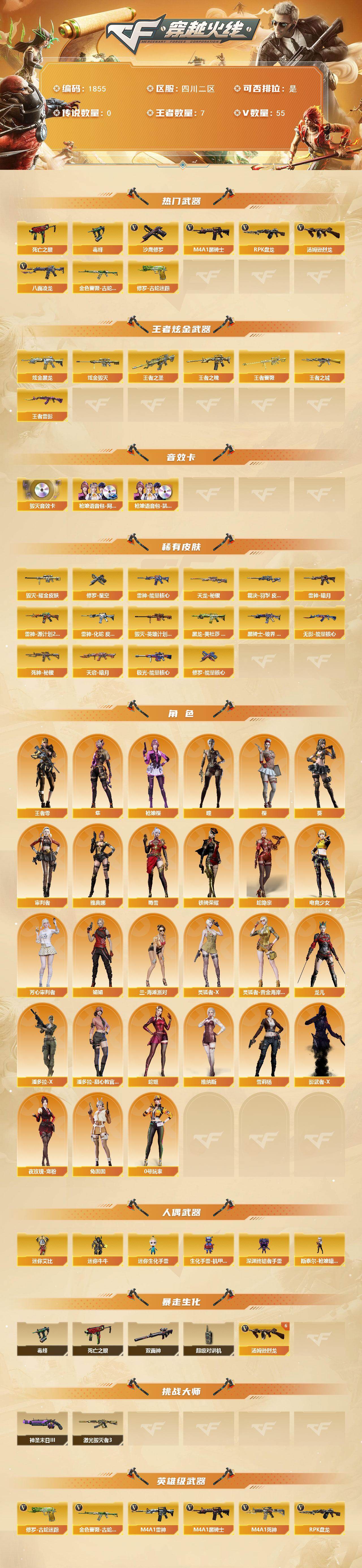 [16173276]四川二区-55V-7王者-3炫金 【热门武器】:金色蔷薇-古蛇迷踪,修罗-古蛇迷踪,八面凌龙,死亡之眼*2,毒蜂,M4A1-黑骑士,汤姆逊-烈龙*8,RPK-盘龙,沙鹰-修罗*2 【王者炫金武器】:王者之圣,王者之城,王者之魄,王者雷影,王者蔷薇,炫金黑龙*2,炫金毁灭 【音效卡】:Barrett-毁灭音效卡,枪娘语音包-阿敏,枪娘语音包-凯萨林 【皮肤】:裁决-羽掣 皮肤,雷神-暗月,雷神-能量核心,雷神-源计划2.0专属 皮肤,雷神-化蛇 皮肤,毁灭耀金皮肤,毁灭-英雄计划 皮肤,黑龙-美杜莎 皮肤,黑骑士-破界 皮肤,无影-能量核心,死神-秘银,天启-暗月,天龙-秘银,极光-能量核心,修罗-能量核心,修罗-星空 【角色】:葵,樱,瞳,枪娘樱,隼,审判者,王者-零,蛇隐宗,电竞少女,芳心审判者,娟娟,兰-海滩派对,0号玩家,灵狐者-X,灵狐者-黄金海岸,龙儿,潘多拉-X,潘多拉-甜心教官,蛇姬,蜀雪,铁骑荣耀,兔囡囡,维纳斯,雪莉杨,夜玫瑰-宠粉,影武者-X,雅典娜 【人偶武器】:斯泰尔-枪娘暗刃,迷你牛牛,迷你生化手雷,生化手雷-机甲核心,深渊终结者手雷,迷你艾比 【暴走生化】:毒蜂,双面神,死亡之眼*2,超级对讲机 【挑战大师】:激光毁灭者III,神圣爆裂者-末日III 【英雄级武器】:M4A1-千变,AK47-火麒麟*2,M4A1-雷神*2,M4A1-黑骑士,AK47-无影,M4A1-死神*2,AK47-黑武士,AN94-超新星,AK47-黑鲨,八面凌龙,金色蔷薇-古蛇迷踪,王者之魄-觉醒版,AK-47-猩红传说,AWM-天龙,Barrett-毁灭*2,Barrett-极光,AWM-裁决,RPK-盘龙,汤姆逊-烈龙*8,沙鹰-修罗*2,沙鹰-天神*2,修罗-古蛇迷踪,屠龙*3,龙啸,擎天,麒麟刺*5,王者之锋-觉醒版,高爆手雷-竞技荣光,高爆手雷-古蛇迷踪,烟雾弹-古蛇迷踪,M4A1-赤狱骑士 【道具】:CFS限定背包,云山科技背包,亚洲杯纪念炫彩背包,冰冰企鹅背包,古蛇迷踪炫彩背包,战舰背包,炫彩背包,白狐背包,背包-洛丽塔,超级背包,终极猎手-秦魂将军,救世主-黑桃战神,黄金生化钩,绿色巨人,灵魂忍者*2,变异宝贝,迷雾幽灵,生化弹匣,夺命之镰,防化服*3,枪王排位28赛季金色流光,枪王排位29赛季金色流光,古蛇迷踪打击特效,蛇隐宗表情,EP战队名片