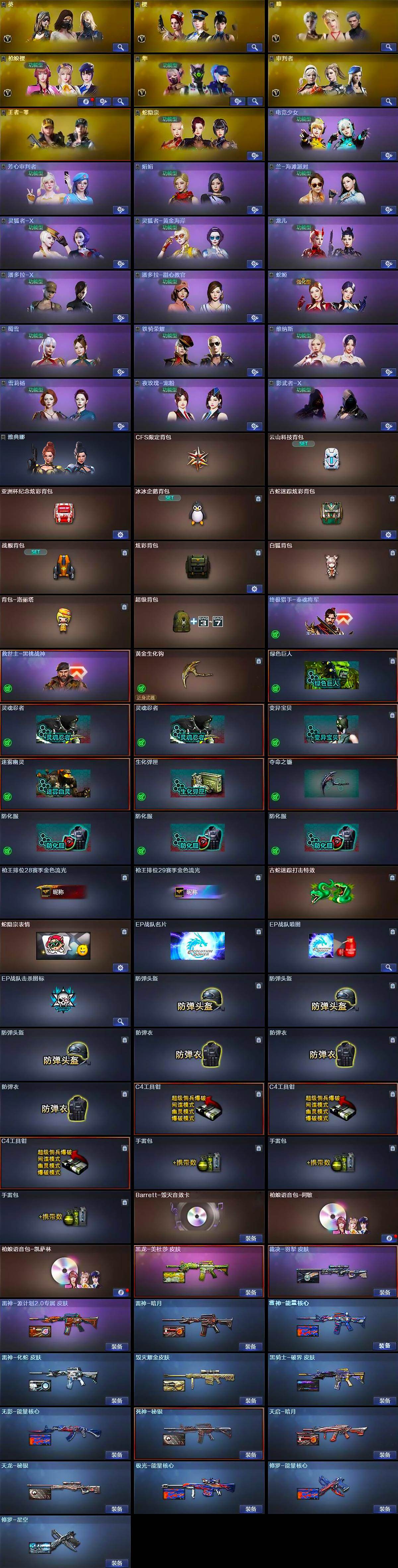 【道具】:CFS限定背包,云山科技背包,亚洲杯纪念炫彩背包,冰冰企鹅背包,古蛇迷踪炫彩背包,战舰背包,炫彩背包,白狐背包,背包-洛丽塔,超级背包,终极猎手-秦魂将军,救世主-黑桃战神,黄金生化钩,绿色巨人,灵魂忍者*2,变异宝贝,迷雾幽灵,生化弹匣,夺命之镰,防化服*3,枪王排位28赛季金色流光,枪王排位29赛季金色流光,古蛇迷踪打击特效,蛇隐宗表情,EP战队名片