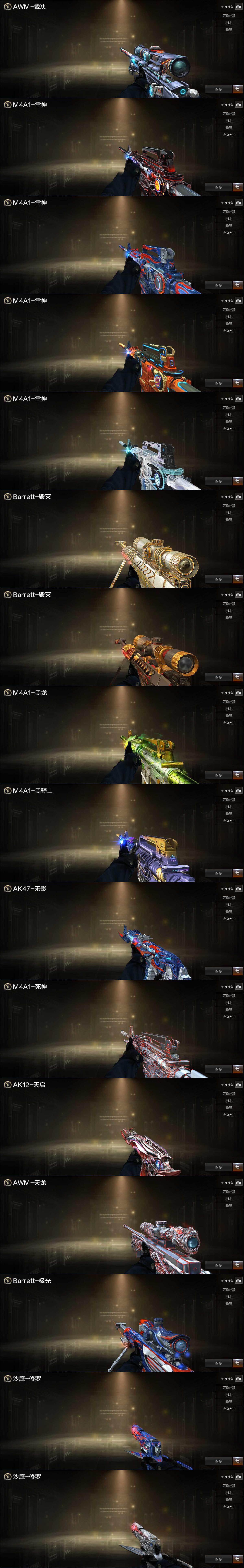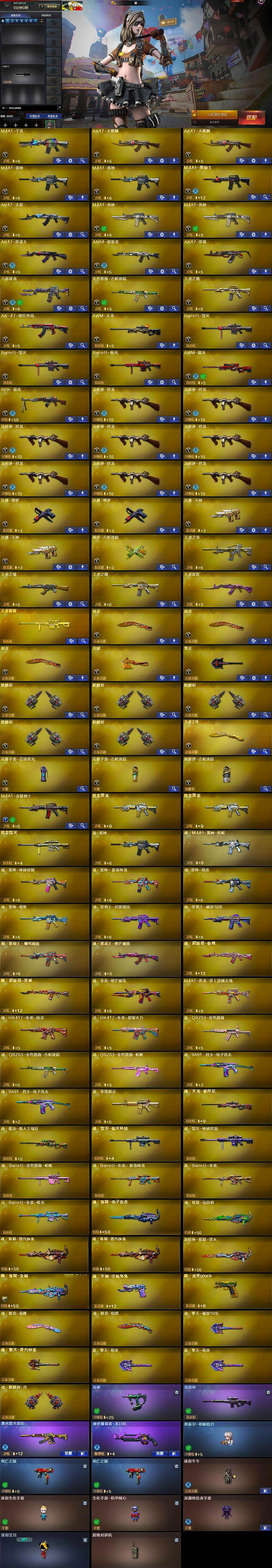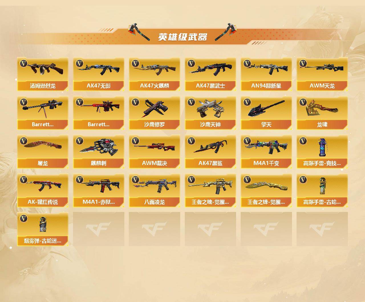 【英雄级武器】:M4A1-千变,AK47-火麒麟*2,M4A1-雷神*2,M4A1-黑骑士,AK47-无影,M4A1-死神*2,AK47-黑武士,AN94-超新星,AK47-黑鲨,八面凌龙,金色蔷薇-古蛇迷踪,王者之魄-觉醒版,AK-47-猩红传说,AWM-天龙,Barrett-毁灭*2,Barrett-极光,AWM-裁决,RPK-盘龙,汤姆逊-烈龙*8,沙鹰-修罗*2,沙鹰-天神*2,修罗-古蛇迷踪,屠龙*3,龙啸,擎天,麒麟刺*5,王者之锋-觉醒版,高爆手雷-竞技荣光,高爆手雷-古蛇迷踪,烟雾弹-古蛇迷踪,M4A1-赤狱骑士