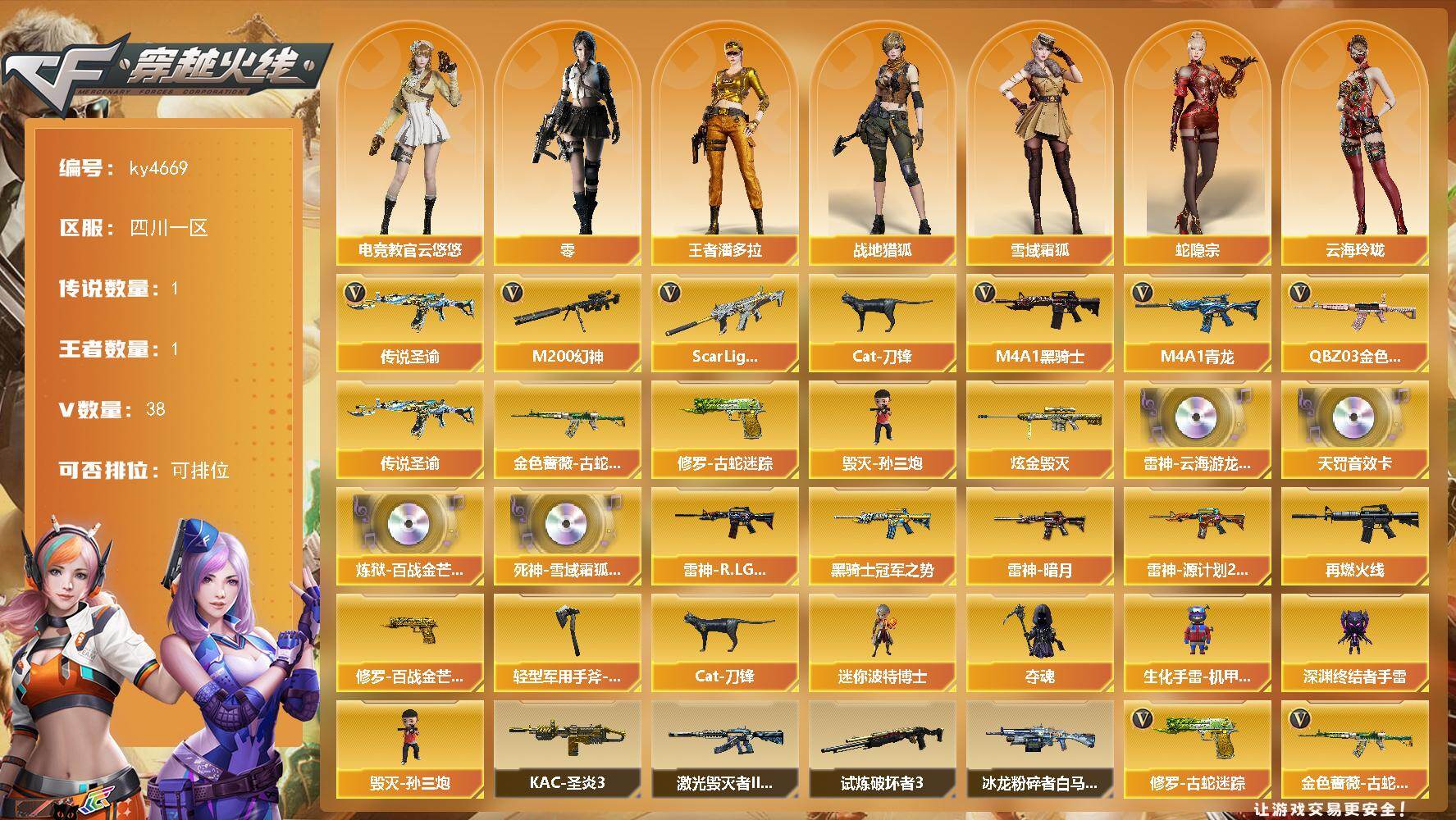 [16140331]四川一区-38V-1王者-1炫金 【传说武器】:传说圣谕 【热门武器】:传说圣谕,QBZ03-金色蔷薇,Scar Light-白虎,M4A1-青龙,M200-幻神,金色蔷薇-古蛇迷踪,修罗-古蛇迷踪,Cat-刀锋,M4A1-黑骑士*2,毁灭-孙三炮 【王者炫金武器】:炫金毁灭 【音效卡】:M4A1-雷神-云海游龙音效卡,QBZ03-天罚音效卡,炼狱-百战金芒-庆典舞曲音效卡,死神-雪域霜狐-怀旧音效卡 【皮肤】:雷神-暗月,雷神-R.LGD-CFPLS18冠军,雷神-源计划2.0专属 皮肤,M4A1-再燃火线,黑骑士-冠军之势,修罗-百战金芒 皮肤,轻型军用手斧-再燃火线 【角色】:零,电竞教官-云悠悠,战地猎狐,王者潘多拉,雪域霜狐,蛇隐宗,奇洋探员,云海玲珑,暗夜-X,电竞少女,芳心审判者,飞虎队-X,风暴女,灵狐-花神,灵狐者-X,潘多拉-X,蛇姬,斯沃特-X,维纳斯,新娜塔莎,游珑儿,智影 【人偶武器】:毁灭-孙三炮,Cat-刀锋,迷你波特博士,夺魂,生化手雷-机甲核心*2,深渊终结者手雷 【挑战大师】:冰龙粉碎者-白马银枪,激光毁灭者III-白马银枪,试炼破坏者III,KAC-圣炎切割者III 【英雄级武器】:AK47-火麒麟,M4A1-雷神,M4A1-黑骑士*2,AN94-超新星,AK47-黑鲨,M4A1-青龙,Scar Light-白虎,QBZ03-天罚,黑武士-锦绣游龙,金色蔷薇-古蛇迷踪,QBZ03-金色蔷薇,M4A1-猎神,黑骑士-海王,AWM-裁决,M200-幻神,炼狱-百战金芒,炼狱-悦蓝-觉醒版,烈龙-云海游龙,AA-12-雷霆,沙鹰-天神,修罗-古蛇迷踪,龙啸,幻灵之锋,擎天-云海游龙,麒麟刺-百战金芒,高爆手雷-幻灵,高爆手雷-竞技荣光,手雷-云海游龙,高爆手雷-古蛇迷踪,闪光弹-幻灵,闪光弹-竞技荣光,烟雾弹-幻灵,烟雾弹-竞技荣光,烟雾弹-古蛇迷踪,M4A1-赤狱骑士 【道具】:CFS限定背包,云山科技背包,云海游龙炫彩背包,亚洲杯纪念炫彩背包,古蛇迷踪炫彩背包,百战金芒炫彩背包,超级背包,雪域霜狐炫彩背包,女皇终结者-魔龙之吻,救世主-黑桃战神,黄金生化钩,绿色巨人,灵魂忍者,变异宝贝,迷雾幽灵,夺命之镰,防化服*3,金色流光-枪王排位,星辰流光-枪王排位,流光-鎏金之域,枪王排位28赛季金色流光,枪王排位29赛季金色流光,语音