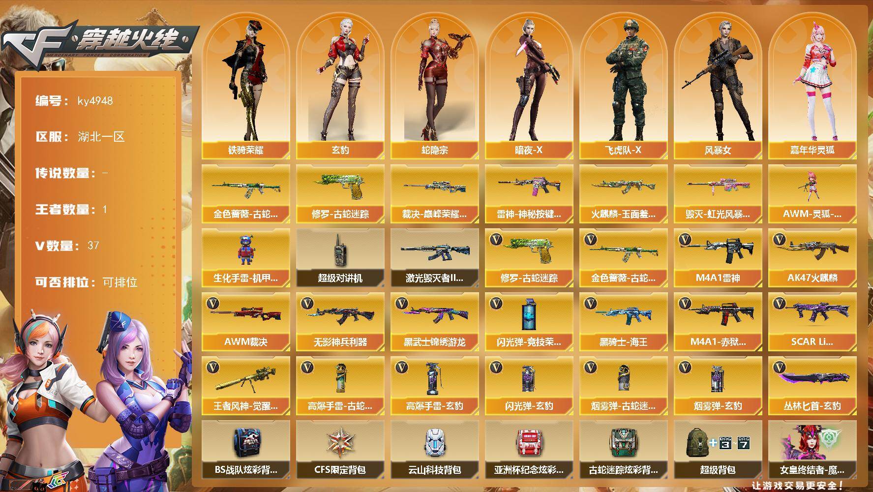 [16173819]湖北一区-37V-1王者-0炫金 【热门武器】:金色蔷薇-古蛇迷踪,修罗-古蛇迷踪 【皮肤】:裁决-巅峰荣耀 皮肤,雷神-神秘按键 皮肤,火麒麟-玉面羞花 皮肤,毁灭-虹光风暴 皮肤 【角色】:玄豹,蛇隐宗,暗夜-X,飞虎队-X,风暴女,嘉年华灵狐,灵狐者-X,潘多拉-X,潘多拉-甜心教官,蛇姬,斯沃特-X,铁骑荣耀 【人偶武器】:AWM-灵狐-15周年嘉年华*2,生化手雷-机甲核心*2 【暴走生化】:超级对讲机 【挑战大师】:激光毁灭者III-白马银枪 【英雄级武器】:AK47-火麒麟,M4A1-雷神,无影-神兵利器*2,黑武士-锦绣游龙,金色蔷薇-古蛇迷踪,SCAR Light-玄豹,黑骑士-海王,AWM-裁决,王者风神-觉醒版,Anaconda-玄豹,修罗-古蛇迷踪,丛林匕首-玄豹,高爆手雷-古蛇迷踪,高爆手雷-玄豹*7,闪光弹-竞技荣光*3,闪光弹-玄豹*7,烟雾弹-古蛇迷踪,烟雾弹-玄豹*7,M4A1-赤狱骑士 【道具】:BS战队炫彩背包,CFS限定背包,云山科技背包,亚洲杯纪念炫彩背包,古蛇迷踪炫彩背包,超级背包,女皇终结者-魔龙之吻,救世主-黑桃战神,绿色巨人,灵魂忍者*2,变异宝贝,迷雾幽灵*2,夺命之镰,防化服*3,流光-鎏金之域,枪王排位28赛季金色流光,枪王排位29赛季金色流光,古蛇迷踪打击特效,蛇隐宗表情,EP战队名片,EP战队喷图,EP战队击杀图标,防弹头盔*3,防弹衣*3,C4工具钳*3,手雷包*3 【特殊枪械】: