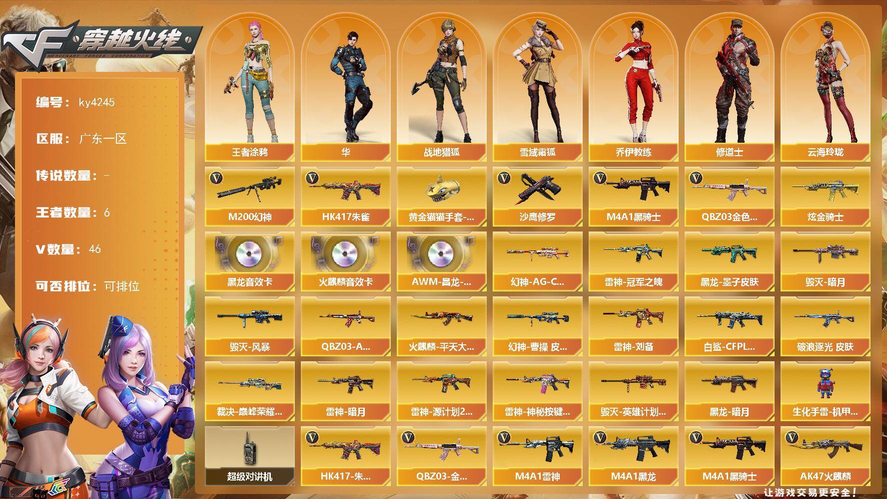 [16173772]广东一区-46V-6王者-1炫金 【热门武器】:QBZ03-金色蔷薇,HK417-朱雀,M200-幻神,M4A1-黑骑士,沙鹰-修罗,黄金猫猫手套-白鲨 【王者炫金武器】:炫金骑士 【音效卡】:AK47-火麒麟音效卡,M4A1-黑龙音效卡,AWM-昌龙-怀旧音效卡*2 【皮肤】:幻神-曹操 皮肤,幻神-AG-CFPL S24冠军 皮肤,白虎-白鲨-CFPLS23冠军,QBZ03-AG-CFPLS19冠军,金色蔷薇-破浪逐光 皮肤,裁决-巅峰荣耀 皮肤,雷神-暗月,雷神-冠军之魄,雷神-刘备 皮肤,雷神-源计划2.0专属 皮肤,雷神-神秘按键 皮肤,火麒麟-平天大圣,毁灭-暗月,毁灭-风暴,毁灭-英雄计划 皮肤,黑龙-暗月,黑龙-墨子皮肤 【角色】:华,战地猎狐,王者涂鸦,雪域霜狐,奇洋探员,乔伊教练,修道士,云海玲珑,北极狐-X,风暴女,葵-赛博朋克,灵狐者-X,灵狐者-黄金海岸,龙儿-小淘气,麻雀,斯沃特-X 【人偶武器】:生化手雷-机甲核心 【暴走生化】:超级对讲机 【英雄级武器】:AK47-火麒麟,M4A1-黑龙,M4A1-雷神,M4A1-黑骑士,AK12-天启,HK417-朱雀,黑武士-锦绣游龙,超新星-热带奇洋,QBZ03-金色蔷薇,天启-悦智-觉醒版,AK-47-猩红传说,王者冰魄-觉醒版,M4A1-雷霆王者-觉醒版,Barrett-毁灭,AWM-裁决,M200-幻神,沙鹰-修罗,沙鹰-天神,柯尔特-竞技荣光*3,屠龙,麒麟刺,擎天-竞技荣光*2,龙啸-热带奇洋,高爆手雷-雷霆,高爆手雷-竞技荣光*6,高爆手雷-云龙,手雷-热带奇洋,闪光弹-雷暴,闪光弹-竞技荣光*5,闪光弹-云龙,闪光弹-雷霆王者-觉醒版,烟雾弹-竞技荣光*7,M4A1-赤狱骑士 【道具】:BS战队炫彩背包,CFS限定背包,云山科技背包,亚洲杯纪念炫彩背包,奇洋探员-海龟背包,热带奇洋炫彩背包,背包-洛丽塔,雪域霜狐炫彩背包,女皇终结者-魔龙之吻,救世主-黑桃战神,黄金生化钩,绿色巨人,灵魂忍者,迷雾幽灵,生化弹匣,夺命之镰,防化服*3,星辰流光-枪王排位,流光-鎏金之域,流光-再燃火线,枪王排位28赛季金色流光,热带奇洋表情,EP战队名片,EP战队喷图,EP战队击杀图标,防弹头盔*3,防弹衣*4,C4工具钳*4,手雷包*5 【特殊枪械】:1黑骑士