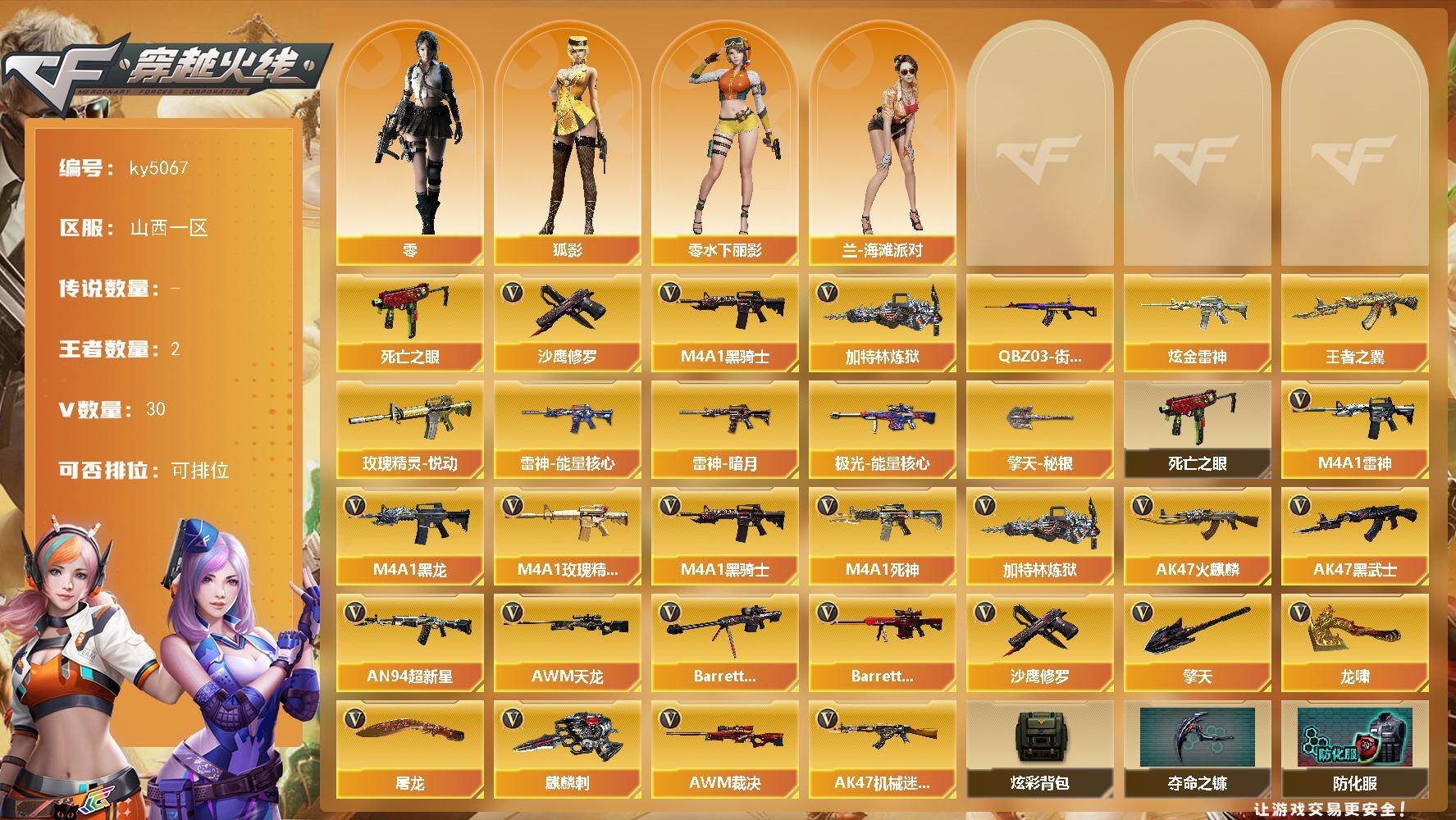 [16173821]山西一区-30V-2王者-1炫金 【热门武器】:死亡之眼*2,QBZ03-街机,M4A1-黑骑士*2,加特林-炼狱,沙鹰-修罗*5 【王者炫金武器】:王者之翼,玫瑰精灵-悦动,炫金雷神 【皮肤】:雷神-暗月,雷神-能量核心,极光-能量核心,擎天-秘银 【角色】:零,狐影,兰-海滩派对,零-水下丽影 【暴走生化】:死亡之眼*2 【英雄级武器】:AK47-火麒麟*2,M4A1-黑龙,M4A1-雷神,M4A1-黑骑士*2,M4A1-死神,AK47-黑武士,AN94-超新星,AK47-机械迷城,M4A1-玫瑰精灵,AWM-天龙*2,Barrett-毁灭*2,Barrett-极光*2,AWM-裁决,加特林-炼狱,沙鹰-修罗*5,屠龙,龙啸*2,擎天,麒麟刺 【道具】:炫彩背包,夺命之镰,防化服,防弹头盔,防弹衣,C4工具钳,手雷包 【特殊枪械】:2黑骑士,1炼狱