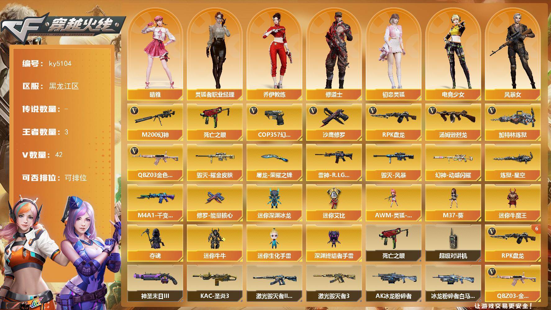 [16173839]黑龙江区-42V-3王者-0炫金 【热门武器】:QBZ03-金色蔷薇,M200-幻神,死亡之眼,汤姆逊-烈龙*2,RPK-盘龙*6,加特林-炼狱,COP 357-幻灵,沙鹰-修罗 【皮肤】:幻神-动感闪耀 皮肤,雷神-R.LGD-CFPLS18冠军,毁灭耀金皮肤,毁灭-风暴,M4A1-千变-孔明皮肤,炼狱-星空,修罗-能量核心,屠龙-荣耀之锋 【角色】:晴雅,乔伊教练,修道士,初恋灵狐,电竞少女,风暴女,嘉年华灵狐,娟娟,猎狐者-追月,灵狐者-X,灵狐者-黄金海岸,灵狐者-职业经理,龙儿-小淘气,玫瑰花神,潘多拉-X,潘多拉-甜心教官,潜龙队-X,斯沃特-X,兔囡囡,新娜塔莎,樱-战斗天使,影武者-X 【人偶武器】:AWM-灵狐-15周年嘉年华*2,M37-葵,迷你深渊冰龙,迷你牛魔王,夺魂,迷你牛牛,迷你生化手雷,深渊终结者手雷*3,迷你艾比 【暴走生化】:死亡之眼,超级对讲机 【挑战大师】:AK47-冰龙粉碎者,冰龙粉碎者-白马银枪,激光毁灭者III-白马银枪,激光毁灭者III*4,KAC-圣炎切割者III,神圣爆裂者-末日III*2 【英雄级武器】:AK47-火麒麟,M4A1-雷神,AK12-天启,AK47-黑鲨,M4A1-龙血,无影-神兵利器,QBZ03-金色蔷薇,AK-47-猩红传说*2,黑骑士-海王*2,Barrett-毁灭,M200-幻神,王者凰鸣-觉醒版,RPK-盘龙*6,加特林-炼狱,炼狱-风暴,汤姆逊-烈龙*2,沙鹰-修罗,COP 357-幻灵,王者之灵-觉醒版,天神-动感闪耀,马来剑-夜魔,擎天,屠龙-动感闪耀,丛林匕首-玄豹,高爆手雷-夜魔,手雷-动感闪耀,高爆手雷-玄豹,闪光弹-夜魔,闪光弹-幻灵,闪光弹-玄豹,烟雾弹-夜魔,烟雾弹-竞技荣光,烟雾弹-玄豹,烟雾弹-雷霆王者-觉醒版,M4A1-赤狱骑士 【道具】:XROCK炫彩背包,超级背包*2,黄金生化钩,绿色巨人,灵魂忍者*2,变异宝贝,妖姬,迷雾幽灵*2,生化弹匣,夺命之镰,防化服*2,金色流光-枪王排位*2,星辰流光-枪王排位,枪王排位28赛季金色流光,枪王排位29赛季金色流光,斯沃特表情,动感闪耀表情,C4-红龙,防弹头盔*5,防弹衣*5,C4工具钳*3,手雷包*2 【特殊枪械】:2烈龙,6盘龙,1炼狱