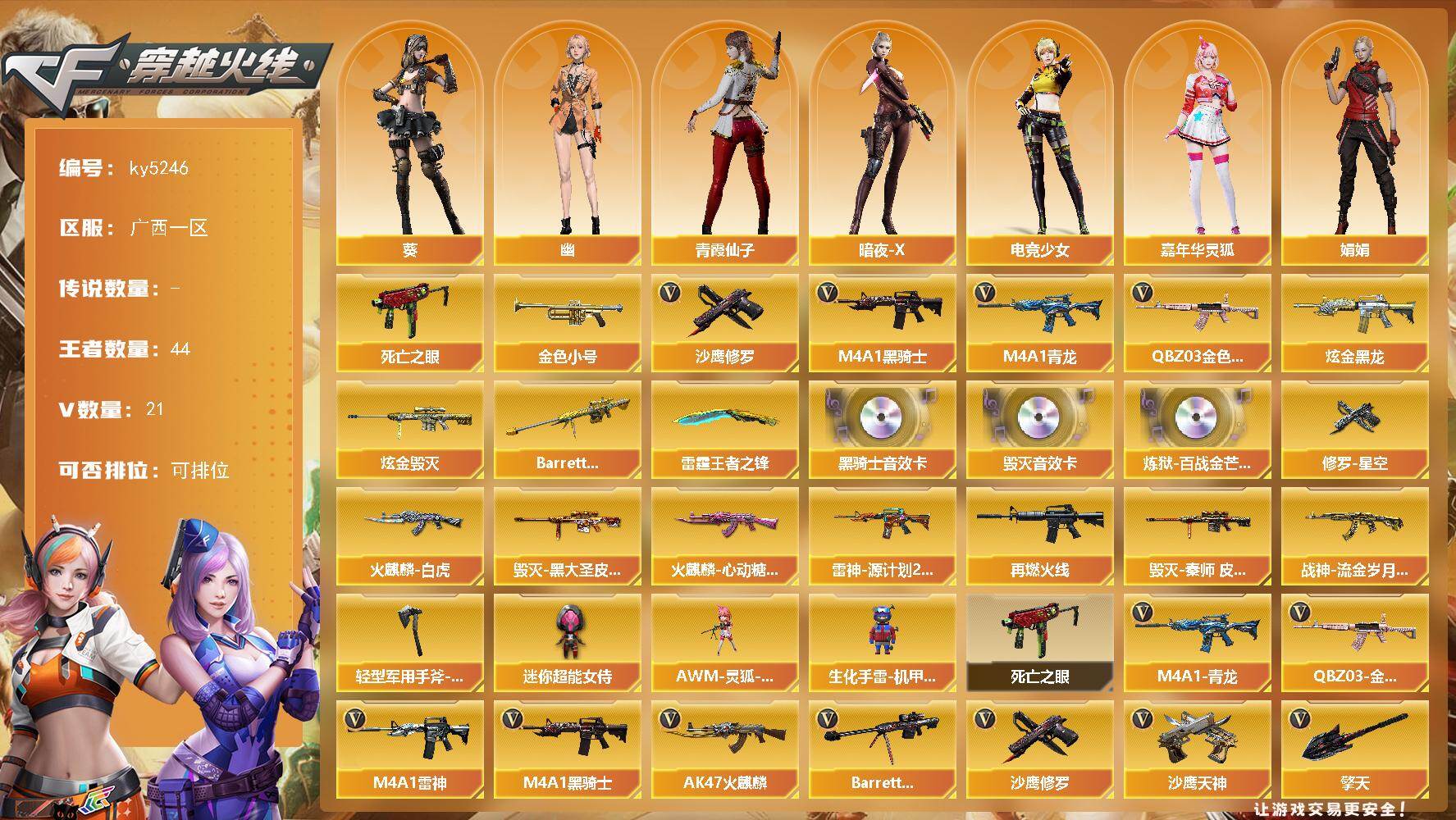 [16173904]广西一区-21V-44王者-2炫金 【热门武器】:QBZ03-金色蔷薇,M4A1-青龙,死亡之眼,金色小号,M4A1-黑骑士,沙鹰-修罗 【王者炫金武器】:Barrett-雷霆王者,雷霆王者之锋*2,炫金黑龙,炫金毁灭 【音效卡】:M4A1-黑骑士音效卡,Barrett-毁灭音效卡,炼狱-百战金芒-庆典舞曲音效卡 【皮肤】:雷神-源计划2.0专属 皮肤,M4A1-再燃火线,火麒麟-白虎,火麒麟-心动糖果,毁灭-黑大圣皮肤,毁灭-秦师 皮肤,战神-流金岁月皮肤,修罗-星空,轻型军用手斧-再燃火线 【角色】:葵,暗夜-X,电竞少女,嘉年华灵狐,娟娟,0号玩家,灵狐者-黄金海岸,龙儿-小淘气,麻雀,玫瑰花神,萌儿,潘多拉-X,青霞仙子,斯沃特-X,兔囡囡,维纳斯,雪莉杨,雪莉杨-摸金校尉,夜玫瑰-宠粉,影武者-X,幽 【人偶武器】:AWM-灵狐-15周年嘉年华,生化手雷-机甲核心,迷你超能女侍 【暴走生化】:死亡之眼 【英雄级武器】:AK47-火麒麟,M4A1-雷神*2,M4A1-黑骑士,M4A1-青龙,无影-神兵利器,黑武士-锦绣游龙,QBZ03-金色蔷薇,M4A1-雷霆王者-觉醒版,Barrett-毁灭,AWM-裁决,炼狱-百战金芒,沙鹰-修罗,沙鹰-天神,COP 357-雷霆王者-觉醒版*3,屠龙*2,擎天,麒麟刺-百战金芒,闪光弹-雷霆王者-觉醒版,烟雾弹-雷霆王者-觉醒版*3 【道具】:CFS限定背包,全能枪王背包,百战金芒炫彩背包,女皇终结者-魔龙之吻,救世主-黑桃战神,绿色巨人,灵魂忍者*2,变异宝贝,迷雾幽灵,生化弹匣,夺命之镰,防化服*2,金色流光-枪王排位*2,枪王排位28赛季金色流光,枪王排位29赛季金色流光,语音特效-盛典烟火,萌萌小葵表情,电玩兔兔表情,EP战队名片,EP战队喷图,EP战队击杀图标,防弹头盔*3,防弹衣*3,C4工具钳*2,手雷包*3 【特殊枪械】:1黑骑士