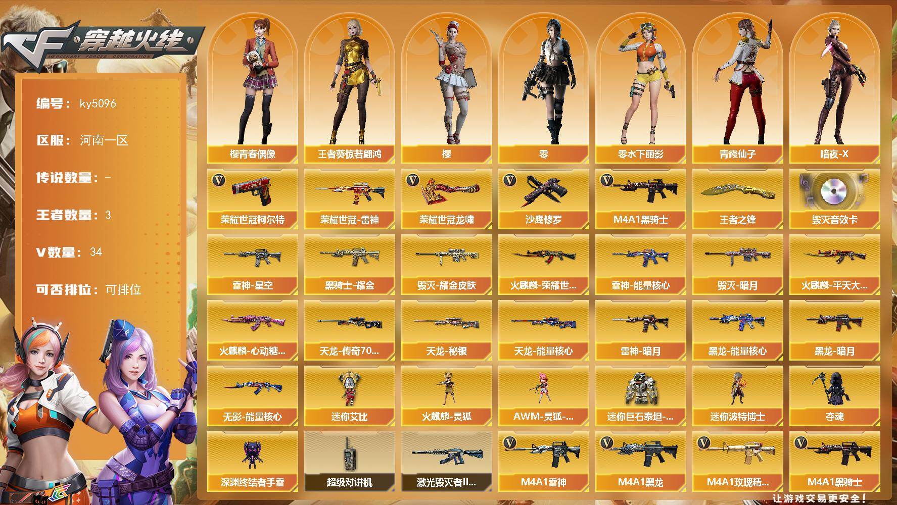 [16173832]河南一区-34V-3王者-0炫金 【热门武器】:荣耀世冠-雷神,荣耀世冠-柯尔特,M4A1-黑骑士,沙鹰-修罗*3,荣耀世冠-龙啸 【王者炫金武器】:王者之锋*2 【音效卡】:Barrett-毁灭音效卡 【皮肤】:雷神-暗月,雷神-能量核心,雷神-星空,火麒麟-平天大圣*2,火麒麟-荣耀世冠AG,火麒麟-心动糖果,毁灭-暗月,毁灭耀金皮肤,黑龙-能量核心,黑龙-暗月,黑骑士耀金皮肤,无影-能量核心,天龙-秘银,天龙-能量核心,AWM-天龙-传奇70KG 【角色】:零,樱,王者葵-惊若翩鸿,暗夜-X,芳心审判者,飞虎队-X,虎妞,嘉年华灵狐,娟娟,兰-海滩派对,兰-新年限定,0号玩家,零-水下丽影,灵狐者-X,龙儿,曼陀罗-X,萌儿,潘多拉-X,潘多拉-甜心教官,潜龙队-X,青霞仙子,斯沃特-X,兔囡囡,维纳斯,新娜塔莎,雪莉杨-摸金校尉,夜玫瑰-宠粉,樱-青春偶像 【人偶武器】:火麒麟-灵狐,AWM-灵狐-15周年嘉年华,迷你波特博士,夺魂,深渊终结者手雷,迷你艾比,迷你巨石泰坦-魔花研究所 【暴走生化】:超级对讲机 【挑战大师】:激光毁灭者III-白马银枪 【英雄级武器】:M4A1-千变,AK47-火麒麟*3,M4A1-黑龙*2,M4A1-雷神,M4A1-黑骑士,AK47-无影*2,AK47-机械迷城,无影-神兵利器,黑武士-锦绣游龙,M4A1-玫瑰精灵,王者之幻-觉醒版,荣耀世冠-雷神,AWM-天龙*2,Barrett-毁灭*2,沙鹰-修罗*3,沙鹰-天神,荣耀世冠-柯尔特,屠龙,龙啸,擎天,麒麟刺*2,荣耀世冠-龙啸,M4A1-苍鸣雷神 【道具】:全能枪王背包,冰冰企鹅背包,战舰背包,炫彩背包,虎牙炫彩背包,超级背包,黄金超能特工背包,女皇终结者-魔龙之吻,绿色巨人,灵魂忍者,迷雾幽灵,夺命之镰,防化服*3,金色流光-枪王排位*2,星辰流光-枪王排位,枪王排位28赛季金色流光,枪王排位29赛季金色流光,防弹头盔*8,防弹衣*6,C4工具钳*6,手雷包*4 【特殊枪械】:1黑骑士