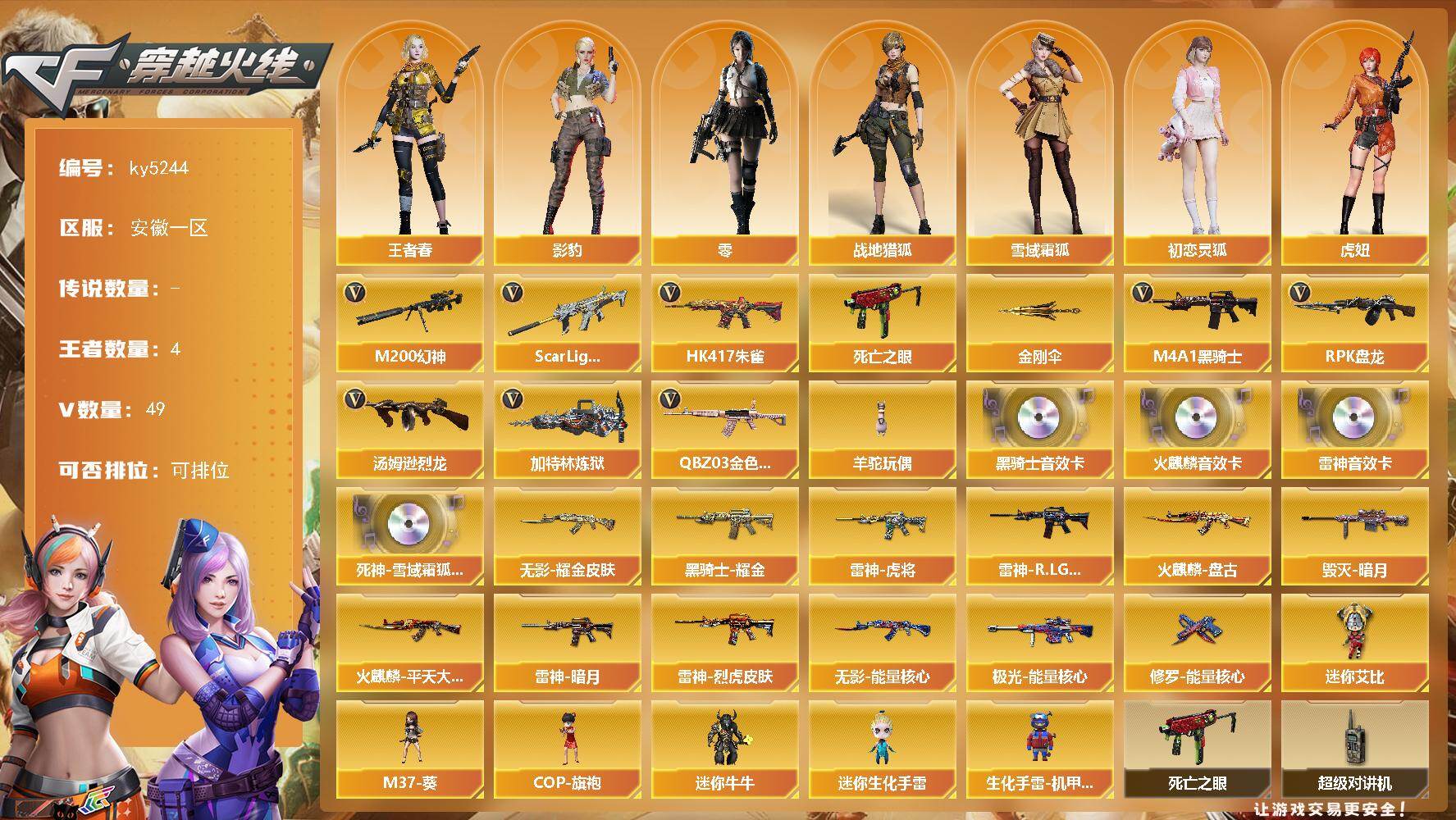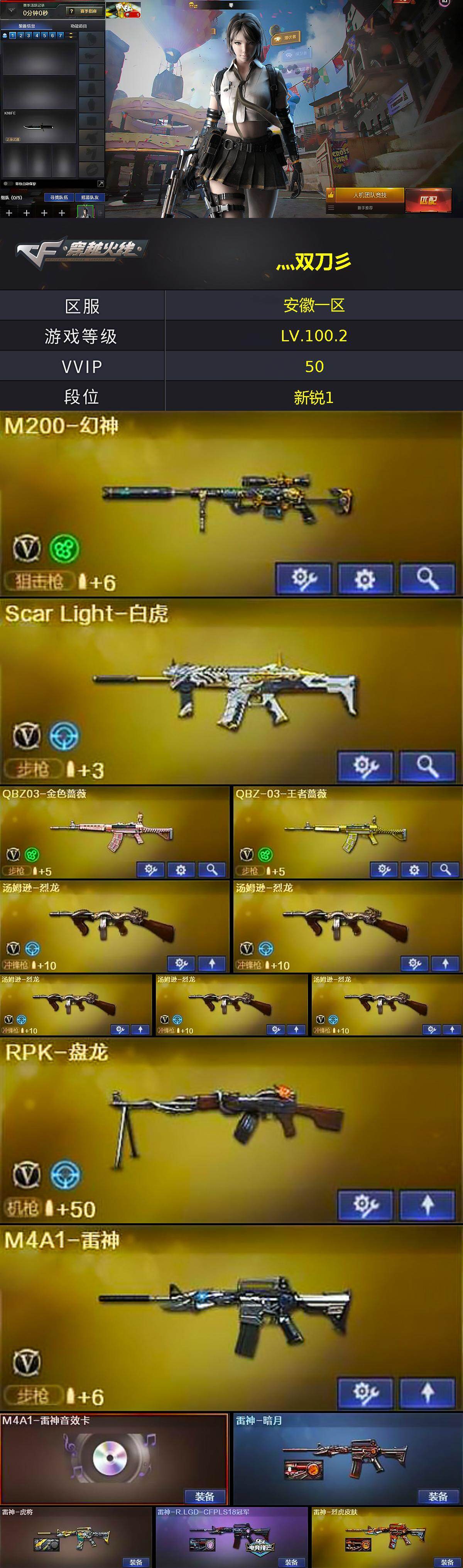 [16173888]安徽一区-49V-4王者-0炫金 【热门武器】:QBZ03-金色蔷薇,Scar Light-白虎,HK417-朱雀,M200-幻神,死亡之眼,M4A1-黑骑士,汤姆逊-烈龙*5,RPK-盘龙,加特林-炼狱,羊驼玩偶,金刚伞 【音效卡】:AK47-火麒麟音效卡,M4A1-雷神音效卡,M4A1-黑骑士音效卡,死神-雪域霜狐-怀旧音效卡 【皮肤】:雷神-暗月,雷神-虎将,雷神-R.LGD-CFPLS18冠军,雷神-烈虎皮肤,火麒麟-平天大圣,火麒麟-盘古,毁灭-暗月,黑骑士耀金皮肤,无影-能量核心,无影耀金皮肤,极光-能量核心,修罗-能量核心 【角色】:零,影豹,战地猎狐,王者春,雪域霜狐,初恋灵狐,虎妞,灵狐者-黄金海岸,斯沃特-X,影武者-X 【人偶武器】:M37-葵,COP-旗袍,迷你牛牛,迷你生化手雷*2,生化手雷-机甲核心*2,迷你艾比 【暴走生化】:死亡之眼,超级对讲机 【挑战大师】:激光毁灭者III-白马银枪,机甲撕裂者III 【英雄级武器】:AK47-火麒麟,M4A1-黑龙,M4A1-雷神,M4A1-黑骑士,AK47-无影,M4A1-死神,AK47-黑武士,AK12-天启,AN94-超新星,AK47-机械迷城,HK417-朱雀,Scar Light-白虎,黑武士-锦绣游龙,死神-雪域霜狐,M4A1-玫瑰精灵,QBZ03-金色蔷薇,王者火魄-觉醒版,王者之烈-觉醒版,QBZ-03-王者蔷薇-觉醒版,AWM-天龙,Barrett-毁灭,Barrett-极光,M200-幻神,RPK-盘龙,加特林-炼狱,盘龙-悦心-觉醒版,汤姆逊-烈龙*5,沙鹰-天神*5,屠龙,龙啸,擎天,麒麟刺,幻灵之锋,擎天-竞技荣光,高爆手雷-幻灵,高爆手雷-竞技荣光,闪光弹-幻灵,闪光弹-竞技荣光,烟雾弹-幻灵,烟雾弹-竞技荣光,M4A1-赤狱骑士 【道具】:CFS限定背包,云山科技背包,亚洲杯纪念炫彩背包,冰冰企鹅背包,炫彩背包,雪域霜狐炫彩背包,黑桃战神背包,终极猎手-秦魂将军,虚空终结者-暗域熔岩,女皇终结者-魔龙之吻,救世主-黑桃战神,绿色巨人,灵魂忍者*3,变异宝贝,迷雾幽灵*2,生化弹匣*2,夺命之镰,防化服*3,流光-鎏金之域,流光-再燃火线,语音特效-怀旧,雪域霜狐表情,斯沃特表情,EP战队名片,EP战队喷图,EP战队击杀图标,C4-沙漠,C4-再燃火线,防弹头盔*3,
