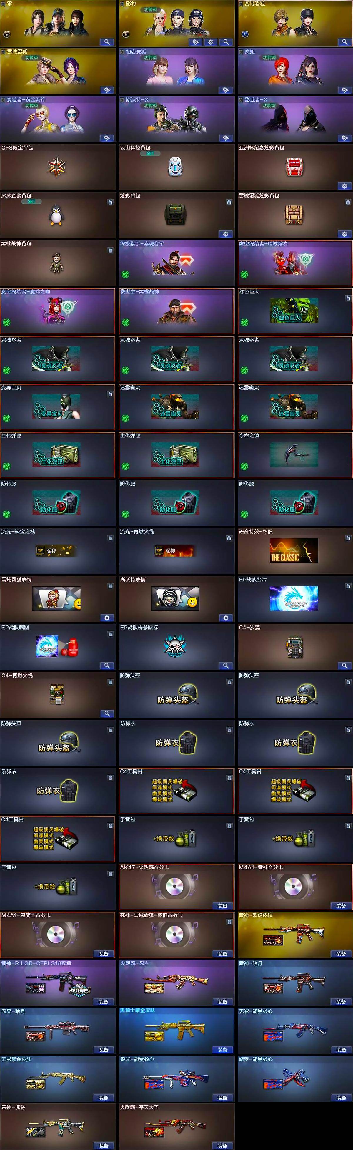 【道具】:CFS限定背包,云山科技背包,亚洲杯纪念炫彩背包,冰冰企鹅背包,炫彩背包,雪域霜狐炫彩背包,黑桃战神背包,终极猎手-秦魂将军,虚空终结者-暗域熔岩,女皇终结者-魔龙之吻,救世主-黑桃战神,绿色巨人,灵魂忍者*3,变异宝贝,迷雾幽灵*2,生化弹匣*2,夺命之镰,防化服*3,流光-鎏金之域,流光-再燃火线,语音特效-怀旧,雪域霜狐表情,斯沃特表情,EP战队名片,EP战队喷图,EP战队击杀图标,C4-沙漠,C4-再燃火线,防弹头盔*3,