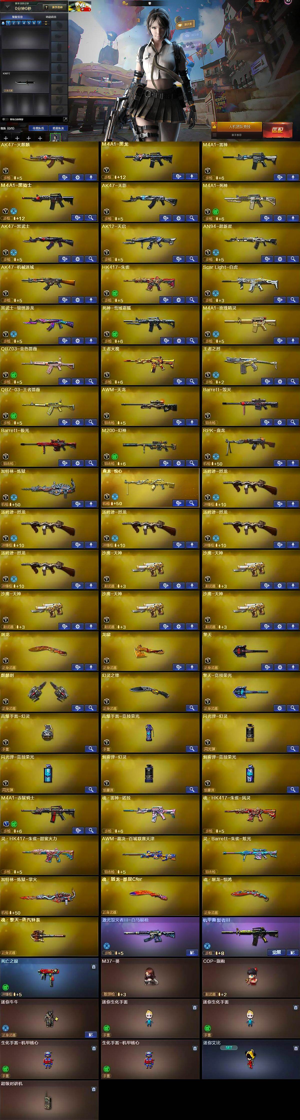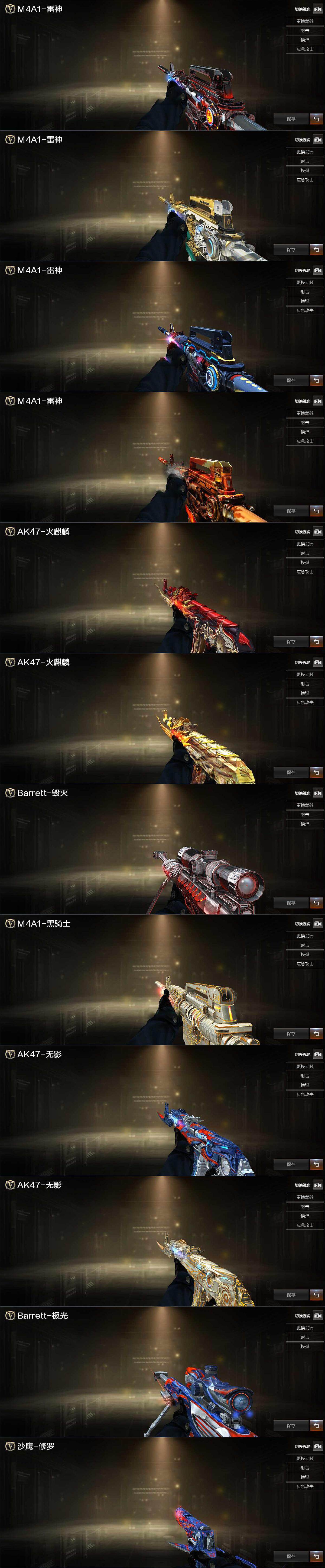 【英雄级武器】:AK47-火麒麟,M4A1-黑龙,M4A1-雷神,M4A1-黑骑士,AK47-无影,M4A1-死神,AK47-黑武士,AK12-天启,AN94-超新星,AK47-机械迷城,HK417-朱雀,Scar Light-白虎,黑武士-锦绣游龙,死神-雪域霜狐,M4A1-玫瑰精灵,QBZ03-金色蔷薇,王者火魄-觉醒版,王者之烈-觉醒版,QBZ-03-王者蔷薇-觉醒版,AWM-天龙,Barrett-毁灭,Barrett-极光,M200-幻神,RPK-盘龙,加特林-炼狱,盘龙-悦心-觉醒版,汤姆逊-烈龙*5,沙鹰-天神*5,屠龙,龙啸,擎天,麒麟刺,幻灵之锋,擎天-竞技荣光,高爆手雷-幻灵,高爆手雷-竞技荣光,闪光弹-幻灵,闪光弹-竞技荣光,烟雾弹-幻灵,烟雾弹-竞技荣光,M4A1-赤狱骑士