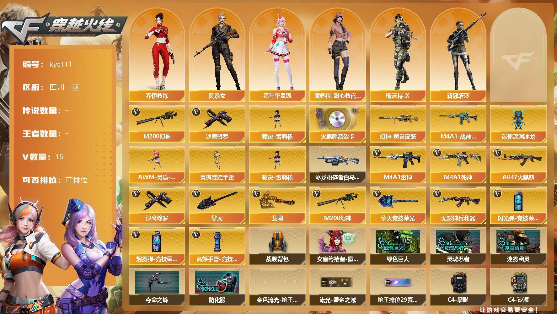 [16173835]四川一区-15V-0王者-0炫金 【热门武器】:M200-幻神,裁决-雪莉杨,沙鹰-修罗 【音效卡】:AK47-火麒麟音效卡 【皮肤】:M200-幻神-黄忠皮肤,M4A1-战神赵云 【角色】:乔伊教练,风暴女,嘉年华灵狐,潘多拉-甜心教官,斯沃特-X,新娜塔莎 【人偶武器】:裁决-雪莉杨,AWM-灵狐-15周年嘉年华*2,迷你深渊冰龙*2,灵狐娃娃手雷 【挑战大师】:冰龙粉碎者-白马银枪 【英雄级武器】:AK47-火麒麟,M4A1-雷神,M4A1-死神,无影-神兵利器,M200-幻神,沙鹰-修罗,龙啸,擎天,擎天-竞技荣光,高爆手雷-竞技荣光,闪光弹-竞技荣光,烟雾弹-竞技荣光*2 【道具】:战舰背包,女皇终结者-魔龙之吻,绿色巨人,灵魂忍者,迷雾幽灵,夺命之镰,防化服*3,金色流光-枪王排位*2,星辰流光-枪王排位,流光-鎏金之域,枪王排位28赛季金色流光,枪王排位29赛季金色流光,C4-黑曜,C4-沙漠,防弹头盔*3,防弹衣*3,C4工具钳*3,手雷包*3 【特殊枪械】: