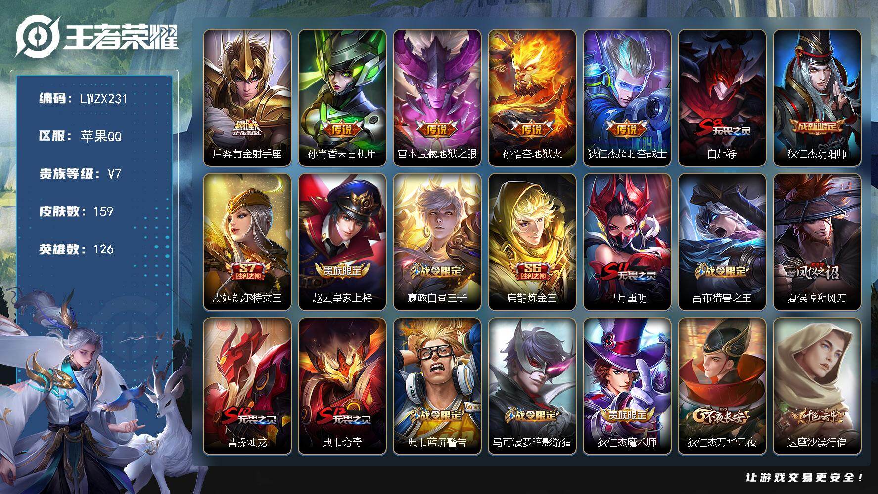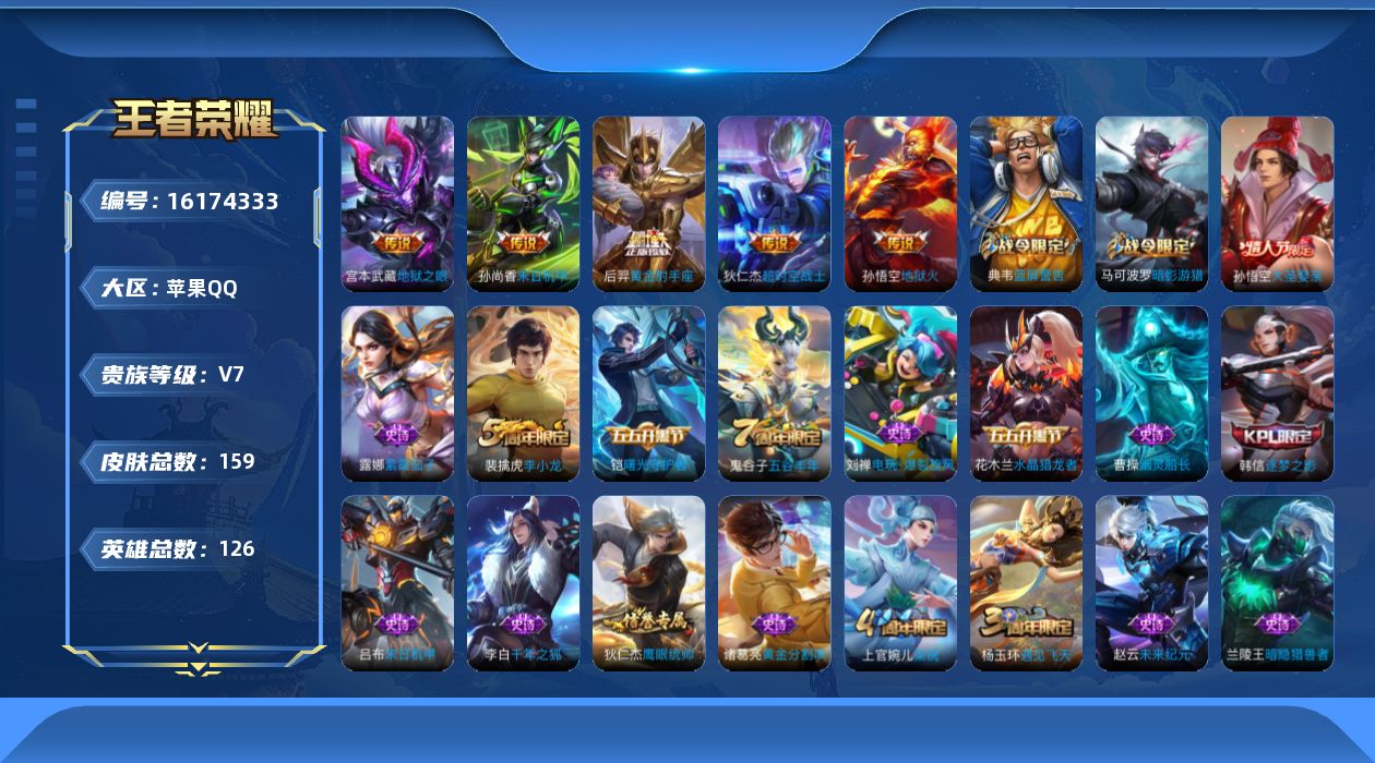 [16174333]【店主推荐捡漏号!可直接换绑】苹果Q-V7-永恒钻石II段位-126英雄-159皮肤-5传说-32史诗