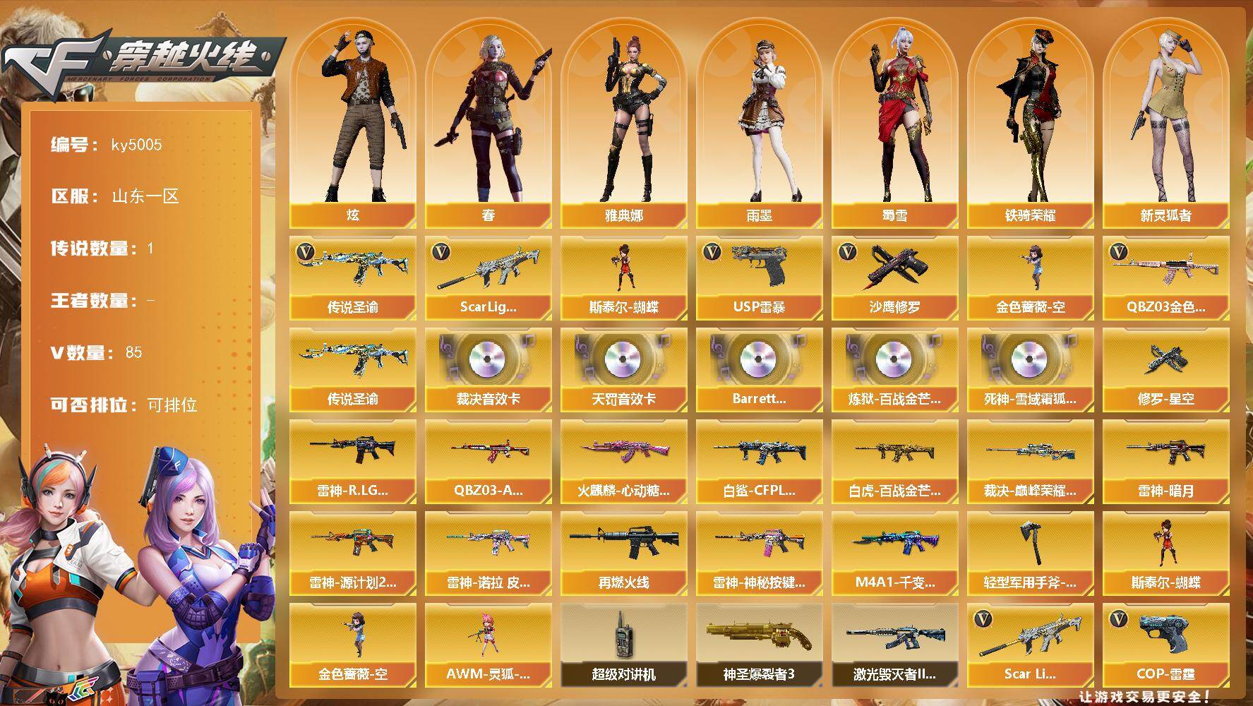 [16174720]山东一区-85V-0王者-0炫金 【传说武器】:传说圣谕 【热门武器】:传说圣谕,QBZ03-金色蔷薇,Scar Light-白虎,金色蔷薇-空,斯泰尔-蝴蝶,USP-雷暴,沙鹰-修罗 【音效卡】:AWM-裁决音效卡,QBZ03-天罚音效卡,Barrett-碧霄极光音效卡,炼狱-百战金芒-庆典舞曲音效卡,死神-雪域霜狐-怀旧音效卡 【皮肤】:白虎-白鲨-CFPLS23冠军,白虎-百战金芒 皮肤,QBZ03-AG-CFPLS19冠军,裁决-巅峰荣耀 皮肤,雷神-暗月,雷神-R.LGD-CFPLS18冠军,雷神-源计划2.0专属 皮肤,雷神-诺拉 皮肤,M4A1-再燃火线,雷神-神秘按键 皮肤,火麒麟-心动糖果,M4A1-千变-孔明皮肤,修罗-星空,轻型军用手斧-再燃火线 【角色】:炫,春,雨墨,战地猎狐,雪域霜狐,奇洋探员,云海玲珑,暗夜-X,飞虎队-X,疾风,娟娟,兰-新年限定,0号玩家,灵狐者-X,灵狐者-黄金海岸,娜塔莉娅,潘多拉-X,潘多拉-甜心教官,斯沃特-X,蜀雪,铁骑荣耀,维纳斯,新灵狐者,夜玫瑰-宠粉,樱-缤纷夏日,影武者-X,游珑儿,雅典娜 【人偶武器】:金色蔷薇-空,斯泰尔-蝴蝶,AWM-灵狐-15周年嘉年华 【暴走生化】:超级对讲机 【挑战大师】:神圣爆裂者III,激光毁灭者III-白马银枪 【英雄级武器】:M4A1-雷神,AK12-天启,M4A1-雷霆,AK47-雷暴,Scar Light-白虎,QBZ03-天罚,无影-神兵利器,黑武士-锦绣游龙,超新星-热带奇洋,QBZ03-金色蔷薇,AWM-裁决,VSK-94-金蚀,炼狱-百战金芒,沙鹰-修罗,沙鹰-天神,USP-雷暴,COP-雷霆,COP 357-云龙,屠龙*2,龙啸,龙啸-热带奇洋,斩神刀-雷暴,麒麟刺-百战金芒,高爆手雷-雷霆*7,高爆手雷-雷暴*7,手雷-热带奇洋,闪光弹-雷霆*8,闪光弹-雷暴*7,烟雾弹-雷霆*8,烟雾弹-雷暴*8,M4A1-赤狱骑士,AWM-昌龙,Barrett-碧霄极光 【道具】:鲨鲨水溅跃背包,CFS限定背包,冰冰企鹅背包,奇洋探员-海龟背包,炫彩背包-诺拉,炫彩背包,热带奇洋炫彩背包,百战金芒炫彩背包,老虎背包,超级背包,雪域霜狐炫彩背包,哔哩哔哩名片,女皇终结者-魔龙之吻,救世主-黑桃战神,黄金生化钩,绿色巨人,灵魂忍者*2,变异宝贝,迷雾幽灵*2,生