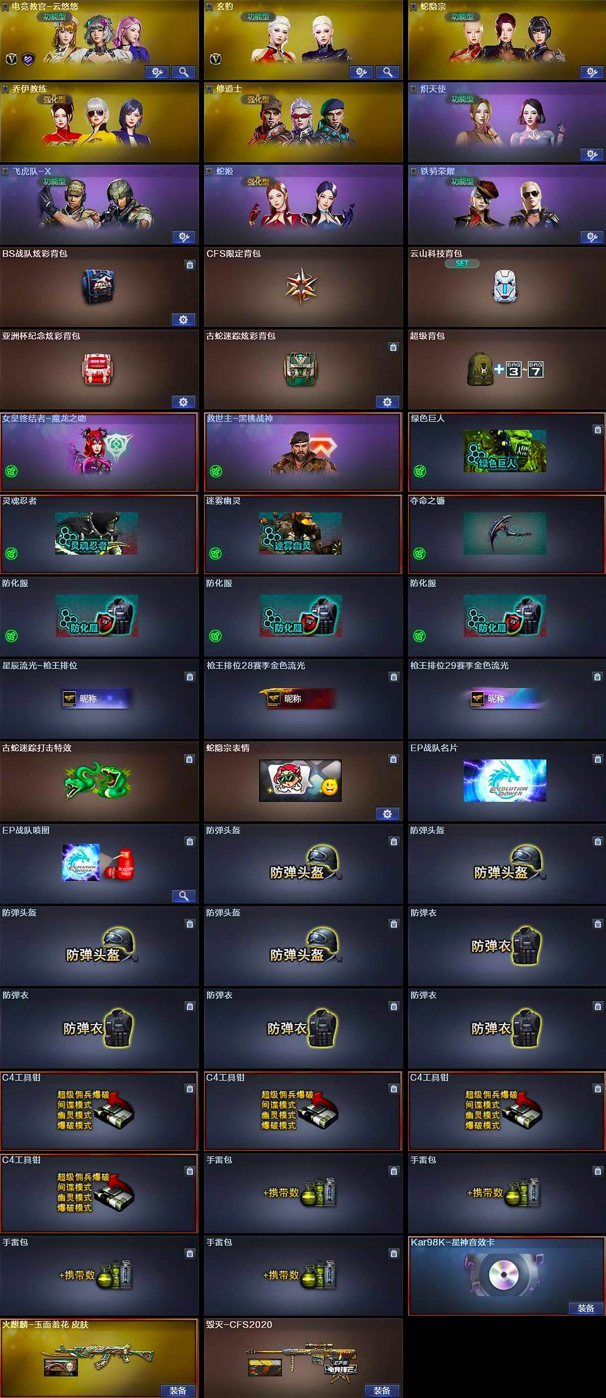 【道具】:BS战队炫彩背包,CFS限定背包,云山科技背包,亚洲杯纪念炫彩背包,古蛇迷踪炫彩背包,超级背包,女皇终结者-魔龙之吻,救世主-黑桃战神,绿色巨人,灵魂忍者,迷雾幽灵,夺命之镰,防化服*3,星辰流光-枪王排位,枪王排位28赛季金色流光,枪王排位29赛季金色流光,古蛇迷踪打击特效,蛇隐宗表情,EP战队名片,EP战队喷图,防弹头盔*4,防弹衣*4,C4工具钳*4,手雷包*4