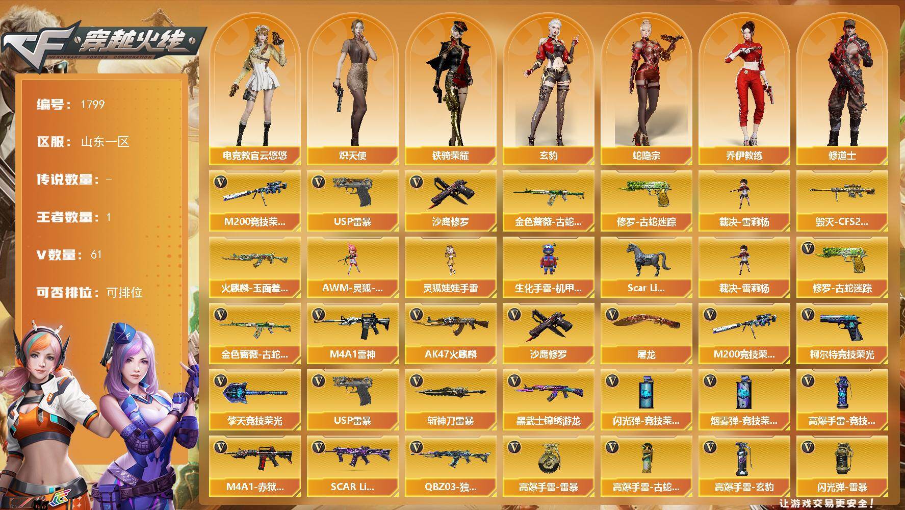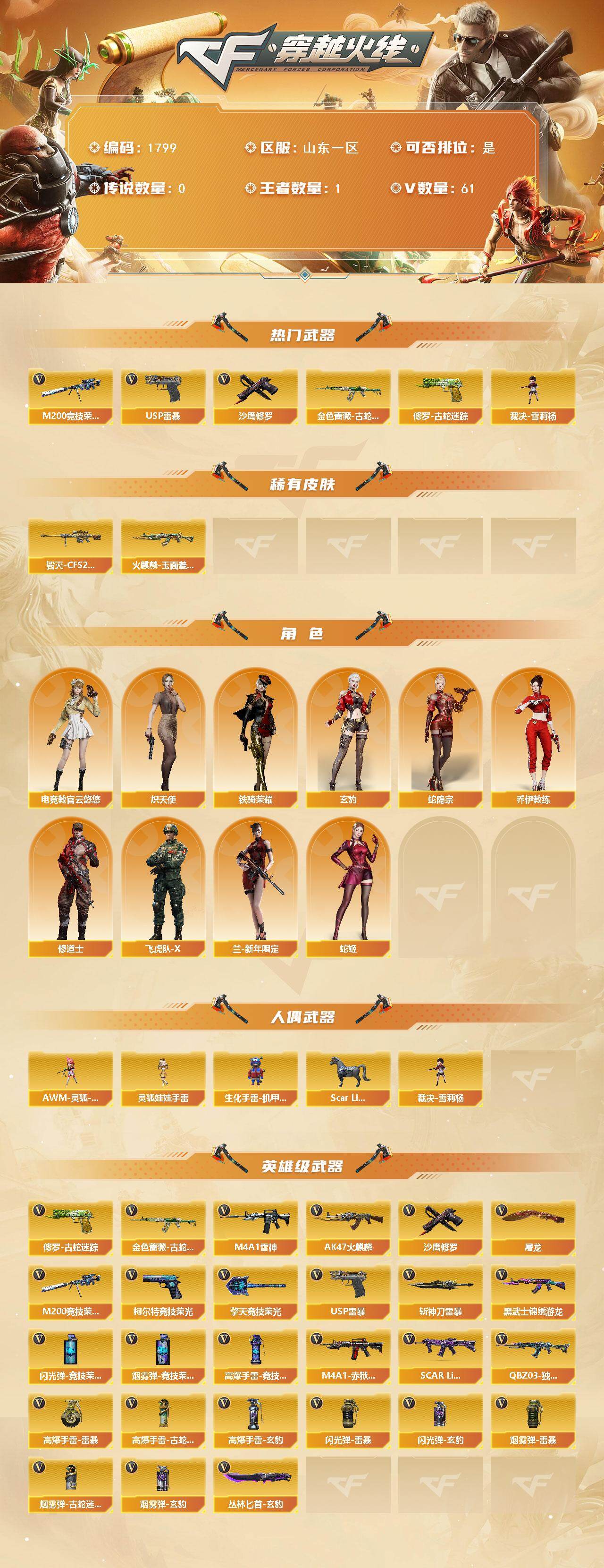 [16176676]山东一区-61V-1王者-0炫金 【热门武器】:金色蔷薇-古蛇迷踪,修罗-古蛇迷踪,M200-竞技荣光,裁决-雪莉杨,USP-雷暴,沙鹰-修罗*2 【皮肤】:火麒麟-玉面羞花 皮肤,毁灭-CFS2020 【角色】:电竞教官-云悠悠,玄豹,蛇隐宗,乔伊教练,修道士,炽天使,飞虎队-X,兰-新年限定,蛇姬,铁骑荣耀 【人偶武器】:裁决-雪莉杨,Scar Light-马枪,AWM-灵狐-15周年嘉年华,生化手雷-机甲核心,灵狐娃娃手雷*2 【英雄级武器】:AK47-火麒麟,M4A1-雷神*2,黑武士-锦绣游龙,金色蔷薇-古蛇迷踪,SCAR Light-玄豹*2,QBZ03-独角-IV,M200-竞技荣光,沙鹰-修罗*2,USP-雷暴,柯尔特-竞技荣光*2,Anaconda-玄豹,修罗-古蛇迷踪,屠龙,擎天-竞技荣光*2,斩神刀-雷暴,丛林匕首-玄豹,高爆手雷-雷暴,高爆手雷-竞技荣光*8,高爆手雷-古蛇迷踪,高爆手雷-玄豹*4,闪光弹-雷暴,闪光弹-竞技荣光*8,闪光弹-玄豹*4,烟雾弹-雷暴,烟雾弹-竞技荣光*7,烟雾弹-古蛇迷踪,烟雾弹-玄豹*4,M4A1-赤狱骑士 【道具】:BS战队炫彩背包,CFS限定背包,云山科技背包,亚洲杯纪念炫彩背包,古蛇迷踪炫彩背包,超级背包,女皇终结者-魔龙之吻,救世主-黑桃战神,绿色巨人,灵魂忍者,迷雾幽灵,夺命之镰,防化服*3,星辰流光-枪王排位,枪王排位28赛季金色流光,枪王排位29赛季金色流光,古蛇迷踪打击特效,蛇隐宗表情,EP战队名片,EP战队喷图,防弹头盔*4,防弹衣*4,C4工具钳*4,手雷包*4 【特殊枪械】: