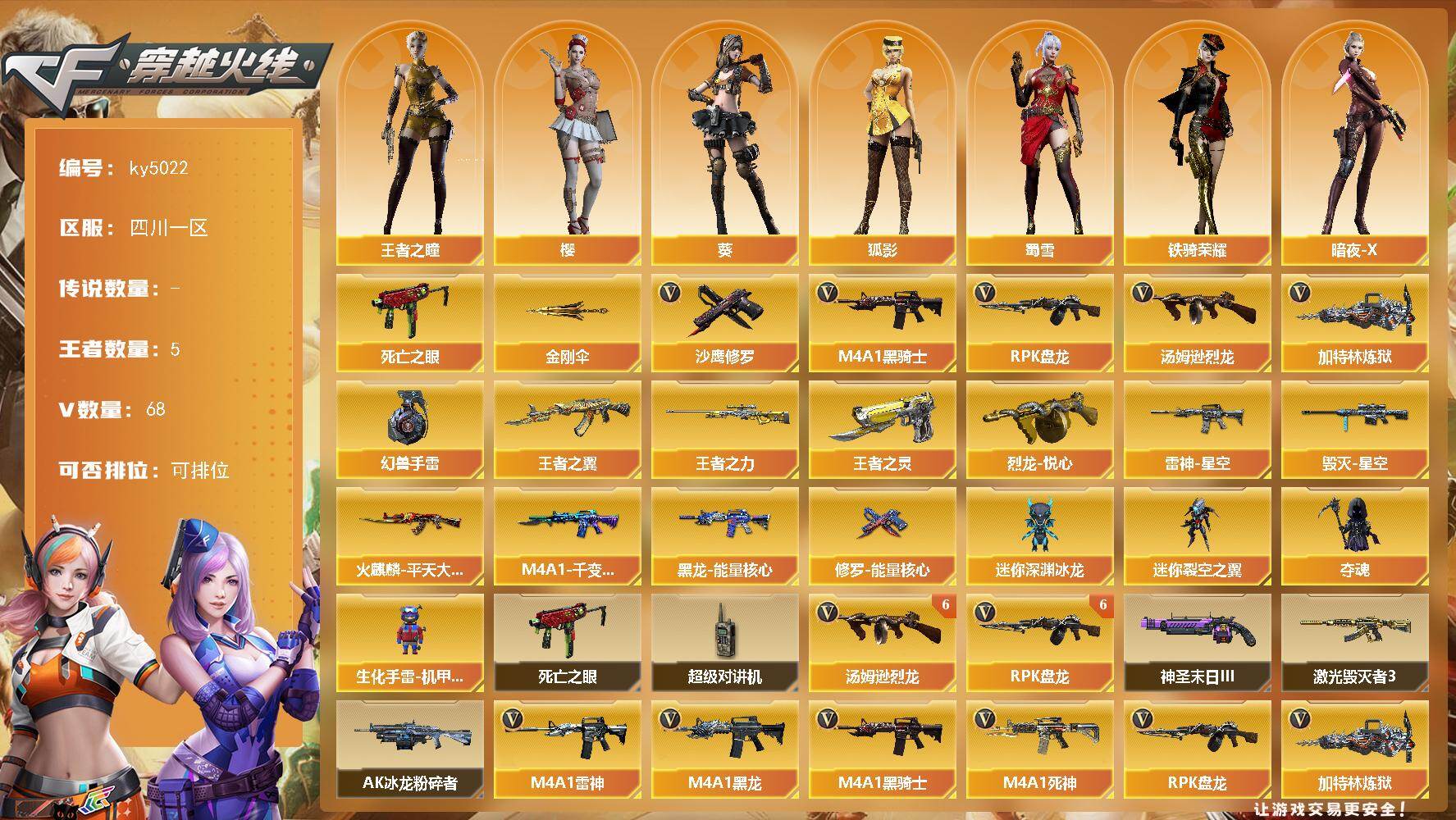 [16176683]四川一区-68V-5王者-0炫金 【热门武器】:死亡之眼,M4A1-黑骑士*2,汤姆逊-烈龙*6,RPK-盘龙*6,加特林-炼狱*3,沙鹰-修罗*2,金刚伞,高爆手雷-幻兽 【王者炫金武器】:王者之翼,王者之力,烈龙-悦心,王者之灵 【皮肤】:雷神-星空,火麒麟-平天大圣,毁灭-星空*2,M4A1-千变-孔明皮肤,黑龙-能量核心,修罗-能量核心*2 【角色】:葵,樱,王者之瞳,狐影,暗夜-X,北极狐-X,娟娟,灵狐者-X,灵狐者-黄金海岸,龙儿,龙儿-小淘气,麻雀,潘多拉-X,蜀雪,铁骑荣耀 【人偶武器】:迷你深渊冰龙,迷你裂空之翼,夺魂,生化手雷-机甲核心*2 【暴走生化】:死亡之眼,超级对讲机 【挑战大师】:AK47-冰龙粉碎者,激光毁灭者III,神圣爆裂者-末日III 【英雄级武器】:M4A1-千变,AK47-火麒麟,M4A1-黑龙*3,M4A1-雷神*5,M4A1-黑骑士*2,AK47-无影,M4A1-死神,AK12-天启,AN94-超新星*4,M4A1-武圣,AK47-机械迷城,M4A1-龙血,M4A1-猎神,AWM-天龙,Barrett-毁灭*3,Barrett-极光,RPK-盘龙*6,加特林-炼狱*3,炼狱-悦蓝-觉醒版,汤姆逊-烈龙*6,AA-12-雷霆,沙鹰-修罗*2,沙鹰-天神*3,沙鹰-幻兽,Glock18-武圣,屠龙*2,龙啸,擎天,麒麟刺*2,女皇利刃-幻兽,高爆手雷-雷霆,高爆手雷-幻兽,闪光弹-雷霆,闪光弹-幻兽,烟雾弹-雷霆,烟雾弹-幻兽 【道具】:战舰背包,炫彩背包,老虎背包,背包-洛丽塔,超级背包,绿色巨人,灵魂忍者*2,变异宝贝,妖姬,迷雾幽灵,生化弹匣,夺命之镰,防化服*2,防弹头盔*5,防弹衣*7,C4工具钳*4,手雷包*6 【特殊枪械】:2黑骑士,6烈龙,6盘龙,3炼狱