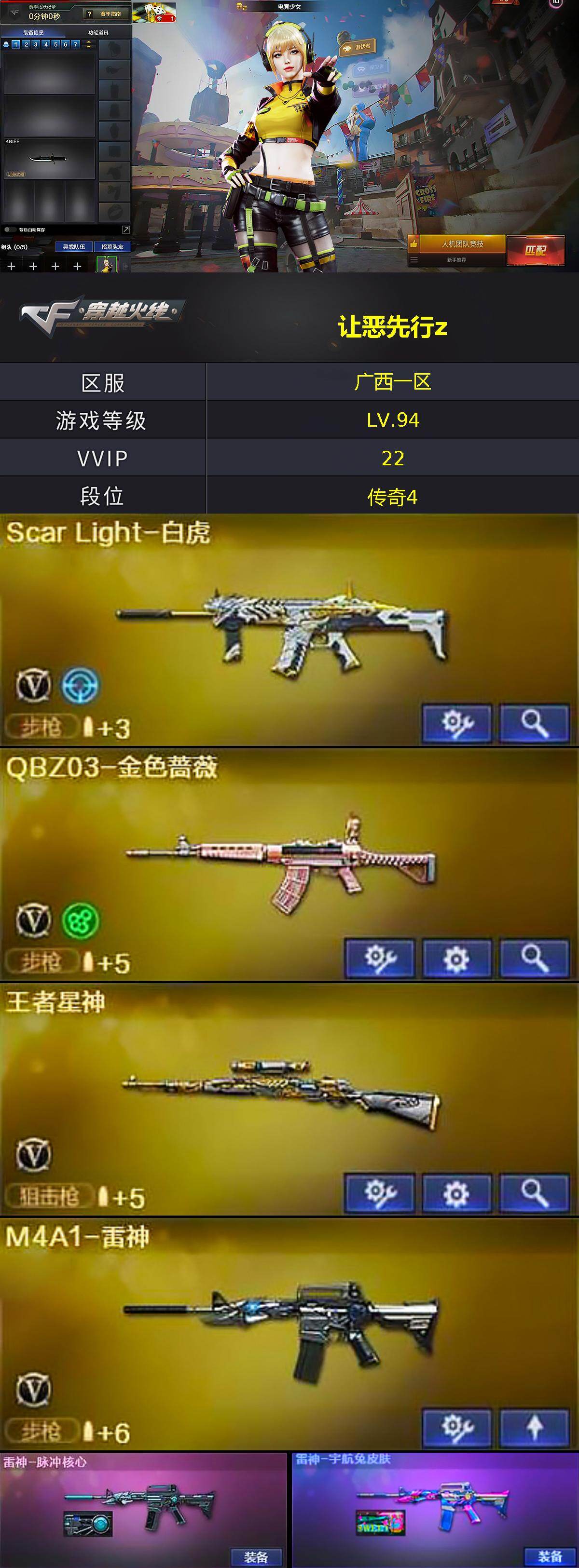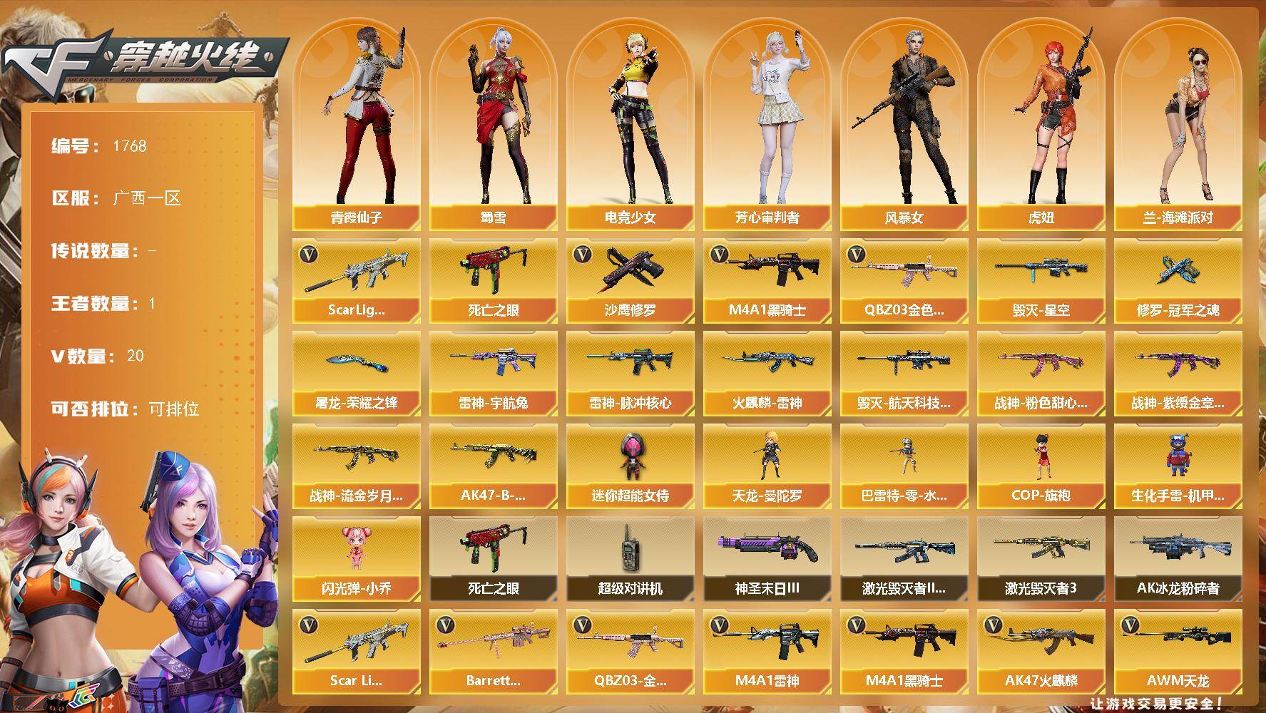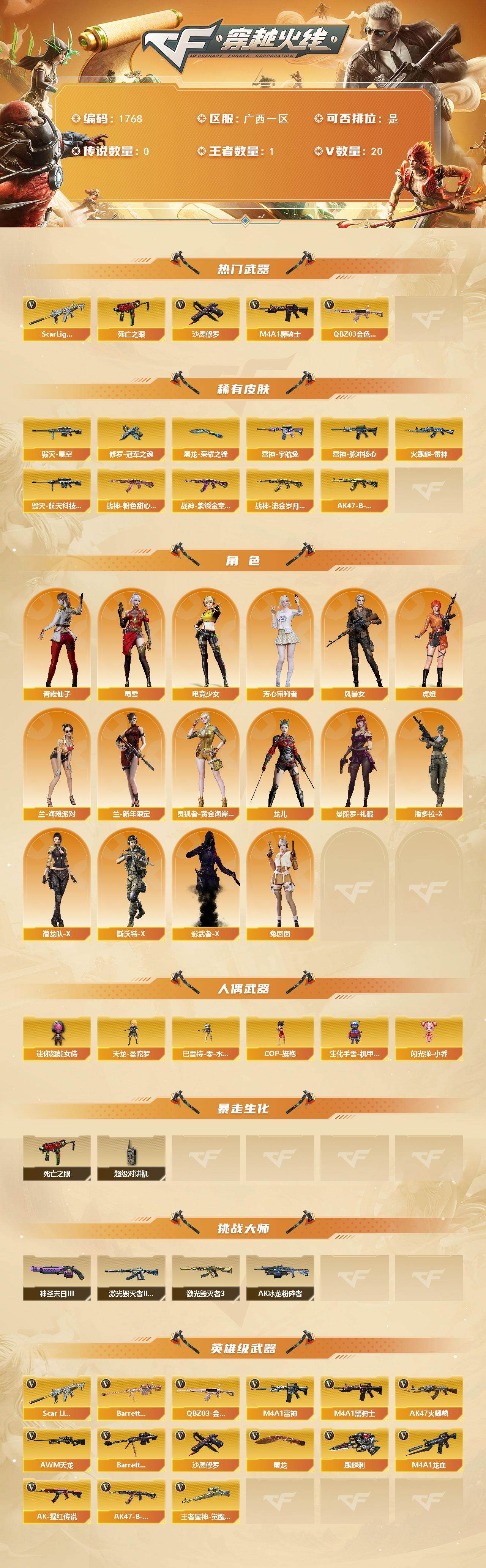 [16178098]广西一区-20V-1王者-0炫金 【热门武器】:QBZ03-金色蔷薇,Scar Light-白虎,死亡之眼,M4A1-黑骑士,沙鹰-修罗 【皮肤】:雷神-脉冲核心,雷神-宇航兔皮肤,火麒麟-雷神,毁灭-星空,毁灭-航天科技皮肤,战神-粉色甜心皮肤,战神-紫绶金章皮肤,战神-流金岁月皮肤*2,AK47-B-常胜将军-孙权*2,修罗-冠军之魂,屠龙-荣耀之锋 【角色】:电竞少女,芳心审判者,风暴女,虎妞,兰-海滩派对,兰-新年限定,灵狐者-黄金海岸,龙儿,曼陀罗-礼服,潘多拉-X,潜龙队-X,青霞仙子,斯沃特-X,蜀雪,兔囡囡,影武者-X 【人偶武器】:天龙-曼陀罗,巴雷特-零-水下丽影,COP-旗袍,生化手雷-机甲核心,闪光弹-小乔,迷你超能女侍 【暴走生化】:死亡之眼,超级对讲机 【挑战大师】:AK47-冰龙粉碎者*2,激光毁灭者III-白马银枪,激光毁灭者III,神圣爆裂者-末日III 【英雄级武器】:AK47-火麒麟,M4A1-雷神,M4A1-黑骑士,M4A1-龙血,Scar Light-白虎,QBZ03-金色蔷薇,AK-47-猩红传说,AK47-B-战神*2,AWM-天龙,Barrett-毁灭,Barrett-金色蔷薇,王者星神-觉醒版,沙鹰-修罗,屠龙,麒麟刺*2 【道具】:战舰背包,背包-洛丽塔,超级背包,生化弹匣,夺命之镰*2,防化服*2,金色流光-枪王排位,电玩兔兔表情,防弹头盔*6,防弹衣*6,C4工具钳*7,手雷包*2 【特殊枪械】:1白虎,1黑骑士