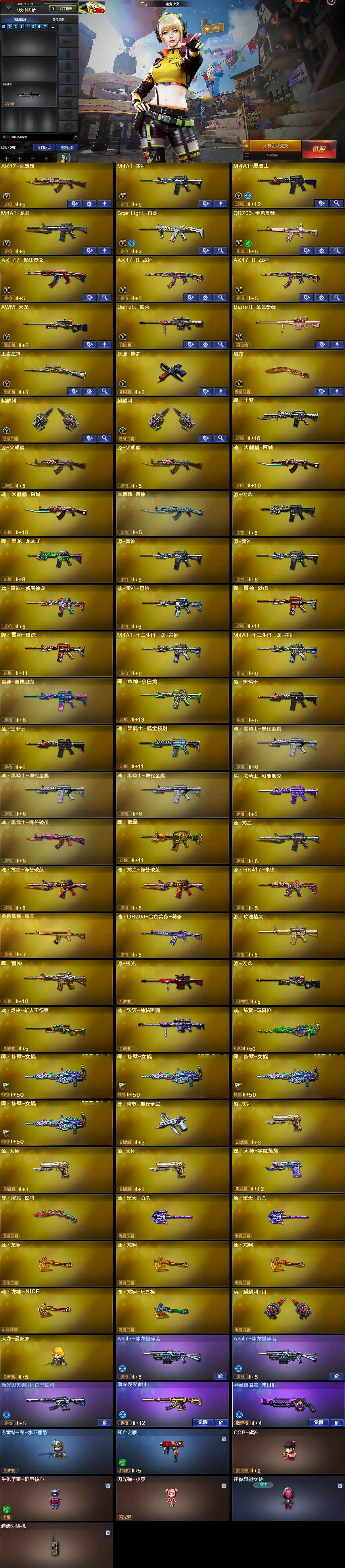 【英雄级武器】:AK47-火麒麟,M4A1-雷神,M4A1-黑骑士,M4A1-龙血,Scar Light-白虎,QBZ03-金色蔷薇,AK-47-猩红传说,AK47-B-战神*2,AWM-天龙,Barrett-毁灭,Barrett-金色蔷薇,王者星神-觉醒版,沙鹰-修罗,屠龙,麒麟刺*2
