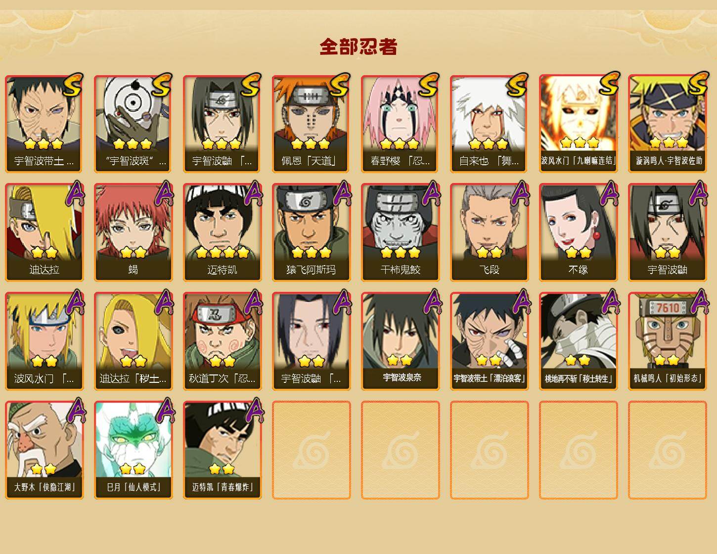 【S级忍者】:春野樱「忍界大战」(3星),宇智波带土「忍界大战」(3星),宇智波鼬「须佐能乎」(3星),自来也「舞之豪杰」(3星),佩恩「天道」(3星),宇智波斑 「白面具」(3星宇智波斑「白面具」),波风水门「九喇嘛连结」(3星),漩涡鸣人·宇智波佐助(3星)