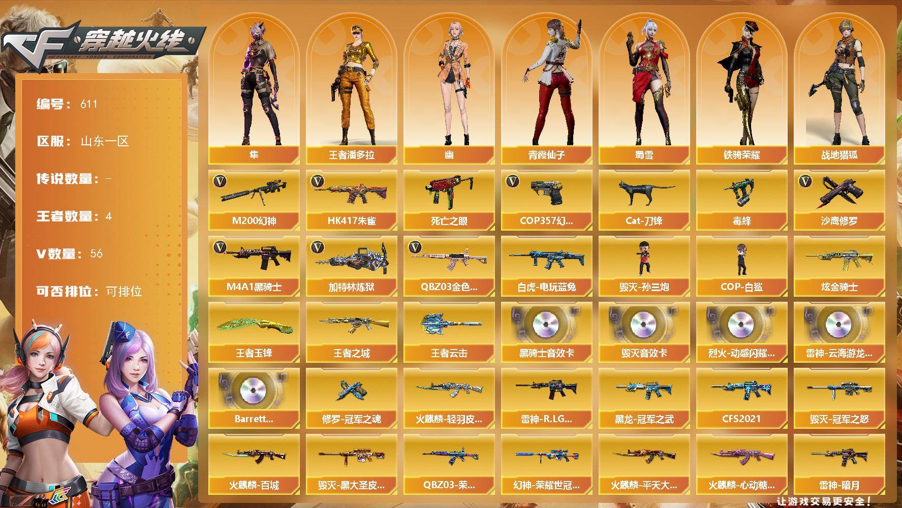 [16180158]山东一区-56V-4王者-1炫金 【热门武器】:QBZ03-金色蔷薇,HK417-朱雀,M200-幻神,死亡之眼,白虎-电玩蓝兔,Cat-刀锋,毒蜂,M4A1-黑骑士,加特林-炼狱*2,毁灭-孙三炮,COP-白鲨*2,COP 357-幻灵,沙鹰-修罗*3 【王者炫金武器】:王者之城,王者玉锋,王者云击,炫金骑士 【音效卡】:烈火-动感闪耀 音效卡,M4A1-雷神-云海游龙音效卡,M4A1-黑骑士音效卡,Barrett-毁灭音效卡,Barrett-碧霄极光音效卡 【皮肤】:M200-幻神-荣耀世冠白鲨,幻神-电竞之星 皮肤,QBZ03-荣耀世冠白鲨,雷神-暗月,雷神-R.LGD-CFPLS18冠军,雷神-机甲刑天皮肤,雷神-源计划2.0专属 皮肤,M4A1-再燃火线,火麒麟-轻羽皮肤,火麒麟-平天大圣,火麒麟-百城,火麒麟-心动糖果,毁灭-冠军之怒,毁灭-黑大圣皮肤,毁灭-黑曼巴 皮肤,毁灭-英雄计划 皮肤,M4A1-千变-孔明皮肤,黑龙-能量核心,黑龙-冠军之武,黑骑士-CFS2021,烈火-动感闪耀 皮肤,战神-粉色甜心皮肤,战神-紫绶金章皮肤*2,战神-流金岁月皮肤,修罗-能量核心,修罗-冠军之魂,修罗-15周年嘉年华 皮肤,轻型军用手斧-再燃火线,麒麟刺-月皮肤 【角色】:隼,战地猎狐,王者潘多拉,奇洋探员,乔伊教练,云海玲珑,暗夜-X,初恋灵狐,芳心审判者,风暴女,嘉年华灵狐,娟娟,兰妹妹,猎狐者-追月,灵狐-花神,灵狐者-X,灵狐者-黄金海岸,灵狐者-七夕宝贝,龙儿-小淘气,麻雀,潘多拉-X,潘多拉-甜心教官,青霞仙子,蛇姬,斯沃特-X,蜀雪,铁骑荣耀,兔囡囡,幽 【人偶武器】:COP-白鲨*2,毁灭-孙三炮,雷神-枪娘蕾安娜,AWM-灵狐-15周年嘉年华,Cat-刀锋,迷你牛魔王,深渊终结者手雷,迷你艾比,迷你超能女侍 【暴走生化】:毒蜂,死亡之眼,超级对讲机 【挑战大师】:冰龙粉碎者-白马银枪,激光毁灭者III-白马银枪,神圣爆裂者-末日III*2 【英雄级武器】:AK47-火麒麟*3,M4A1-黑龙,M4A1-雷神,M4A1-黑骑士,HK417-朱雀,无影-神兵利器,黑武士-锦绣游龙,QBZ03-金色蔷薇,烈火-动感闪耀,王者之圣-觉醒版,AK-47-猩红传说*2,AK47-B-战神*2,AK47-B-常胜将军,白虎-电玩蓝兔,Barrett-毁灭