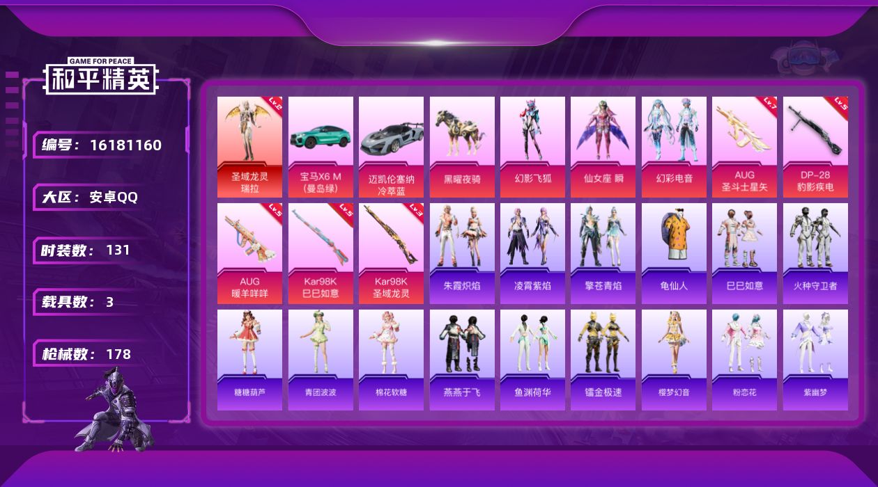 [16181160]地铁满天赋【店主推荐捡漏号!可直接换绑】安卓 手Q-1神装-3粉装-5特效枪-3载具-4粉色飞行器-58469热力值-14王牌印记-131套装-178枪皮【红色神装等级】:圣域龙灵-瑞拉(二级)【红色角色神装】:圣域龙灵-瑞拉【热门品类】:套装-龟仙人【粉色载具】:宝马X6 M(曼岛绿),迈凯伦塞纳(冷萃蓝),黑曜夜骑【粉色套装】:粉装-幻影飞狐,角色-仙女座 瞬,粉装-幻彩电音【粉色枪皮等级】:AUG-暖羊咩咩(五级),AUG-圣斗士星矢(七级),Kar98K-巳巳如意(五级),Kar98K-圣域龙灵(三级),DP-28-豹影疾电(五级)【粉色枪皮】:AUG-暖羊咩咩,AUG-圣斗士星矢,Kar98K-巳巳如意,Kar98K-圣域龙灵,DP-28-豹影疾电【粉色飞行器】:彩虹独角兽飞行器,圣域金龙飞行器,雀灵庇佑飞行器