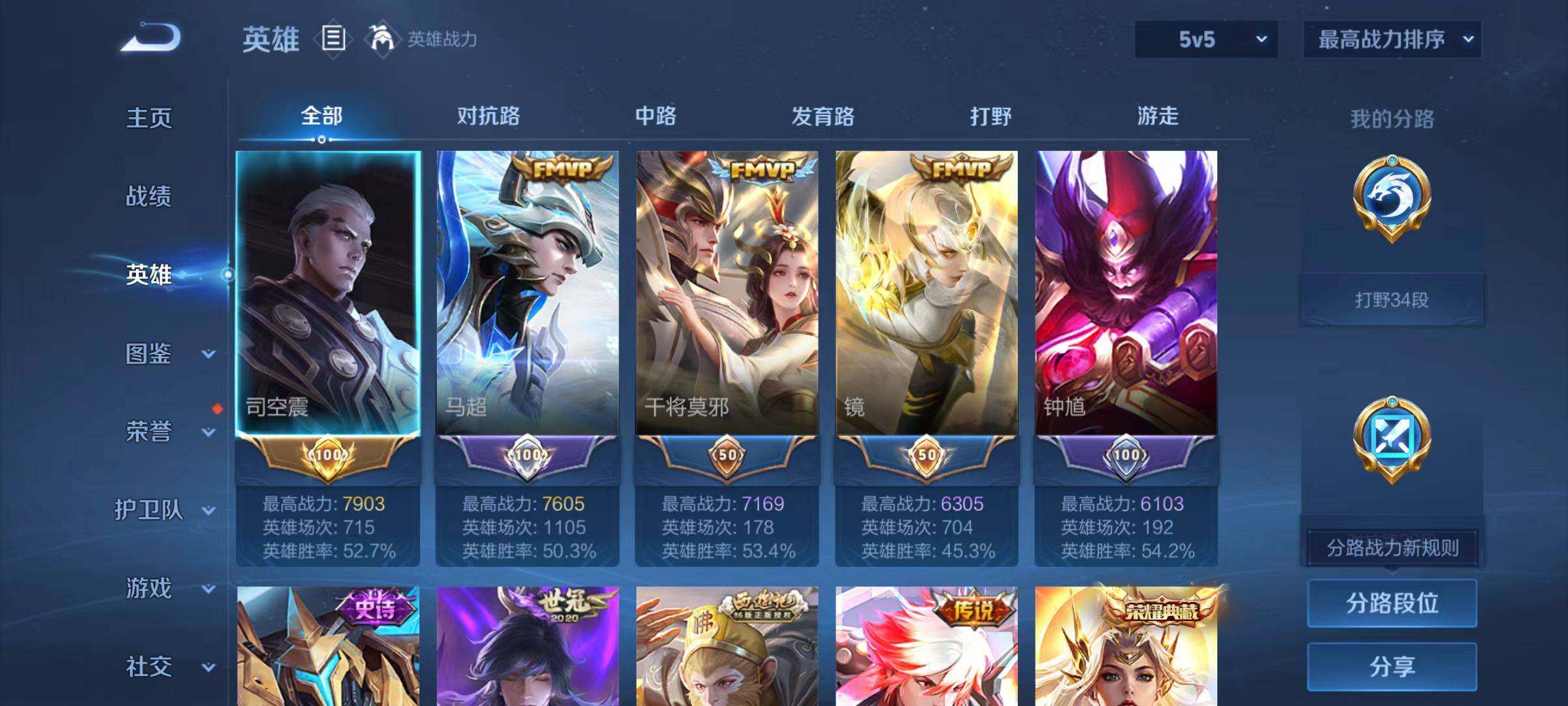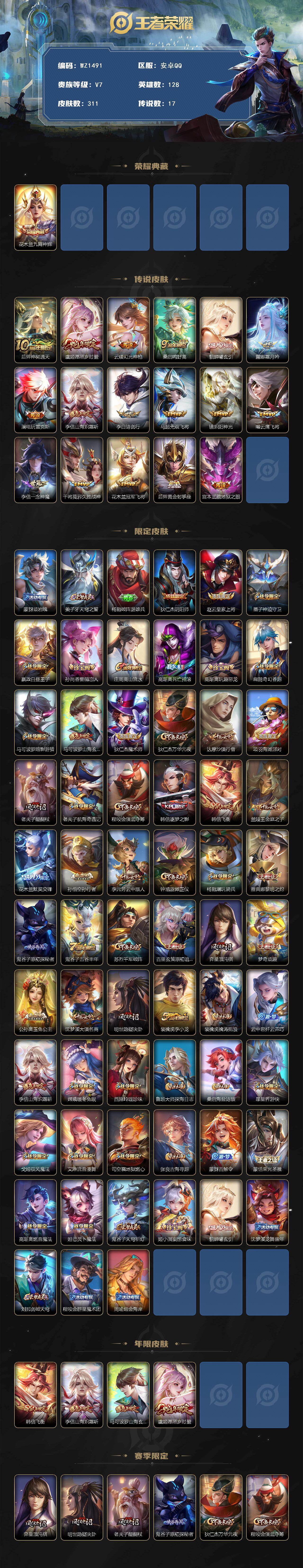 - [15781082]安卓Q-V0-荣耀黄金I段位-122英雄-212皮肤-11传说-55史诗 【传说皮肤】:虞姬启明星使,孙悟空零号赤焰,达摩黄金狮子座,百里玄策白虎志,杨戬永曜之星,诸葛亮武陵仙君,貂蝉仲夏夜之梦,孙尚香末日机甲,宫本武藏地狱之眼,孙悟空地狱火,狄仁杰超时空战士 【限定皮肤】:白起狰,狄仁杰阴阳师,虞姬凯尔特女王,赵云皇家上将,赵云引擎之心,赵云龙胆,嬴政白昼王子,庄周高山流水,孙膑妖精王,扁鹊炼金王,扁鹊奇幻香踪,芈月重明,吕布猎兽之王,周瑜真爱至上,夏侯惇朔风刀,曹操烛龙,典韦穷奇,马可波罗暗影游猎,狄仁杰魔术师,狄仁杰万华元夜,达摩沙漠行僧,项羽海滩派对,老夫子醍醐杖,程咬金演武夺筹,韩信逐梦之影,兰陵王金庭之子,孙悟空至尊宝,孙悟空大圣娶亲,孙悟空零号赤焰,牛魔御旌,后羿辉光之辰,后羿圣弓游侠,李元芳云中旅人,虞姬启明星使,钟馗驱傩正仪,杨玉环遇见飞天,杨戬永曜之星,杨戬潮玩骑兵,干将莫邪胡桃夹子,干将莫邪真爱魔法,雅典娜单词大作战,雅典娜黎明之约,蔡文姬繁星吟游,太乙真人饕餮,鬼谷子原初探秘者,诸葛亮武陵仙君,铠青龙志,苏烈千军破阵,百里玄策白虎志,百里玄策原初追逐者,百里守约朱雀志,弈星混沌棋,沈梦溪大漠名商,明世隐疑决卦,裴擒虎李小龙,裴擒虎擒涛扼浪,狂铁御狮,米莱狄御霄,盾山御銮,猪八戒西部大镖客,上官婉儿梁祝,嫦娥拒霜思,蒙犽狂想玩偶喵,鲁班大师探海日志,桑启海盐诗旅,张良古海寻踪,蒙恬荣光圣徽,鬼谷子天穹祈灯 【年限皮肤】:百里玄策白虎志,百里守约朱雀志,铠青龙志,杨戬永曜之星,后羿辉光之辰,赵云龙胆 【赛季限定】:孙膑妖精王,扁鹊炼金王,白起狰,芈月重明,夏侯惇朔风刀,曹操烛龙,典韦穷奇,狄仁杰万华元夜,达摩沙漠行僧,老夫子醍醐杖,程咬金演武夺筹,兰陵王金庭之子,张良古海寻踪,牛魔御旌,李元芳云中旅人,虞姬凯尔特女王,钟馗驱傩正仪,雅典娜黎明之约,太乙真人饕餮,鬼谷子原初探秘者,苏烈千军破阵,百里玄策原初追逐者,弈星混沌棋,沈梦溪大漠名商,明世隐疑决卦,裴擒虎擒涛扼浪,狂铁御狮,米莱狄御霄,盾山御銮,鲁班大师探海日志,桑启海盐诗旅,鬼谷子天穹祈灯,蒙恬荣光圣徽 【战令限定】:嬴政白昼王子,扁鹊奇幻香踪,吕布猎兽之王,马可波罗暗影游猎,后羿圣弓游侠,杨戬潮玩骑兵,干将莫邪真爱魔法,雅典娜单词大作战,猪八戒西部大镖客,蒙犽狂想玩偶喵 【史诗皮肤】: