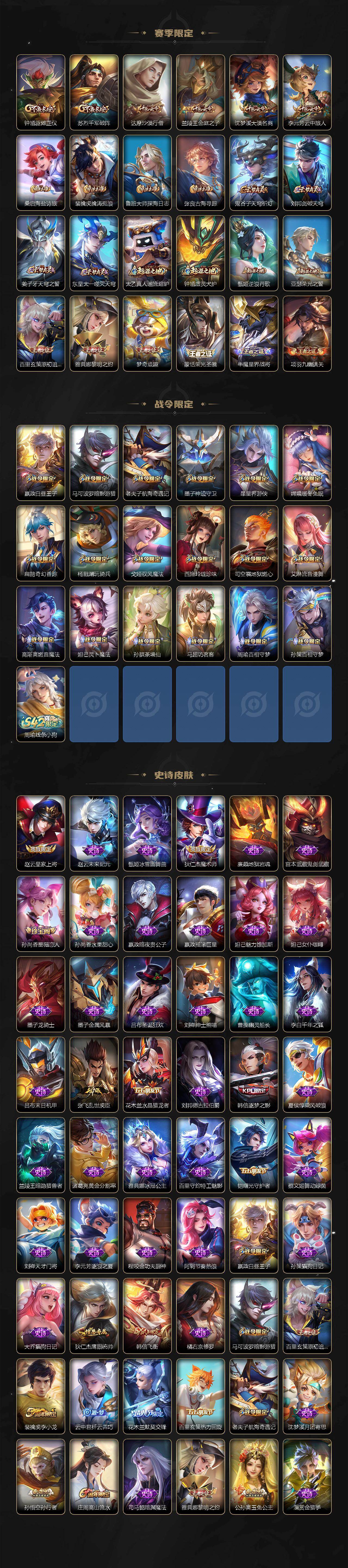 【赛季限定】:弈星混沌棋,明世隐疑决卦,老夫子醍醐杖,鬼谷子原初探秘者,狄仁杰万华元夜,程咬金演武夺筹,钟馗驱傩正仪,苏烈千军破阵,达摩沙漠行僧,兰陵王金庭之子,沈梦溪大漠名商,李元芳云中旅人,桑启海盐诗旅,裴擒虎擒涛扼浪,鲁班大师探海日志,张良古海寻踪,鬼谷子天穹祈灯,刘邦剑破天穹,姜子牙天穹之誓,东皇太一噬灭天穹,太乙真人谧流熔炉,钟馗虚灵犬护,甄姬逆浪荇歌,亚瑟荣光之誓,百里玄策原初追逐者,雅典娜黎明之约,梦奇顽趣,蒙恬荣光圣徽,牛魔星界战将,项羽九幽镇关