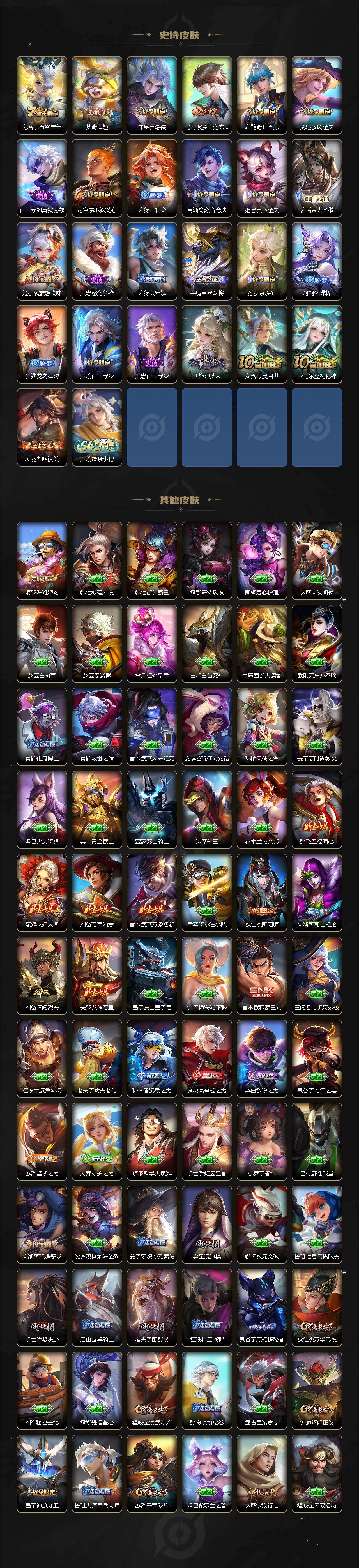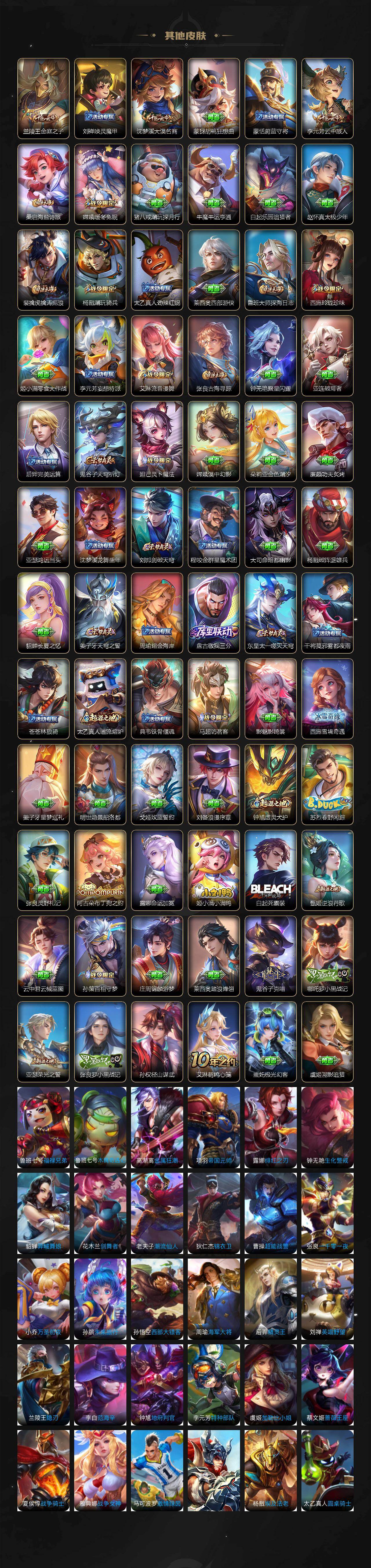 【限定皮肤】:蒙犽顽岩魄,姜子牙天穹之誓,杨戬破阵退雄兵,狄仁杰阴阳师,赵云皇家上将,墨子神迹守卫,嬴政白昼王子,孙尚香蔷薇恋人,庄周高山流水,高渐离死亡摇滚,高渐离玩趣恶龙,扁鹊奇幻香踪,马可波罗暗影游猎,马可波罗山海玄木吟,狄仁杰魔术师,狄仁杰万华元夜,达摩沙漠行僧,项羽海滩派对,老夫子醍醐杖,老夫子航海奇遇记,程咬金演武夺筹,韩信逐梦之影,韩信飞衡,兰陵王金庭之子,花木兰默契交锋,孙悟空孙行者,李元芳云中旅人,钟馗驱傩正仪,杨戬潮玩骑兵,雅典娜黎明之约,鬼谷子原初探秘者,鬼谷子五谷丰年,苏烈千军破阵,百里玄策原初追逐者,弈星混沌棋,梦奇顽趣,公孙离玉兔公主,沈梦溪大漠名商,明世隐疑决卦,裴擒虎李小龙,裴擒虎擒涛扼浪,云中君纤云弄巧,李信山海炽霜斩,嫦娥暖冬兔眠,西施玲珑珍味,鲁班大师探海日志,桑启海盐诗旅,暃星界游侠,戈娅驭风魔法,艾琳流音漫舞,司空震地狱燃心,张良古海寻踪,蒙犽百解令,蒙恬荣光圣徽,高渐离燃音魔法,妲己灵卜魔法,鬼谷子天穹祈灯,姬小满妄想食味,貂蝉曦玄引,沈梦溪龙舞盛年,刘邦剑破天穹,程咬金群星魔术团,周瑜熔金海岸