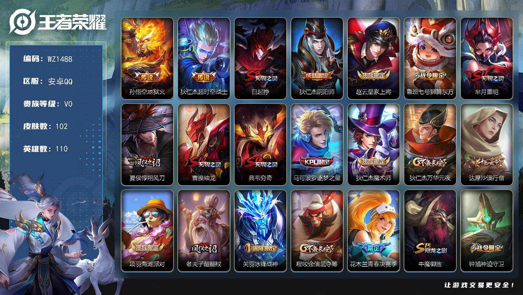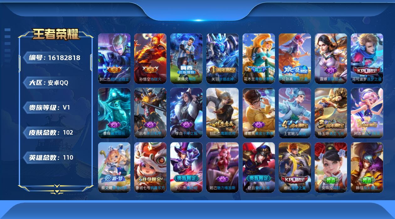 [16182818]安卓Q-V0-秩序白银II段位-110英雄-102皮肤-2传说-20史诗 【传说皮肤】:孙悟空地狱火,狄仁杰超时空战士 【限定皮肤】:白起狰,狄仁杰阴阳师,赵云皇家上将,鲁班七号狮舞东方,芈月重明,夏侯惇朔风刀,曹操烛龙,典韦穷奇,马可波罗逐梦之星,狄仁杰魔术师,狄仁杰万华元夜,达摩沙漠行僧,项羽海滩派对,老夫子醍醐杖,关羽冰锋战神,程咬金演武夺筹,花木兰青春决赛季,牛魔御旌,钟馗神迹守卫,钟馗驱傩正仪,杨玉环遇见飞天,哪吒逐梦之翼,蔡文姬繁星吟游,太乙真人饕餮,鬼谷子原初探秘者,弈星混沌棋,公孙离蜜橘之夏,明世隐疑决卦,狂铁御狮,米莱狄御霄,盾山御銮,上官婉儿梁祝,阿古朵江河有灵,张良古海寻踪,裴擒虎梅西 【赛季限定】:白起狰,太乙真人饕餮,曹操烛龙,芈月重明,典韦穷奇,狂铁御狮,米莱狄御霄,牛魔御旌,盾山御銮,夏侯惇朔风刀,弈星混沌棋,明世隐疑决卦,老夫子醍醐杖,鬼谷子原初探秘者,狄仁杰万华元夜,程咬金演武夺筹,钟馗驱傩正仪,达摩沙漠行僧,张良古海寻踪 【战令限定】:鲁班七号狮舞东方,钟馗神迹守卫 【史诗皮肤】:露娜紫霞仙子,赵云皇家上将,狄仁杰魔术师,妲己魅力维加斯,曹操幽灵船长,李白千年之狐,吕布末日机甲,关羽冰锋战神,诸葛亮黄金分割率,马可波罗逐梦之星,花木兰青春决赛季,裴擒虎梅西,哪吒逐梦之翼,公孙离蜜橘之夏,杨玉环遇见飞天,鲁班七号狮舞东方,狄仁杰鹰眼统帅,上官婉儿梁祝,蔡文姬繁星吟游,阿古朵江河有灵 【其他皮肤】:项羽海滩派对,韩信教廷特使,韩信街头霸王,阿轲致命风华,达摩大发明家,扁鹊化身博士,妲己少女阿狸,亚瑟死亡骑士,达摩拳王,花木兰兔女郎,张飞五福同心,甄姬花好人间,刘备万事如意,宫本武藏万象初新,狄仁杰阴阳师,刘备纽约教父,刘备汉昭烈帝,关羽龙腾万里,墨子进击墨子号,白起狰,太乙真人饕餮,宫本武藏霸王丸,曹操烛龙,芈月重明,老夫子功夫老勺,孙尚香沉稳之力,典韦穷奇,鬼谷子幻乐之宴,狂铁御狮,安琪拉如懿,苏烈坚韧之力,大乔守护之力,米莱狄御霄,张良幽兰居士,牛魔御旌,钟馗神迹守卫,盾山御銮,孙膑归虚梦演,姜子牙炽热元素使,夏侯惇朔风刀,弈星混沌棋,鲁班七号黑桃队长,明世隐疑决卦,老夫子醍醐杖,鬼谷子原初探秘者,狄仁杰万华元夜,杨戬次元傲视,程咬金演武夺筹,张良缤纷绘卷,钟馗驱傩正仪,鲁班大师乓乓大师,达摩沙漠行僧,张良古海寻踪,露娜绯红之刃