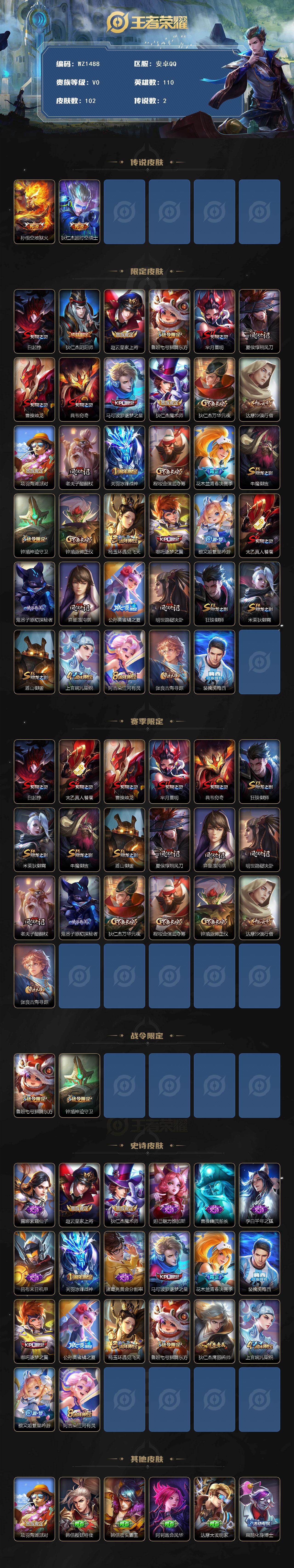 [16182818]安卓Q-V0-秩序白银II段位-110英雄-102皮肤-2传说-20史诗