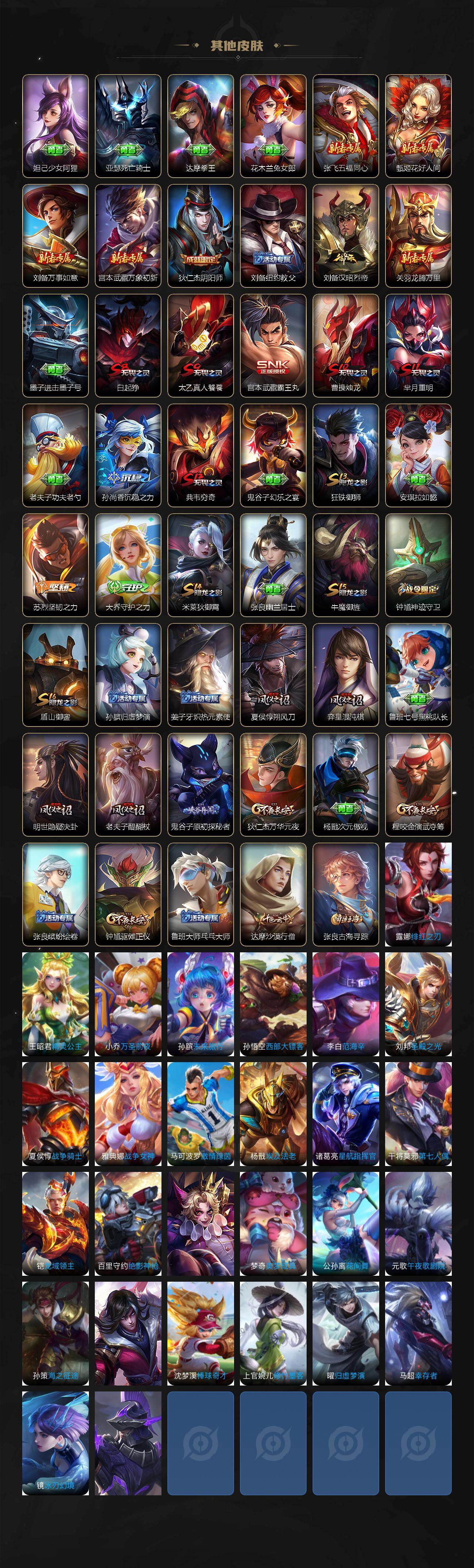 【其他皮肤】:项羽海滩派对,韩信教廷特使,韩信街头霸王,阿轲致命风华,达摩大发明家,扁鹊化身博士,妲己少女阿狸,亚瑟死亡骑士,达摩拳王,花木兰兔女郎,张飞五福同心,甄姬花好人间,刘备万事如意,宫本武藏万象初新,狄仁杰阴阳师,刘备纽约教父,刘备汉昭烈帝,关羽龙腾万里,墨子进击墨子号,白起狰,太乙真人饕餮,宫本武藏霸王丸,曹操烛龙,芈月重明,老夫子功夫老勺,孙尚香沉稳之力,典韦穷奇,鬼谷子幻乐之宴,狂铁御狮,安琪拉如懿,苏烈坚韧之力,大乔守护之力,米莱狄御霄,张良幽兰居士,牛魔御旌,钟馗神迹守卫,盾山御銮,孙膑归虚梦演,姜子牙炽热元素使,夏侯惇朔风刀,弈星混沌棋,鲁班七号黑桃队长,明世隐疑决卦,老夫子醍醐杖,鬼谷子原初探秘者,狄仁杰万华元夜,杨戬次元傲视,程咬金演武夺筹,张良缤纷绘卷,钟馗驱傩正仪,鲁班大师乓乓大师,达摩沙漠行僧,张良古海寻踪,露娜绯红之刃