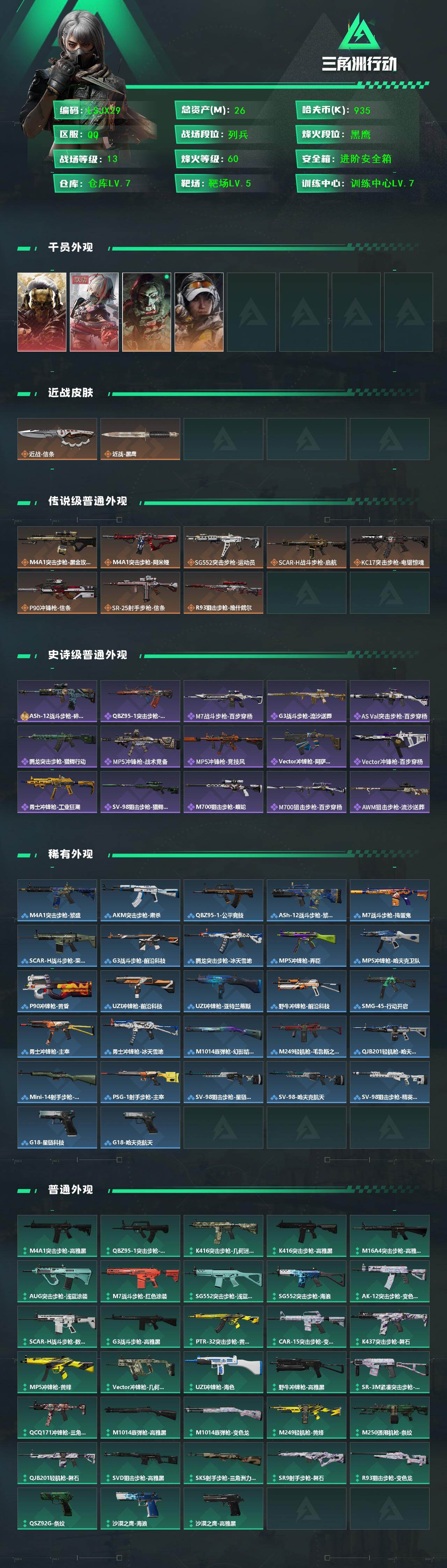 [16143386]【特价出售/店主推荐】26m总资产-935k哈伏币-60烽火等级-黑鹰-13战场等级-列兵 【干员外观】:红狼-蚀金玫瑰,骇爪-维什戴尔,红狼-电锯惊魂,露娜-金牌射手 【近战皮肤】:近战-信条,近战-黑鹰 【传说外观】:M4A1突击步枪-蚀金玫瑰,M4A1突击步枪-阿米娅,SG552突击步枪-运动员,SCAR-H战斗步枪-启航,KC17突击步枪-电锯惊魂,P90冲锋枪-信条,SR-25射手步枪-信条,R93狙击步枪-维什戴尔 【史诗外观】:ASh-12战斗步枪-碎冰行动,QBZ95-1突击步枪-曙光,M7战斗步枪-百步穿杨,G3战斗步枪-流沙送葬,AS Val突击步枪-百步穿杨,腾龙突击步枪-猎鳄行动,MP5冲锋枪-战术竞备,MP5冲锋枪-竞技风,Vector冲锋枪-阿萨拉文明,Vector冲锋枪-百步穿杨,勇士冲锋枪-工业狂潮,SV-98狙击步枪-猎鳄行动,M700狙击步枪-蝮蛇,M700狙击步枪-百步穿杨,AWM狙击步枪-流沙送葬 【稀有外观】:M4A1突击步枪-繁盛,AKM突击步枪-肃杀,QBZ95-1突击步枪-公平竞技,ASh-12战斗步枪-繁盛,M7战斗步枪-捣蛋鬼,SCAR-H战斗步枪-荣耀列队,G3战斗步枪-前沿科技,腾龙突击步枪-冰天雪地,MP5冲锋枪-弄臣,MP5冲锋枪-哈夫克卫队,P90冲锋枪-黄昏,UZI冲锋枪-前沿科技,UZI冲锋枪-亚特兰蒂斯,野牛冲锋枪-前沿科技,SMG-45-行动开启,勇士冲锋枪-主宰,勇士冲锋枪-冰天雪地,M1014霰弹枪-幻影结构,M249轻机枪-毛鲁斯之力,QJB201轻机枪-哈夫克卫队,Mini-14射手步枪-荣耀列队,PSG-1射手步枪-主宰,SV-98狙击步枪-星链科技,SV-98狙击步枪-哈夫克航天,SV-98狙击步枪-精英联盟,G18-星链科技,G18-哈夫克航天 【普通外观】:M4A1突击步枪-高雅黑,QBZ95-1突击步枪-高雅黑,K416突击步枪-几何迷彩,K416突击步枪-高雅黑,M16A4突击步枪-高雅黑,AUG突击步枪-浅蓝涂装,M7战斗步枪-红色涂装,SG552突击步枪-浅蓝涂装,SG552突击步枪-海浪,AK-12突击步枪-变色龙,SCAR-H战斗步枪-数码迷彩,G3战斗步枪-高雅黑,PTR-32突击步枪-黄蜂,CAR-15突击步枪-变色龙,K437突击步枪-磐石,MP5冲锋枪-黄蜂,