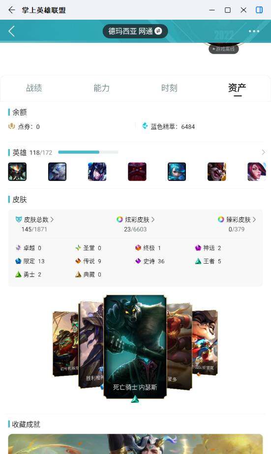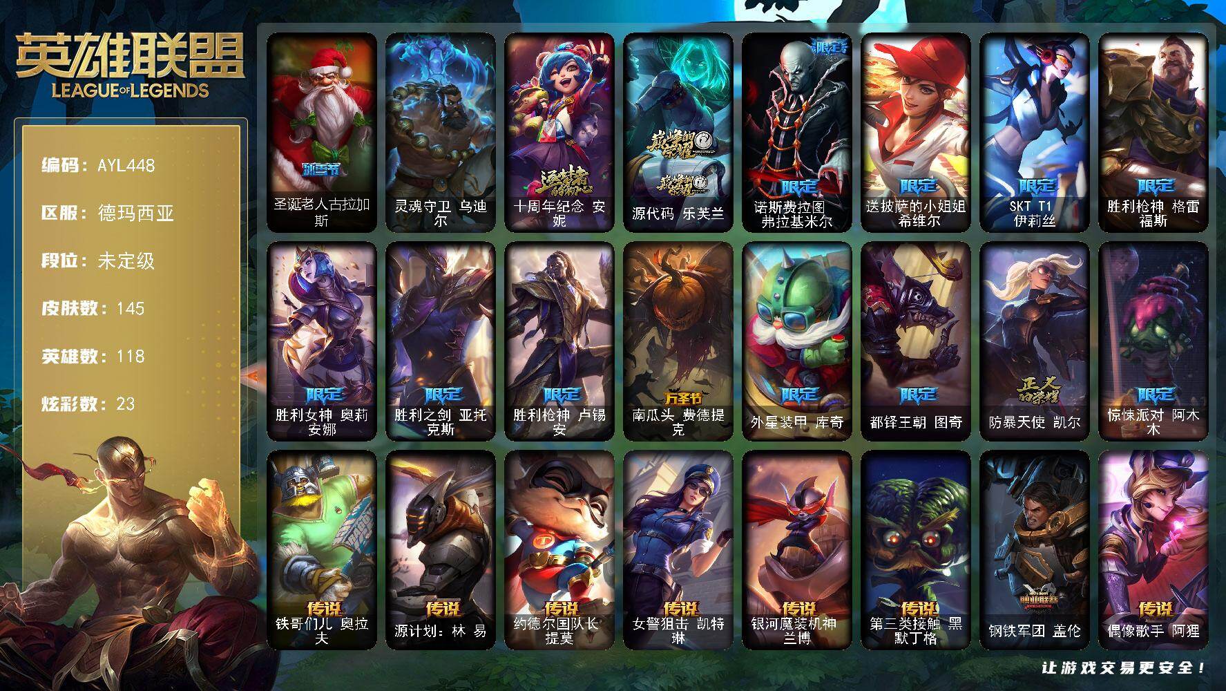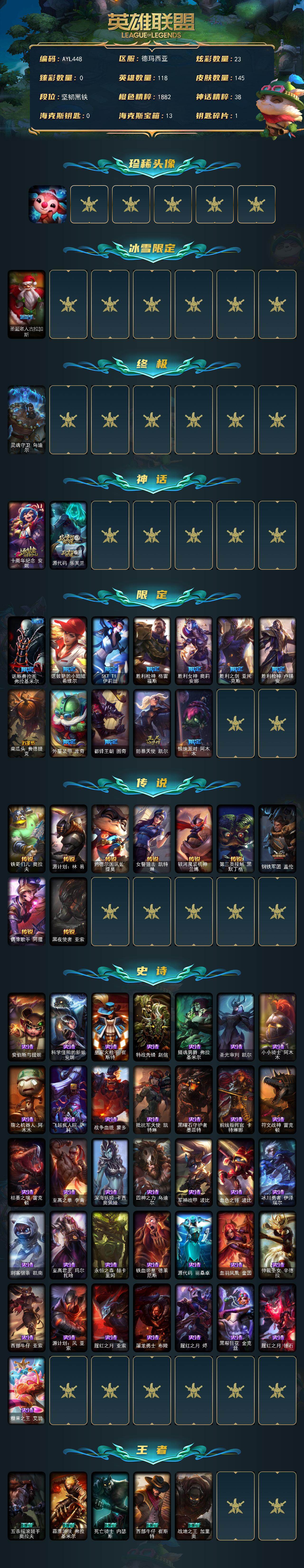 未定级段位-118英雄-145皮肤-23炫彩-1终极-2神话-13限定-9传说-36史诗
